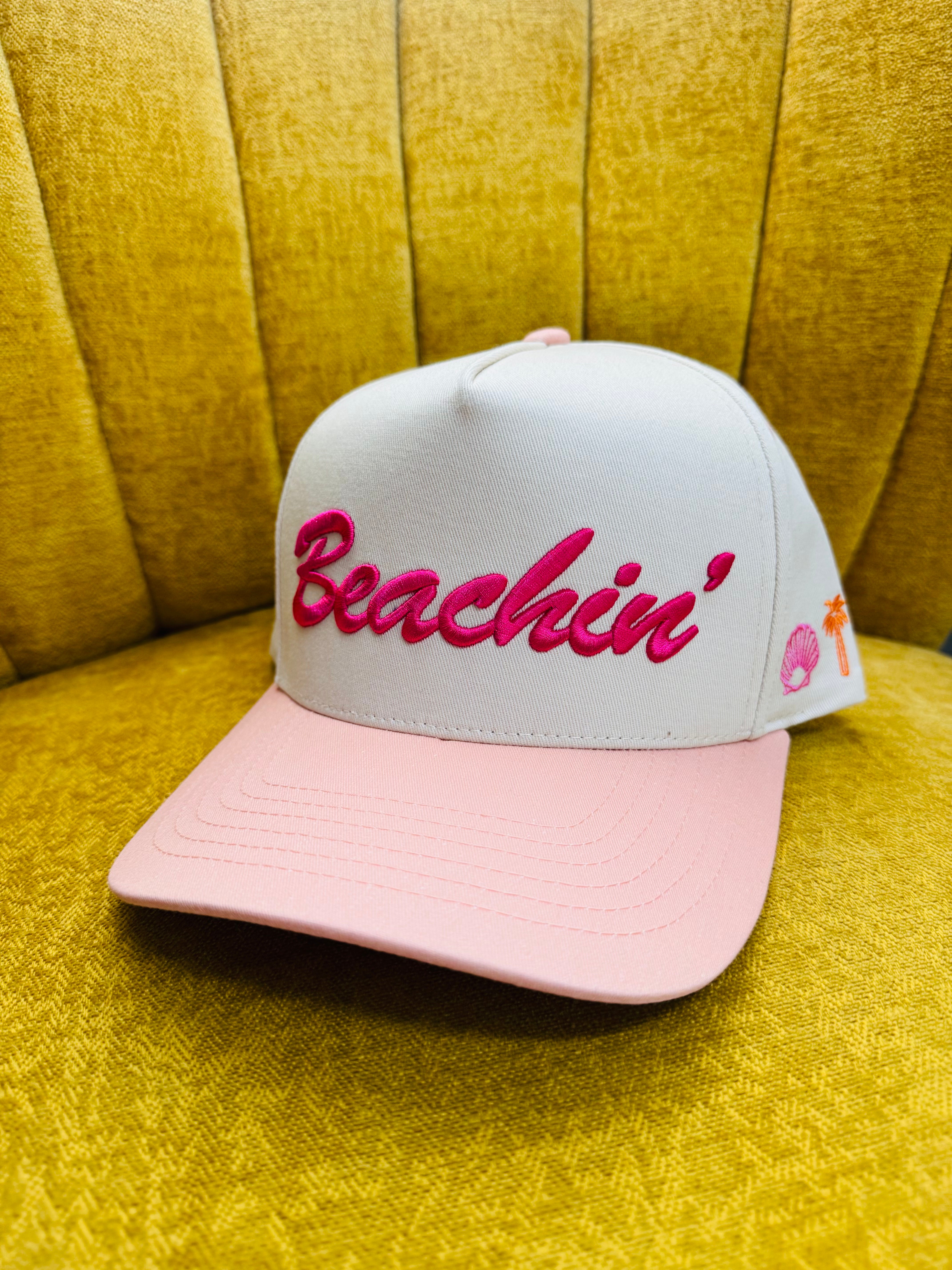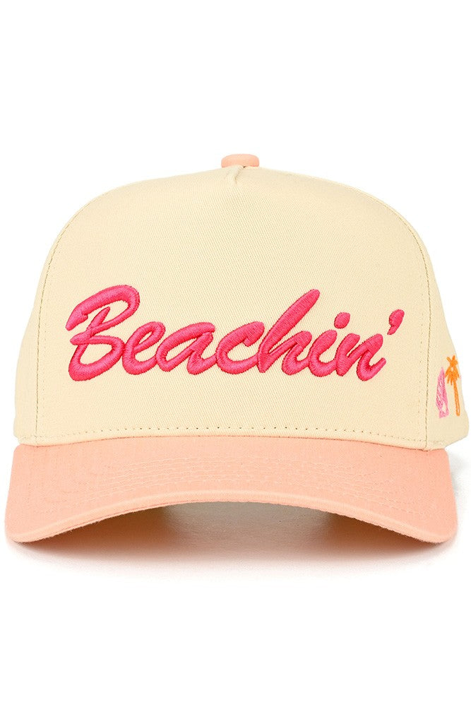 Fun, bright, and made for sunny days — the Beachin’ Peach Hat is your go-to for all things summer. Featuring pink embroidered “BEACHIN’” lettering on a soft peach bill, it’s the perfect mix of playful and coastal.