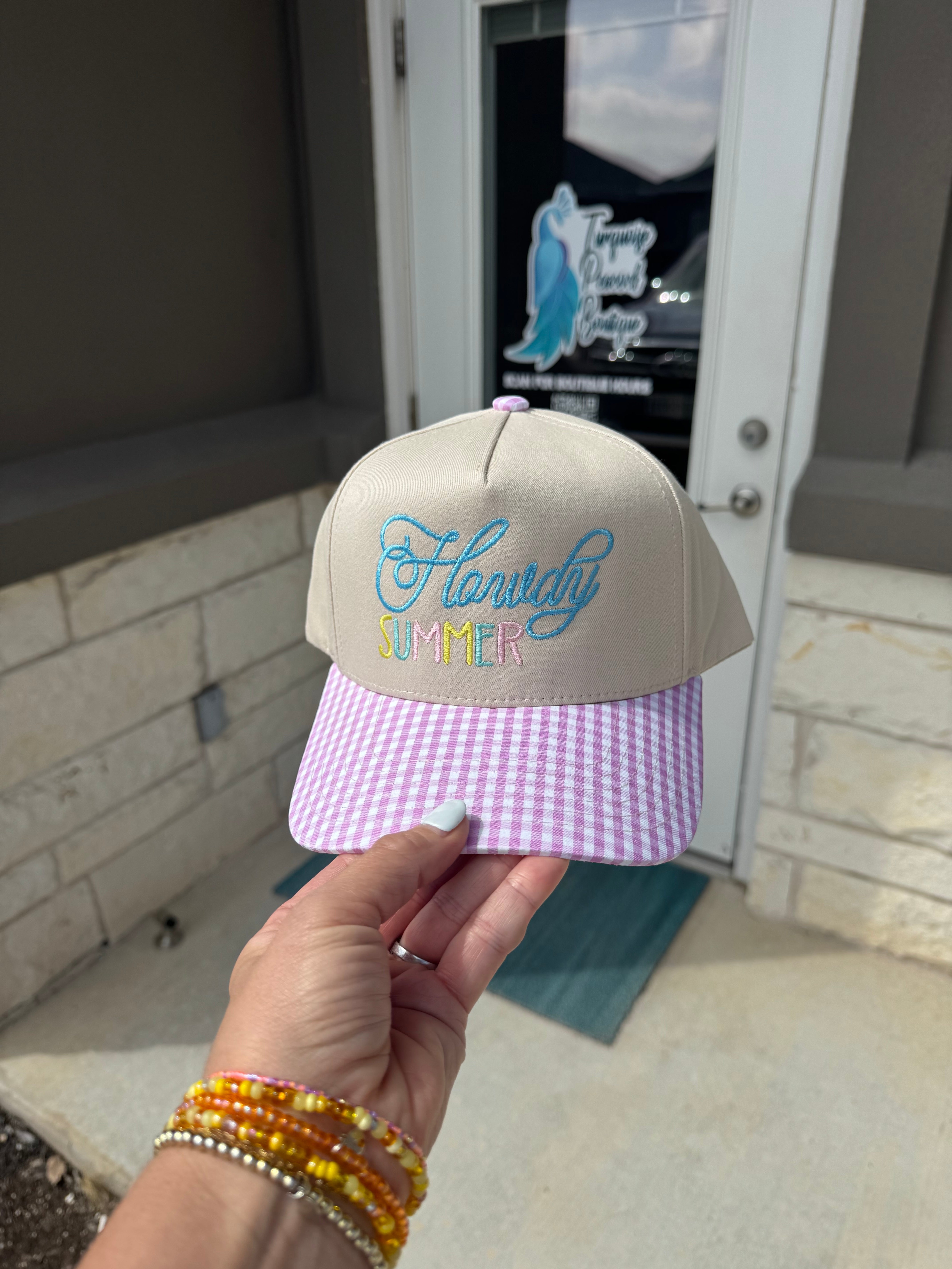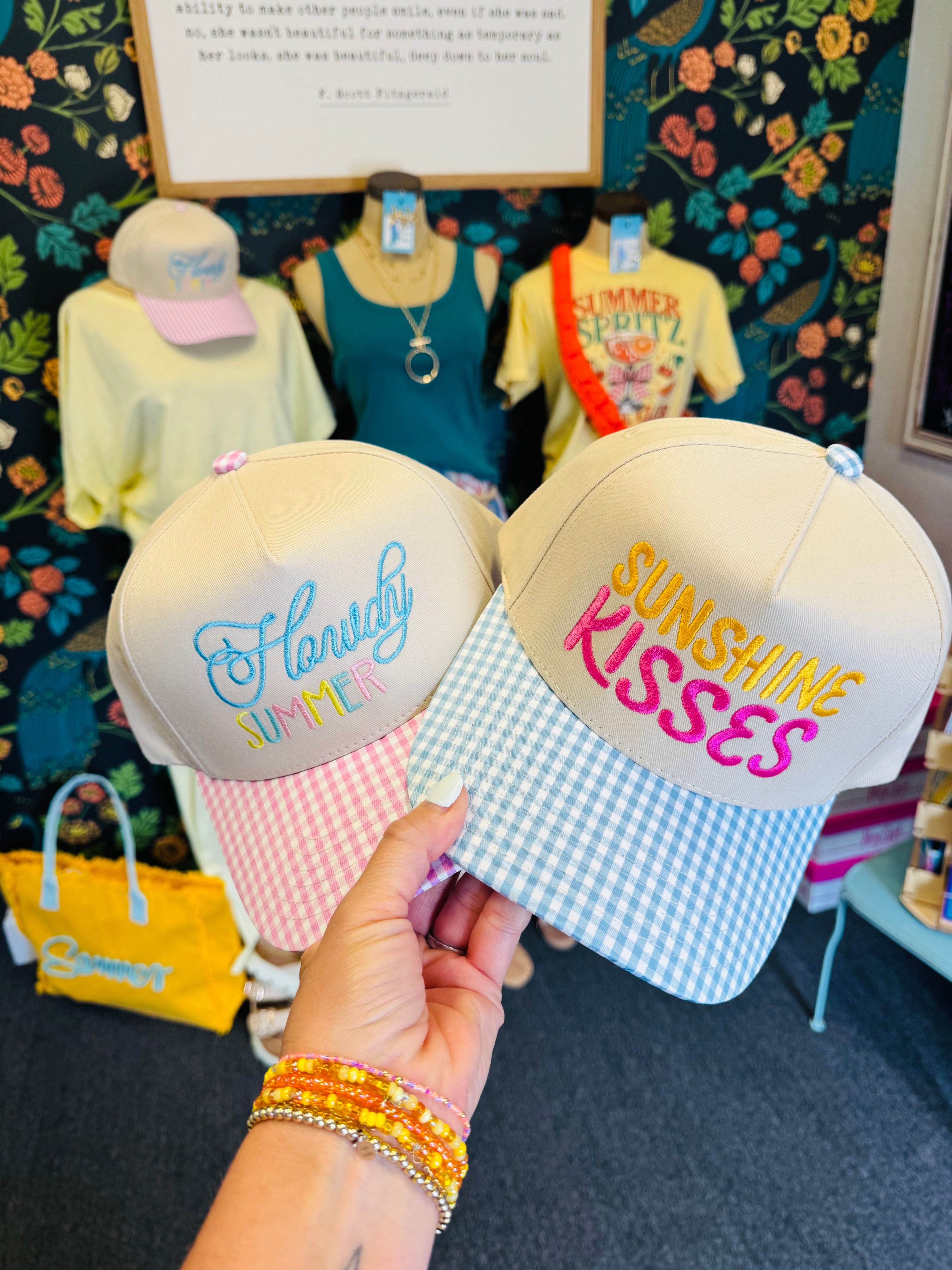 Say hello to sunny days in style- The Howdy Summer Striped Hat features cheerful pastel embroidery paired with a playful pink gingham brim for the ultimate warm-weather statement.