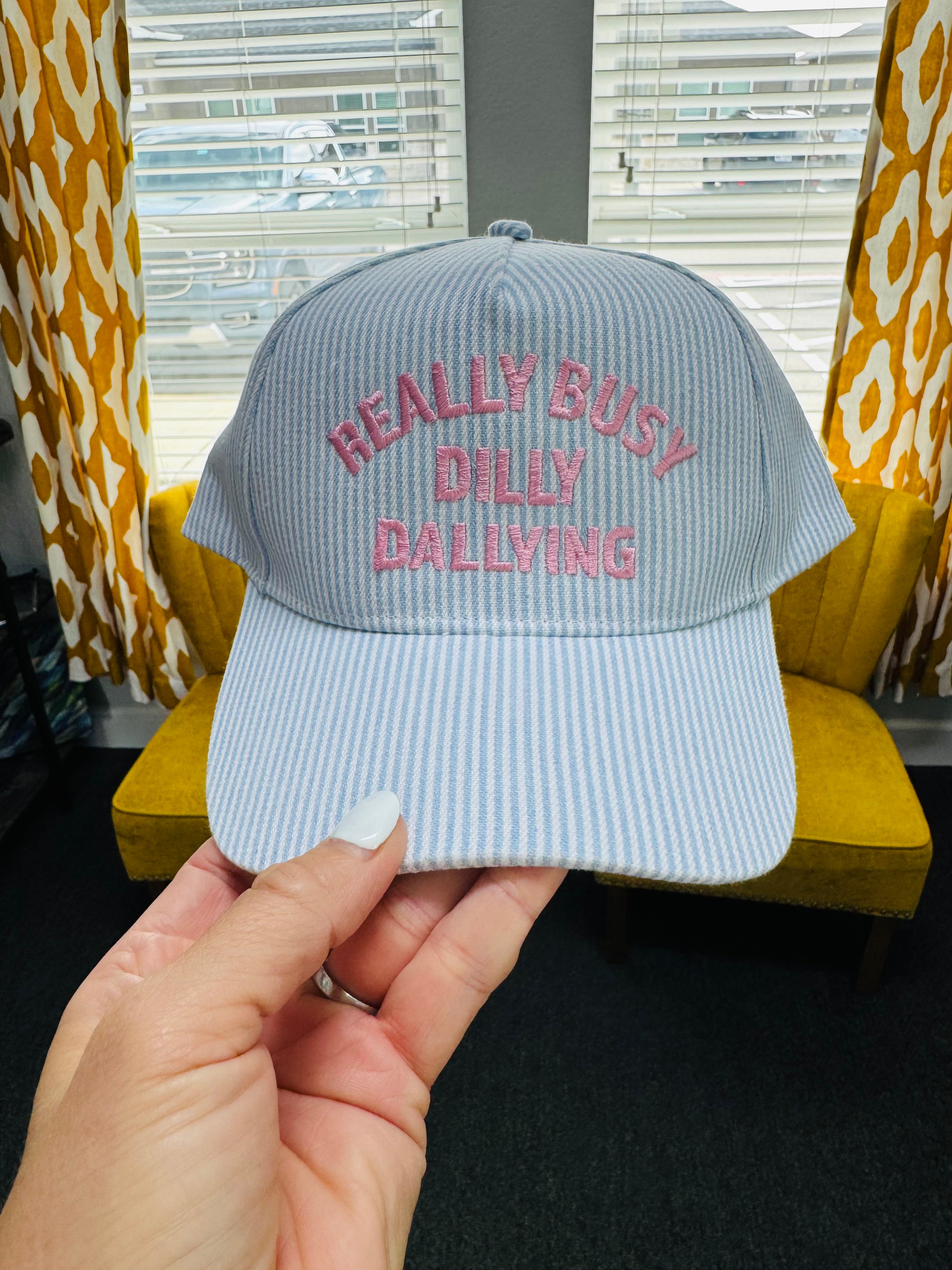 For the days when you’ve got nothing to do… and you’re doing it well. The Really Busy Dilly Dallying Hat brings the perfect mix of charm and personality with playful pink embroidery on a classic blue stripe seersucker design.