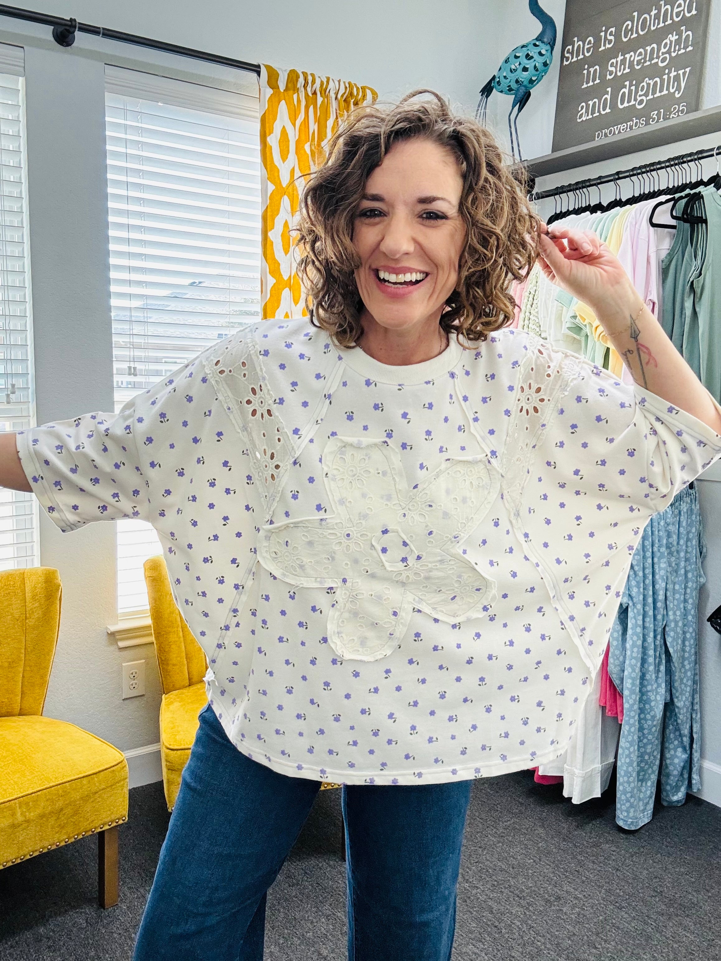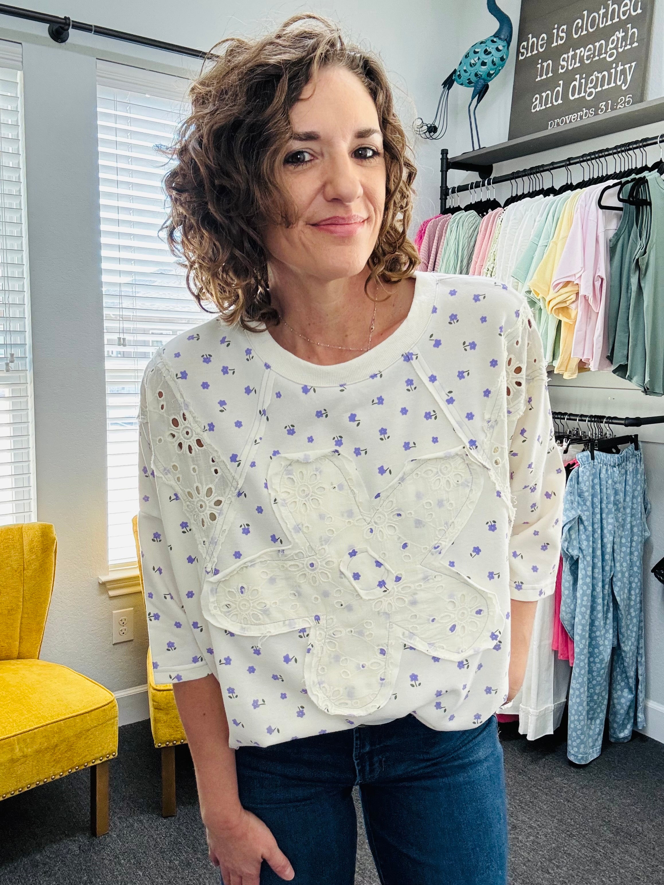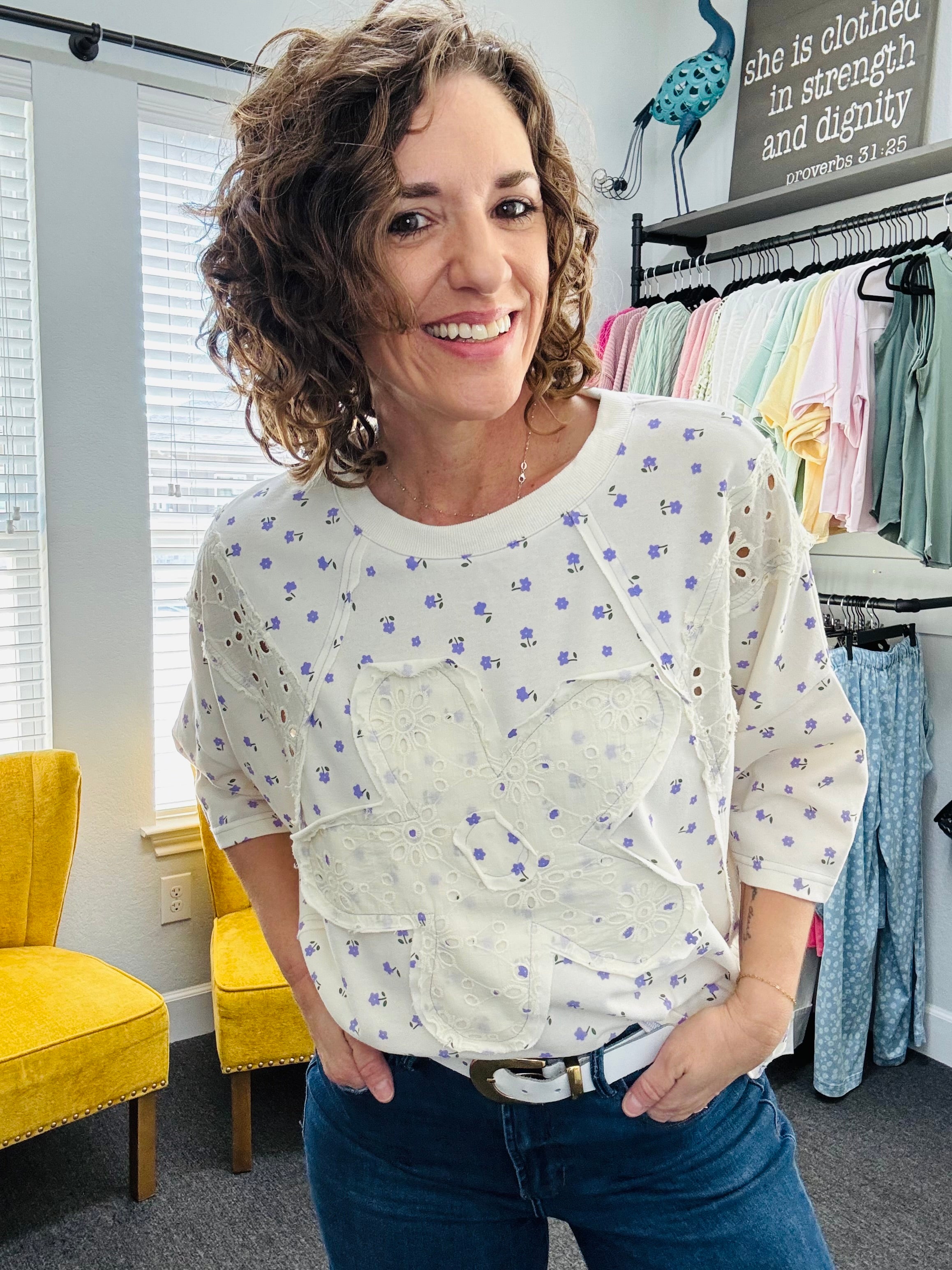 Soft, sweet, and full of charm — this washed terry oversized top is the perfect blend of comfort and feminine detail. Designed with a relaxed, boxy silhouette, slightly dropped shoulders, and half sleeves, it gives you that effortless, easygoing fit you’ll love. A delicate all-over small purple floral print adds a soft pop of color, while the ivory lace overlay daisy patch on the front makes it truly stand out. Pair it with your favorite denim jeans or shorts for a look that’s playful, pretty, and perfectly boutique-ready.