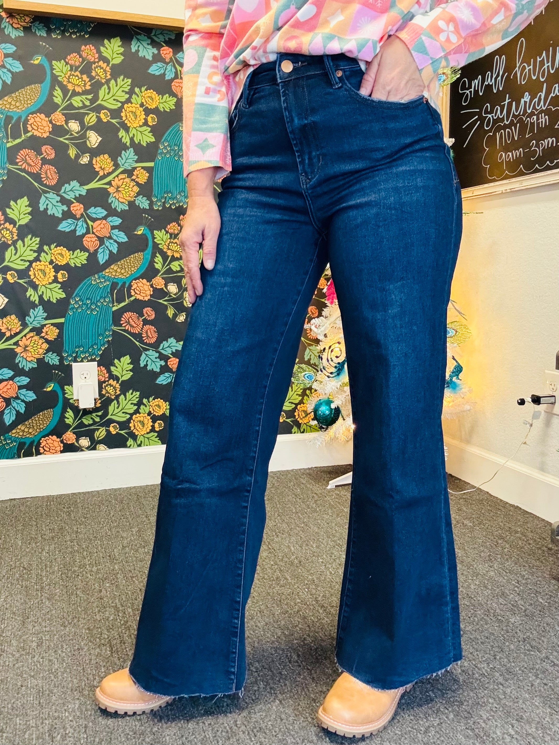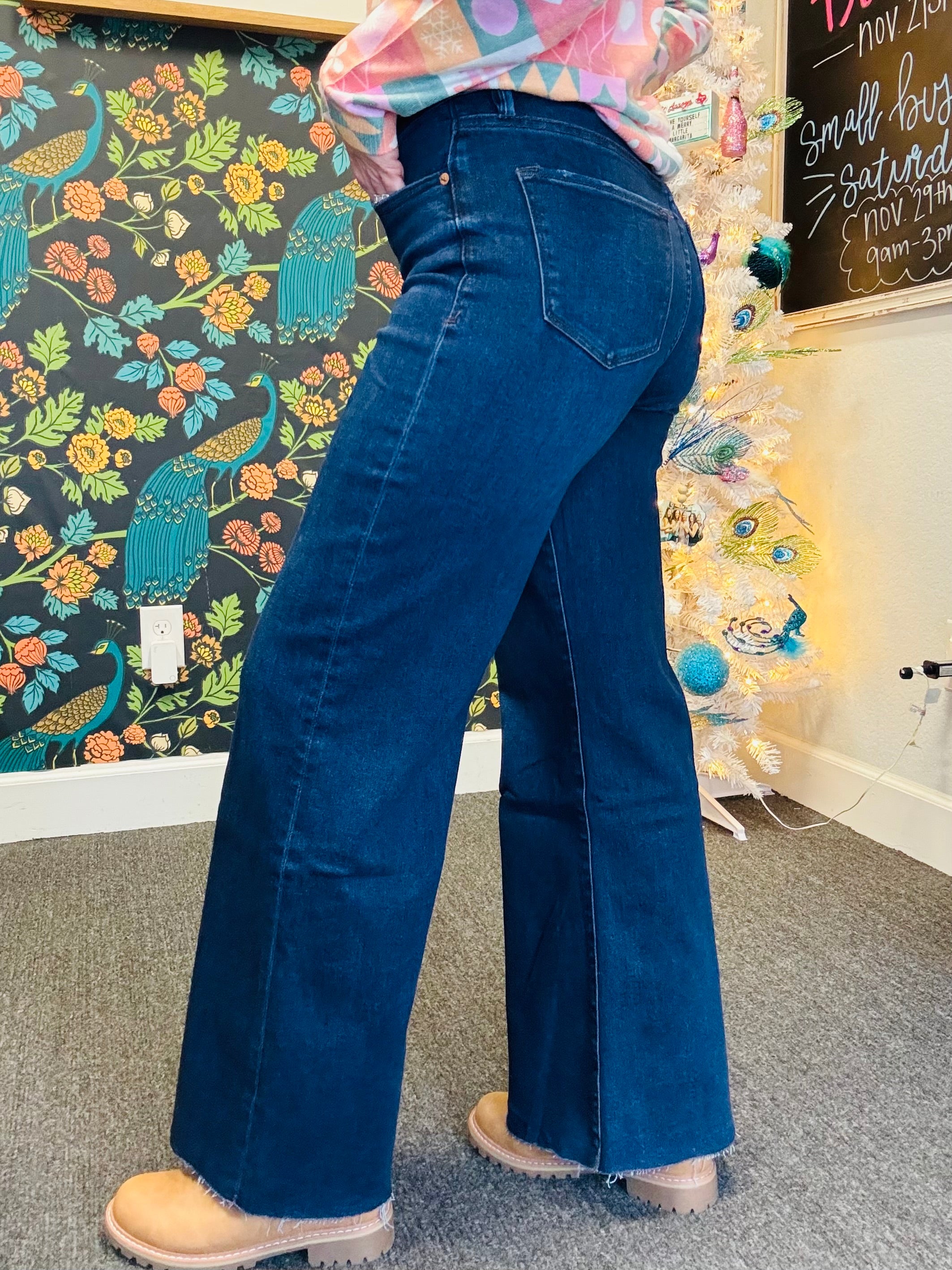 Meet the Dark Knight Fiona Jeans by Dear John—a favorite fit for so many! These wide-leg jeans in a rich Dark Knight wash combine sophistication with modern edge. Featuring a high-rise cut-off hem, they offer a sleek, flattering silhouette with a raw edge hem that adds just the right amount of attitude to classic tailoring.