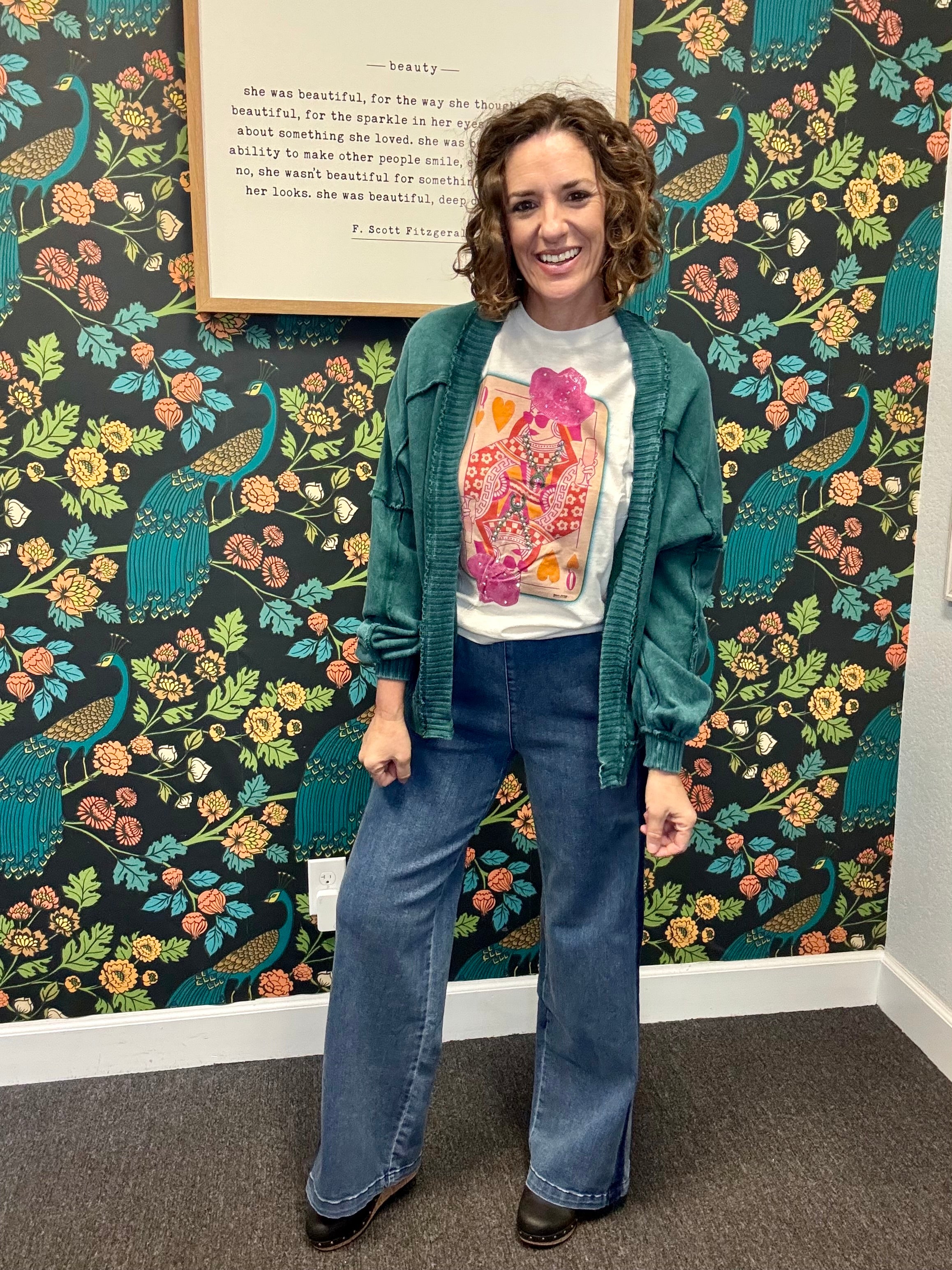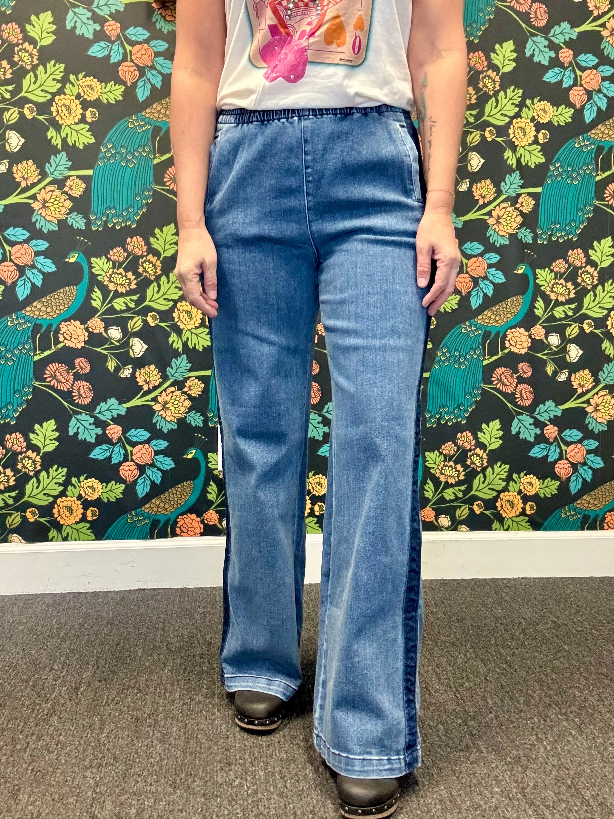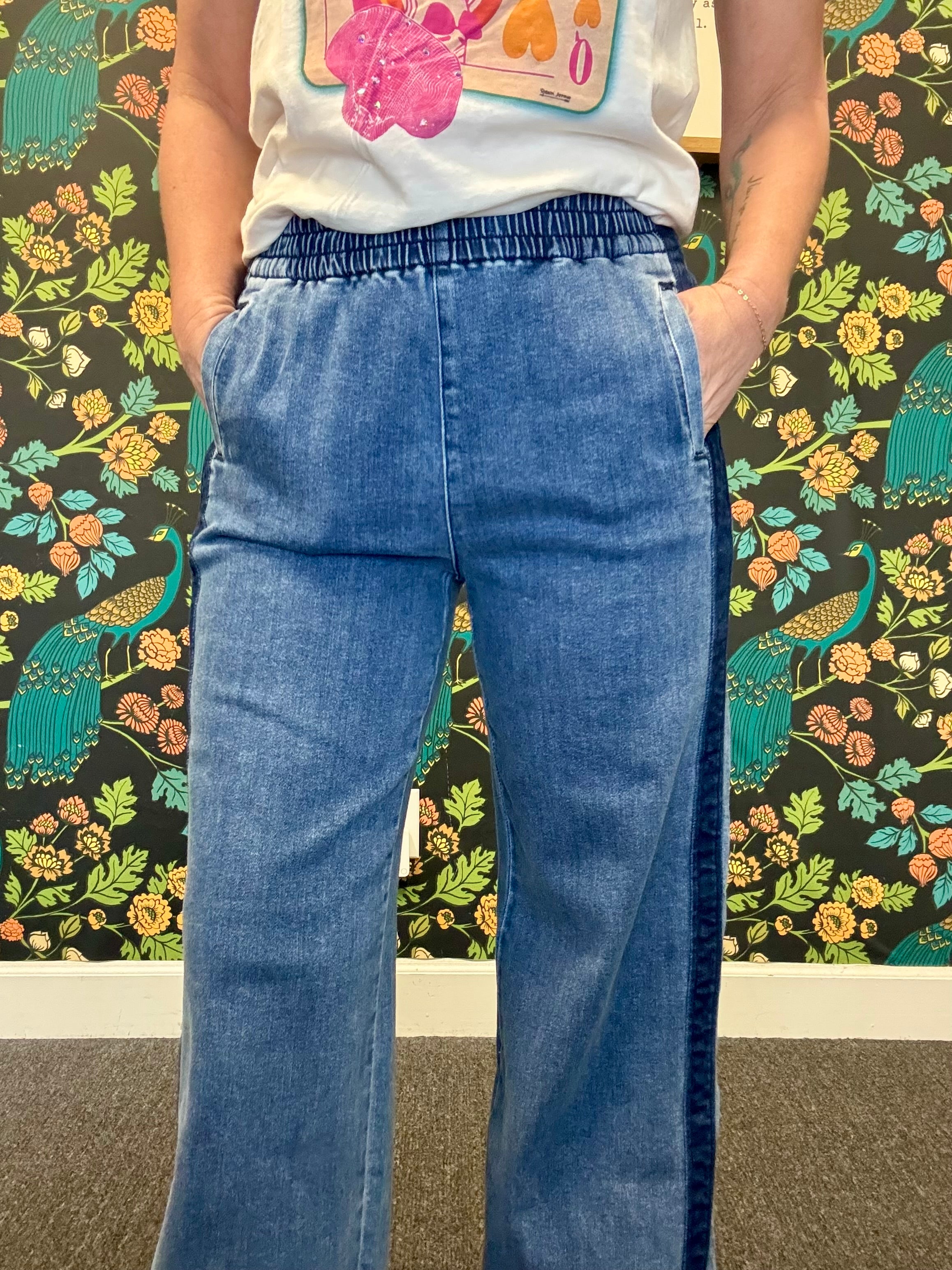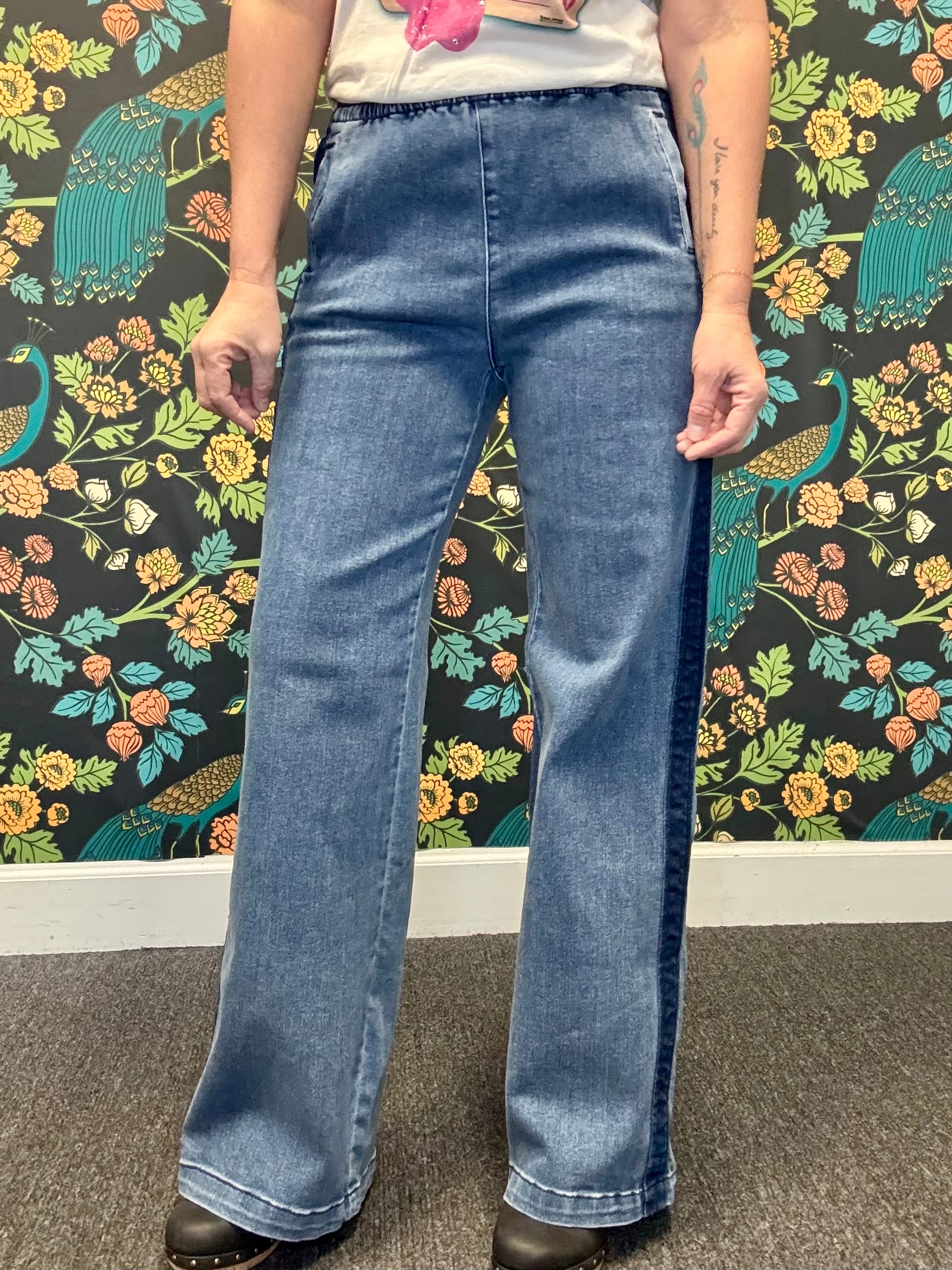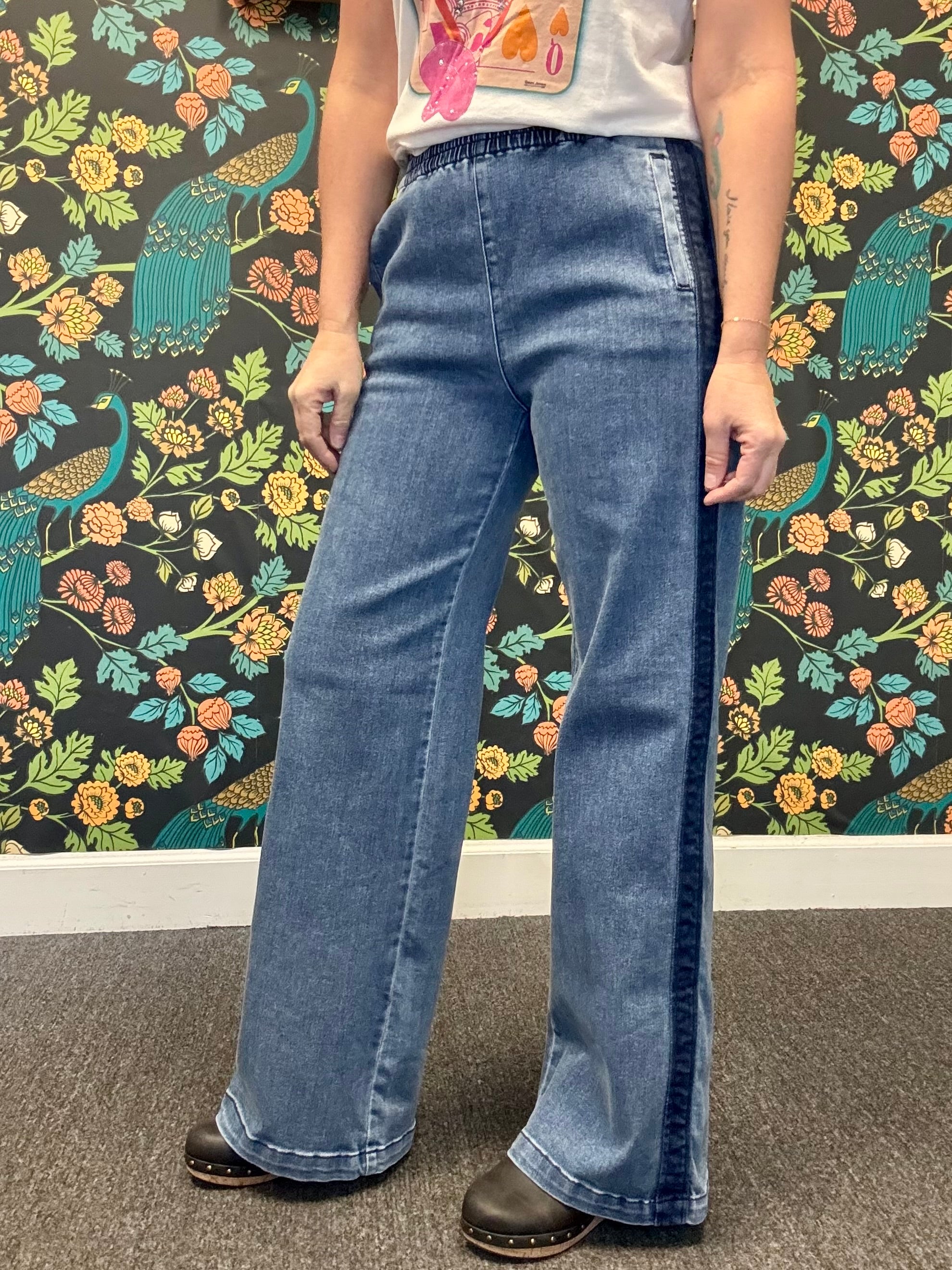 Elevate your everyday denim with our Denim Horizon Wide Leg Jeans. The high rise and wide-leg silhouette create a flattering, on-trend shape, while the elastic-banded side seam adds a touch of unique detail. A darker stripe down each leg gives a subtle, modern edge, making these jeans perfect for dressing up or down. With a 32" inseam, they’re ideal for any occasion—pair with sneakers for a casual look or heels for a chic night out.