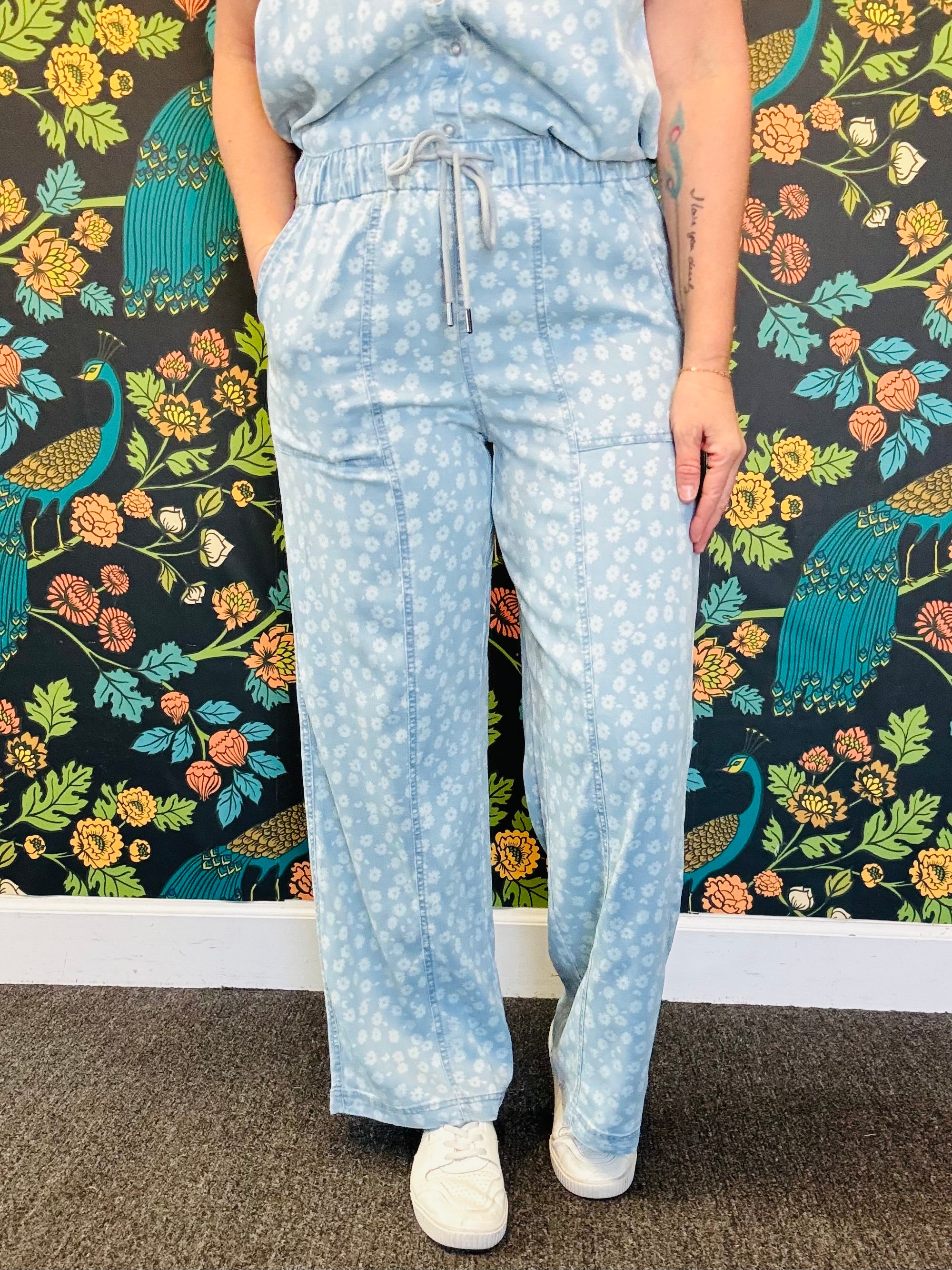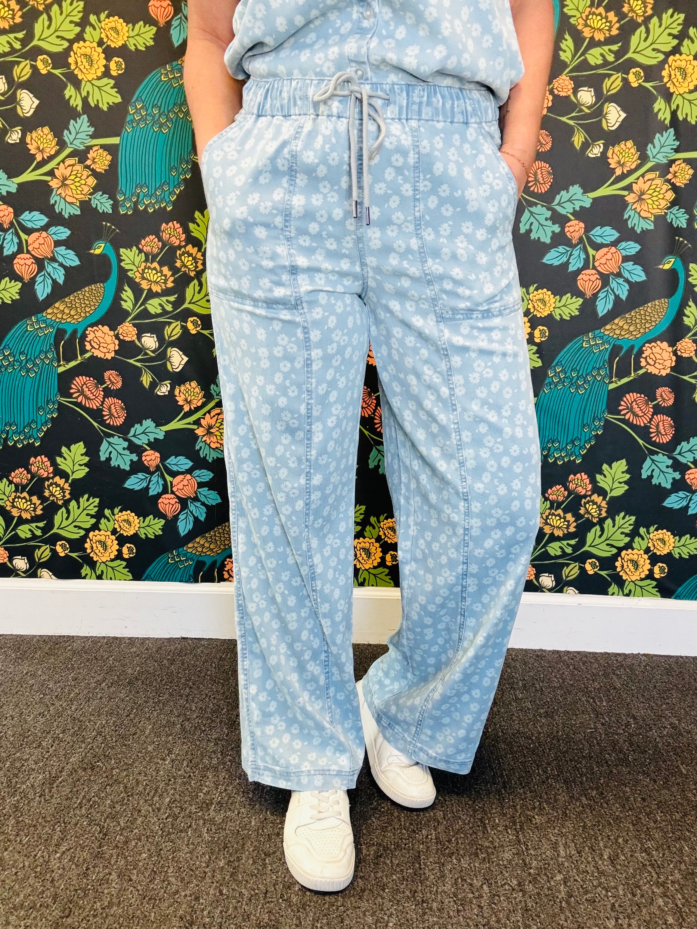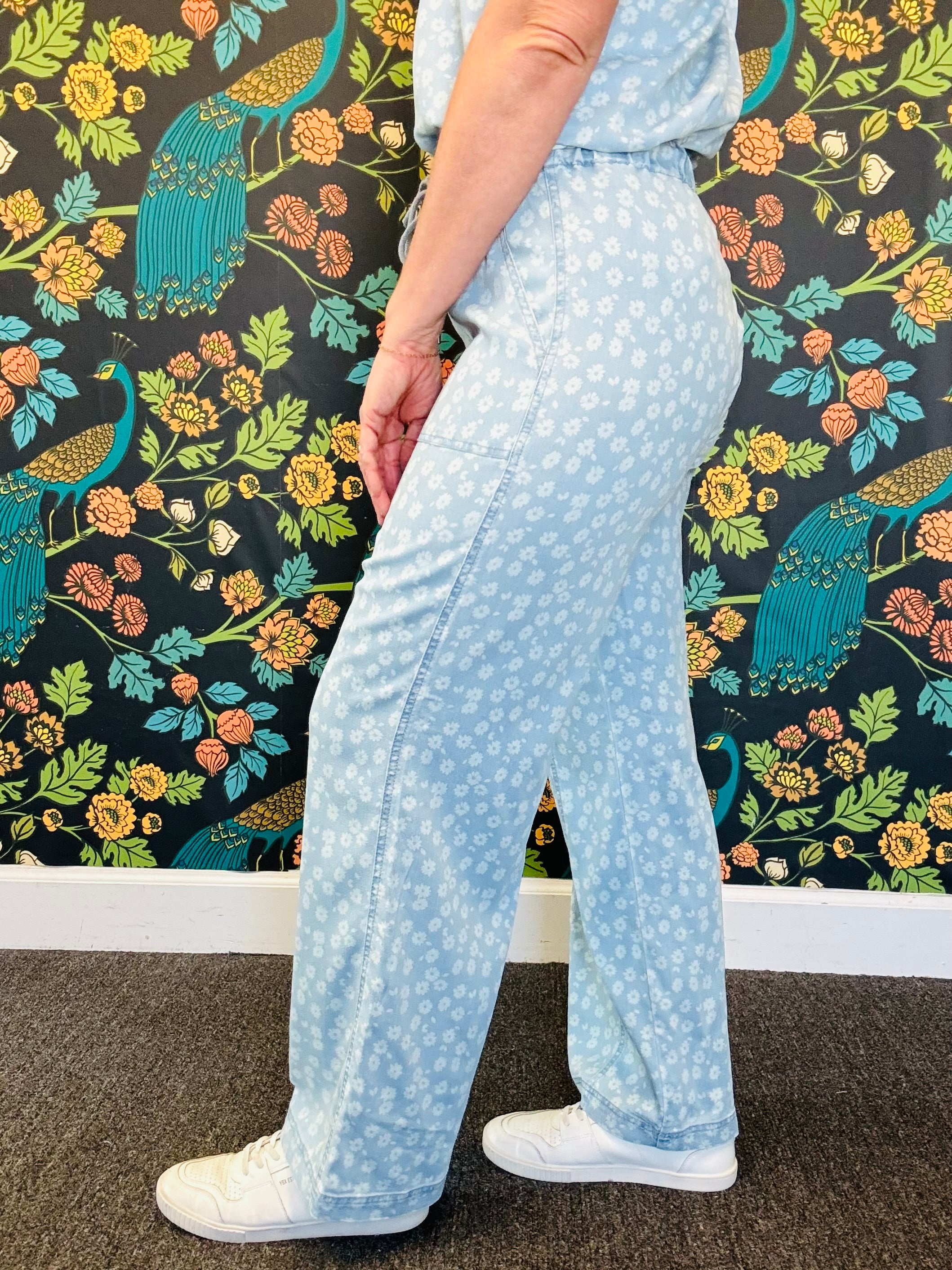 Meet the pants that blur the line between lounge and polished. The Triana Floral Pants are crafted from a super soft fabric blend with just a hint of stretch, giving you all-day comfort with a denim-inspired texture that elevates the look. Designed with an elasticized drawstring waistband, front patch pockets, and a flattering wide leg fit, these are the throw-on-and-go pants you’ll actually want to leave the house in.