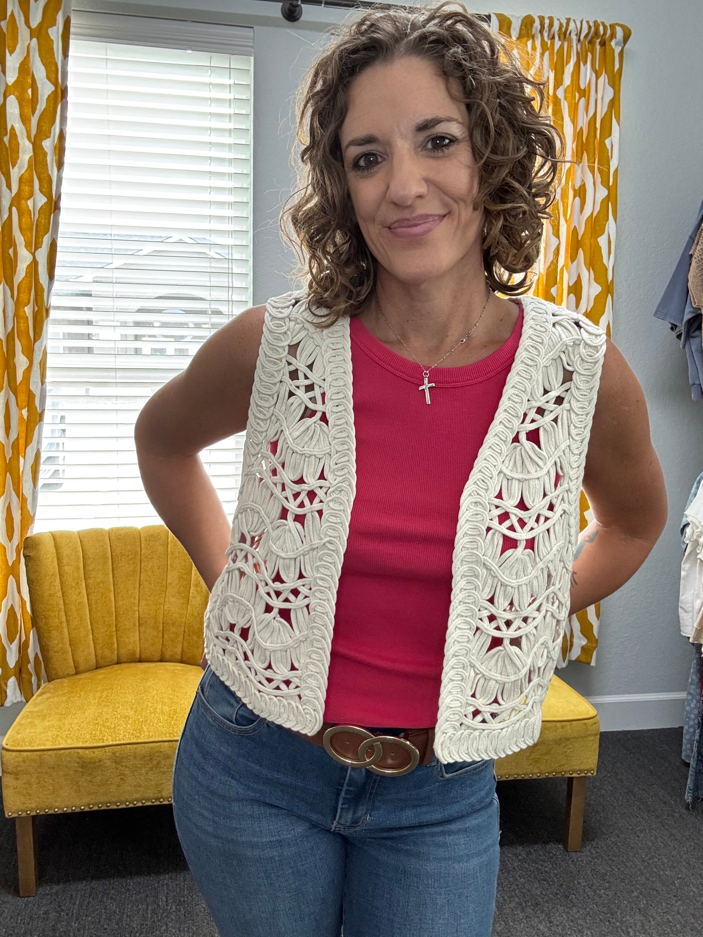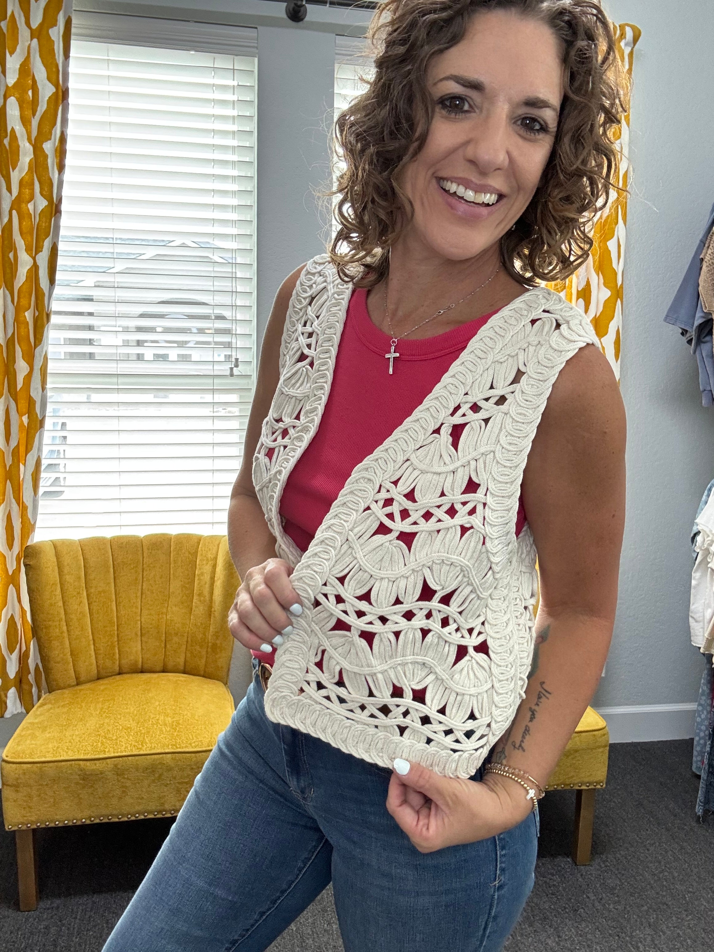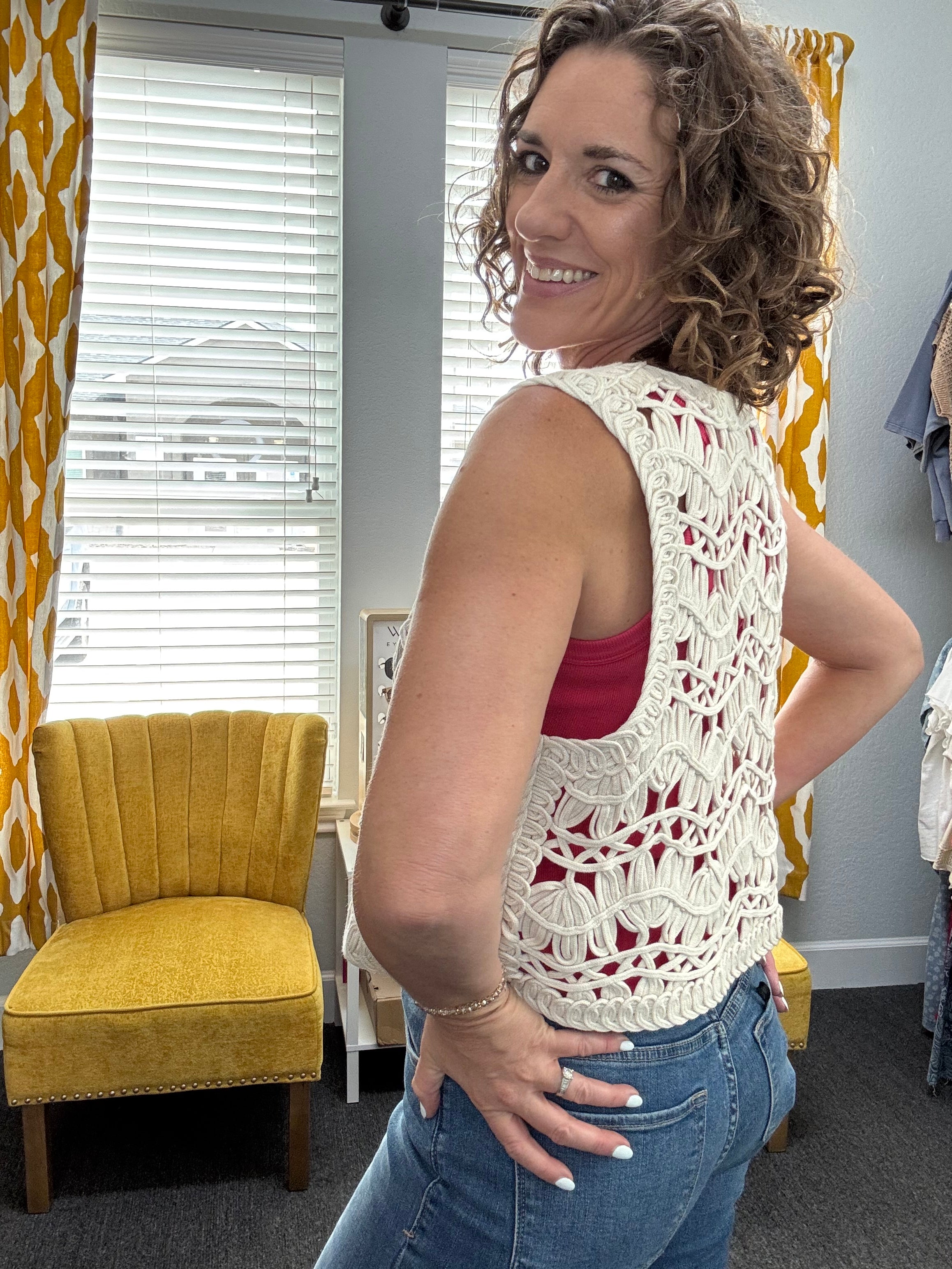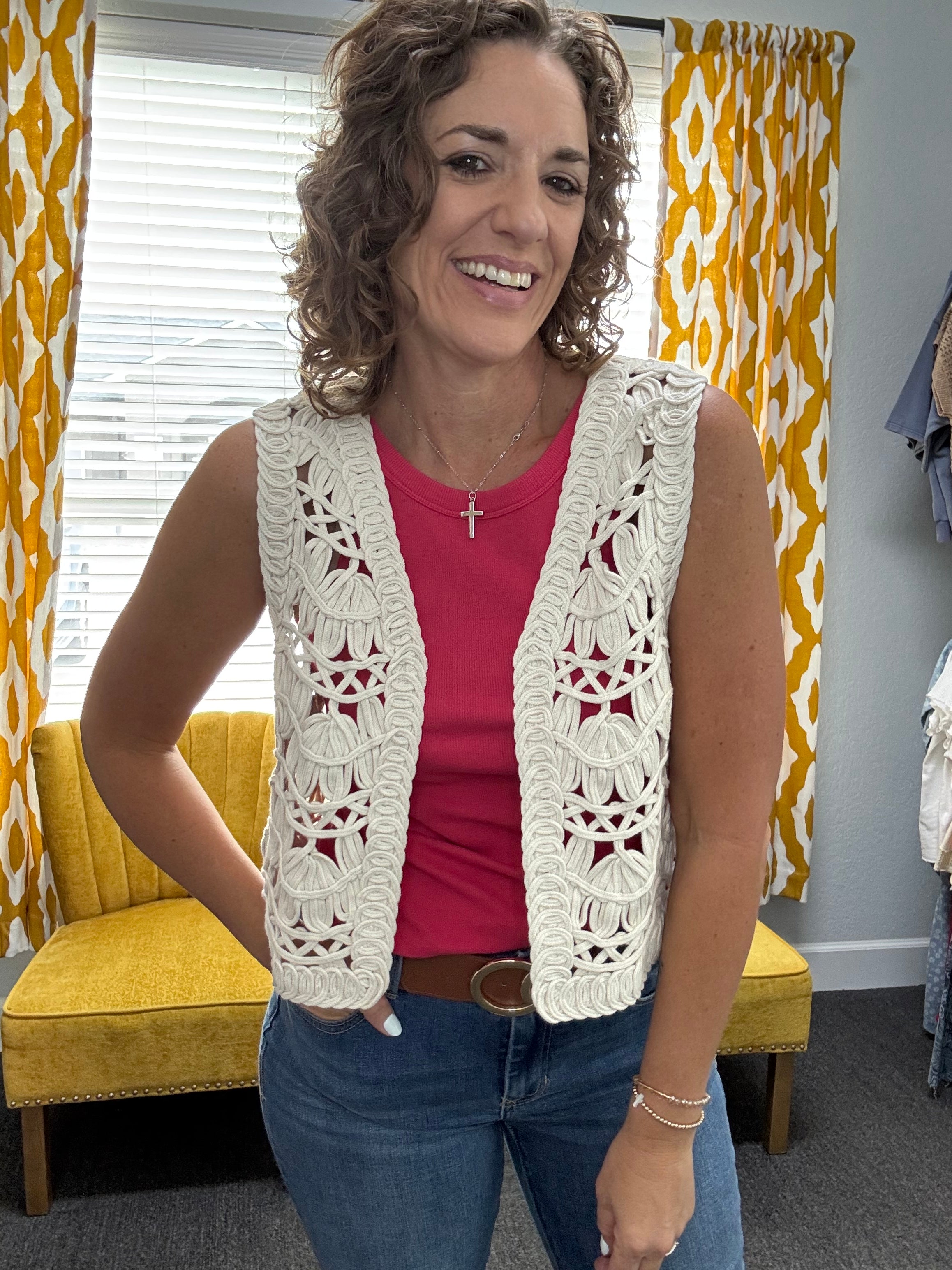 The Briza Crochet Vest features a delicate open-knit design that layers beautifully over your favorite tees, tanks, or even swim. Designed with a flattering cropped silhouette, this piece adds the perfect touch of texture while the vintage cream hue pairs seamlessly with everything in your closet. Perfect for beach days, casual outings, or adding a little charm to your everyday look.