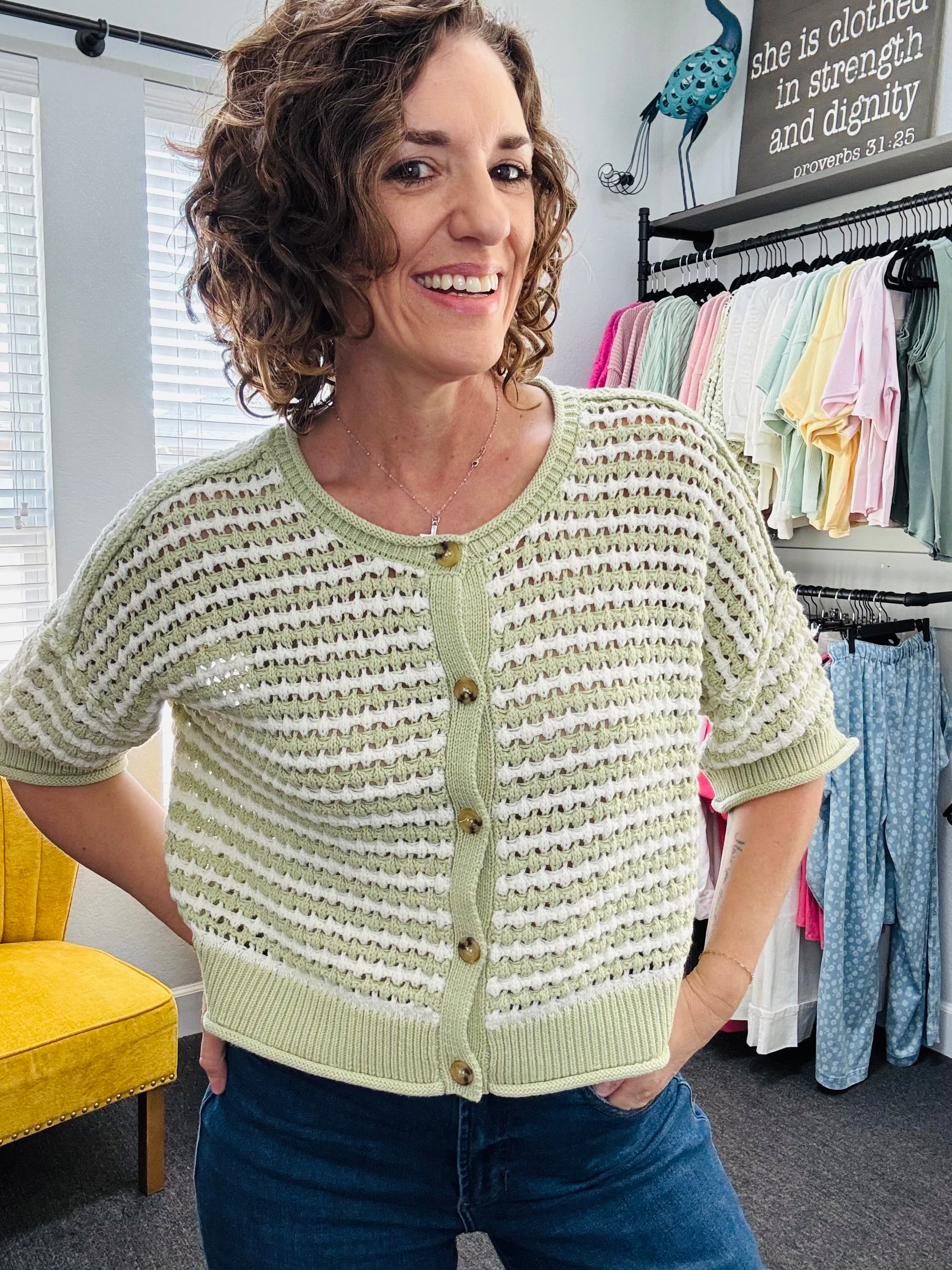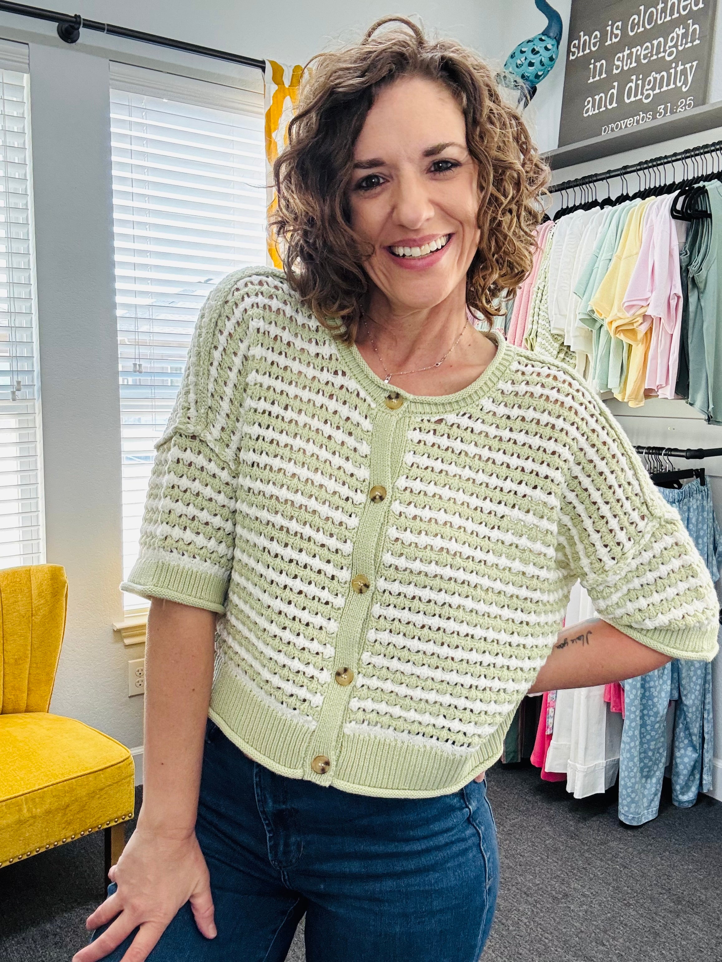 Fresh, light, and full of charm — this crochet button-up cardigan is a springtime staple you’ll reach for again and again. Featuring soft white and light green stripes, it brings an airy, cheerful touch to any outfit. Designed with intricate crochet detailing and short sleeves, it can be worn open over a tank for effortless layering or buttoned up for a polished, put-together look. Lightweight yet textured, it pairs beautifully with denim, skirts, or your favorite wide-leg jeans for a boutique-ready vibe.