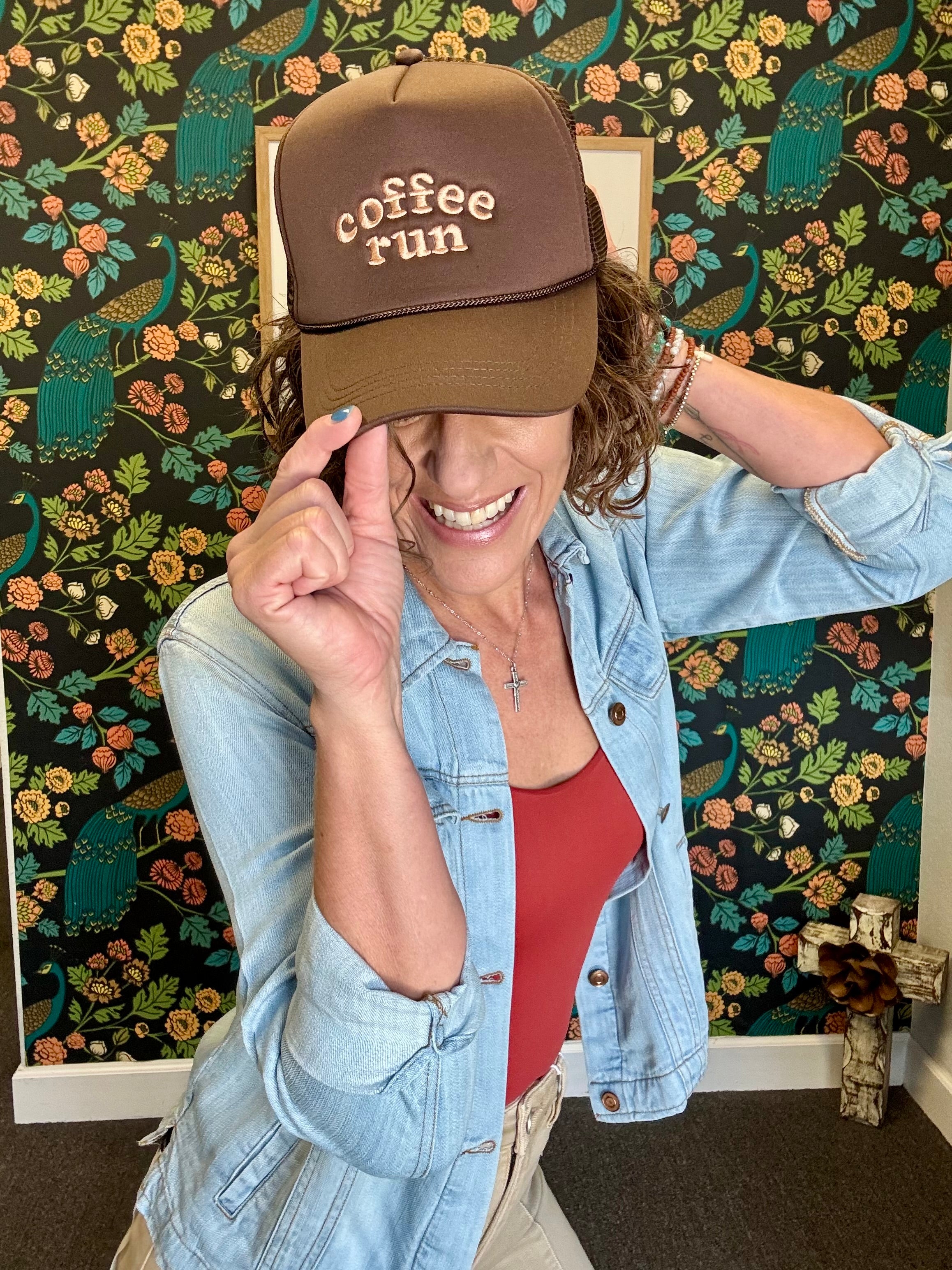 Stay stylish and caffeinated on the go with the Coffee Run Hat. This brown embroidered trucker cap adds a fun, casual vibe to your outfit while keeping the sun out of your eyes during those quick coffee stops. Perfect for anyone who loves a good brew and a playful accessory to match.