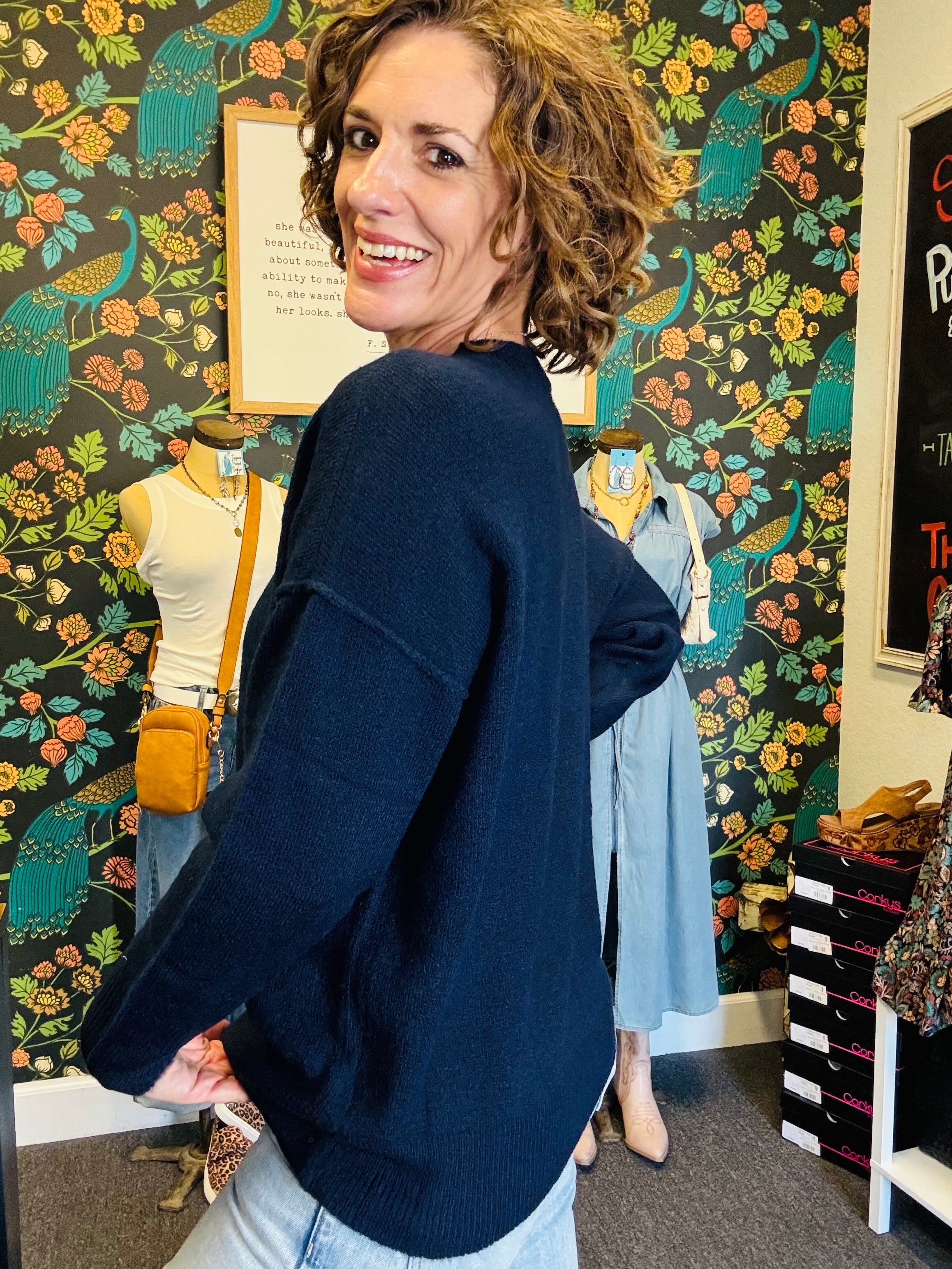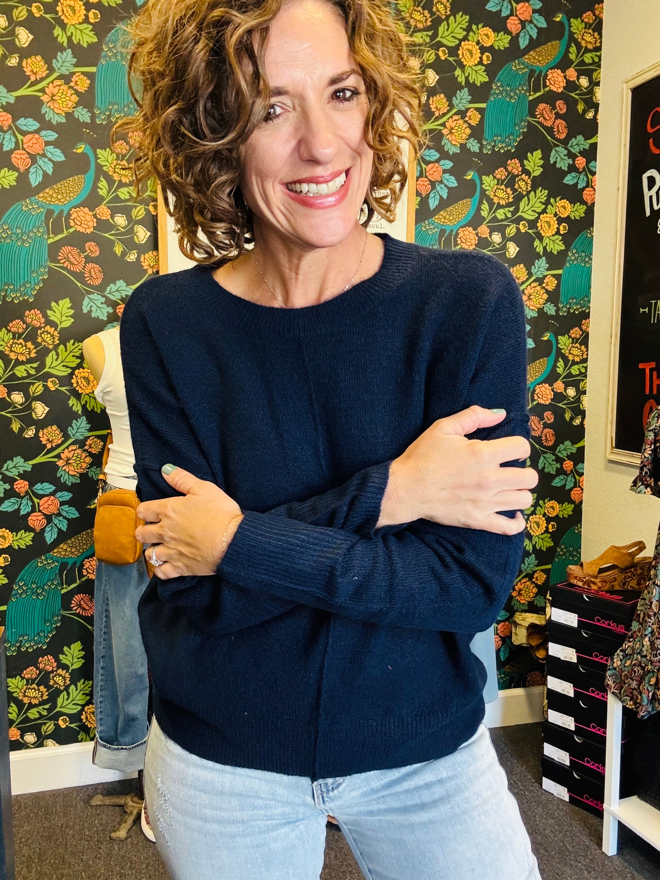 Your new go-to for effortless style and all-day comfort- our Navy Breeze Sweater . This lightweight, long-sleeve crewneck sweater is crafted from super-soft knit fabric, making it perfect for layering or wearing on its own. The subtle front seam detail adds a touch of modern flair, while the relaxed fit keeps it comfortable and versatile. Pair it with jeans, skirts, or your favorite fall layers for a look that’s easy, chic, and affordable.