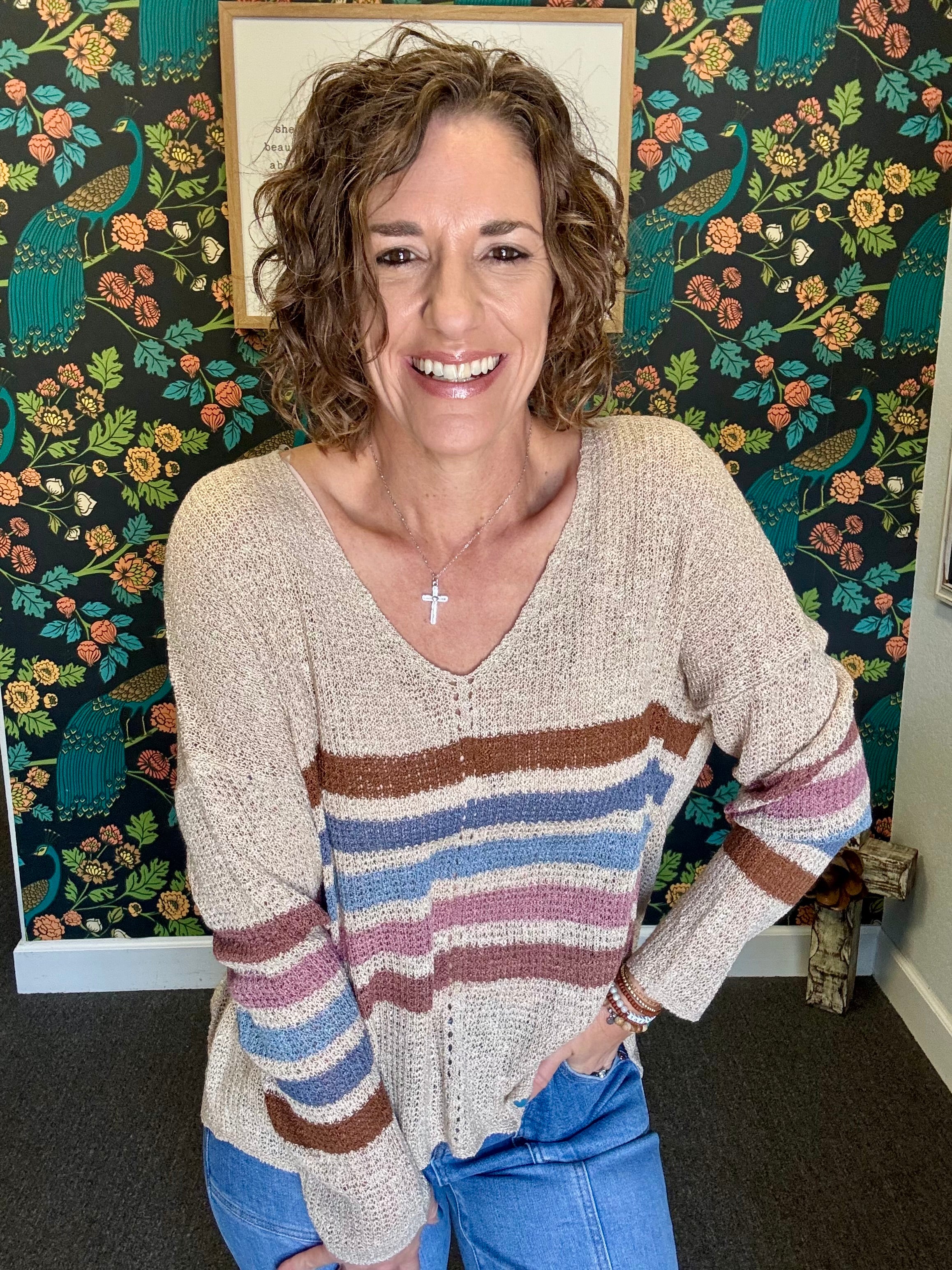 The Breezy Days Top is your perfect companion for crisp evenings—its breezy long sleeves and playful V-neck create effortless style. Layer it over one of our Chevron Crop Tops for a look that matches perfectly and keeps your outfit fresh and fun as the temperature drops.