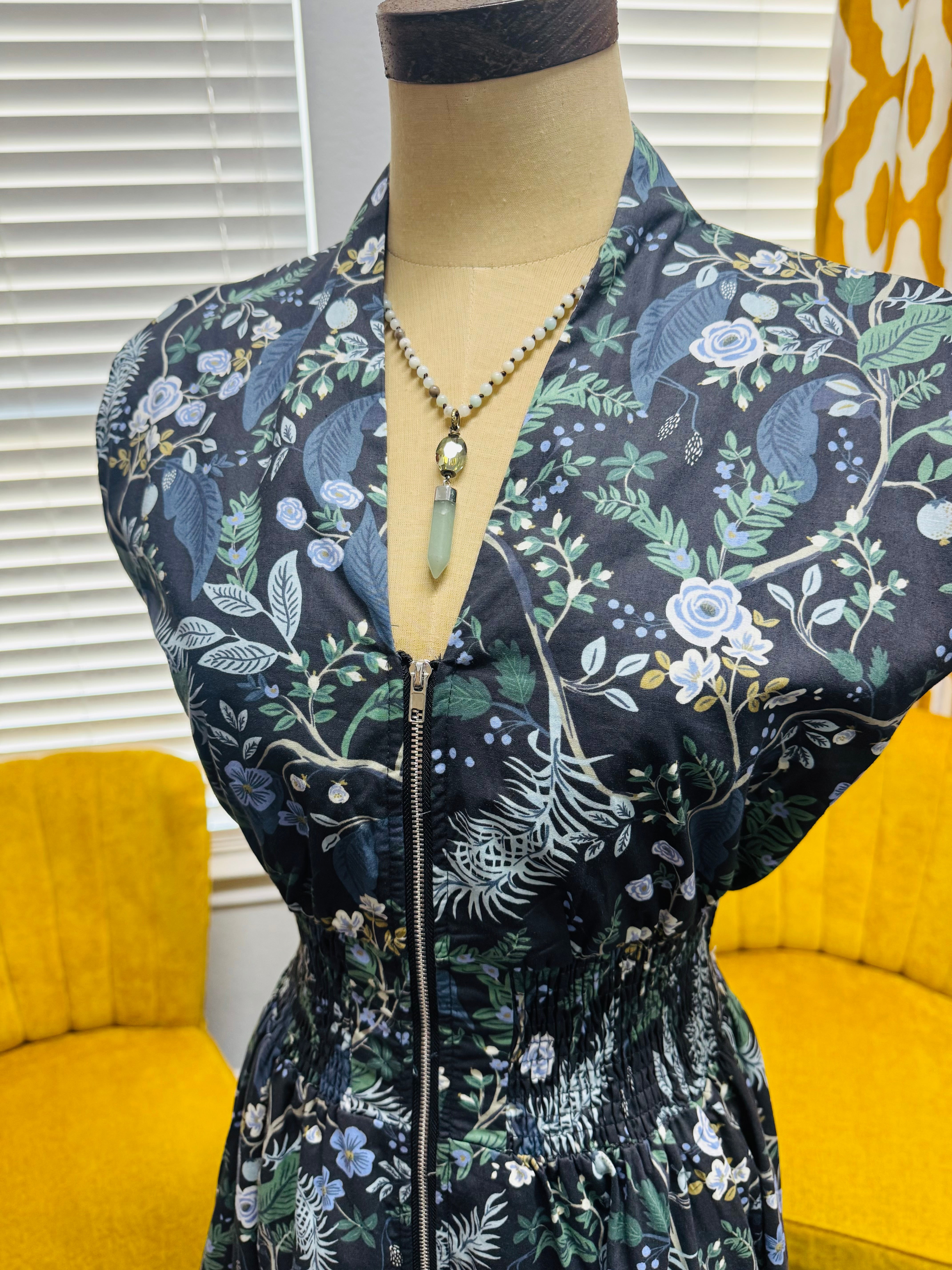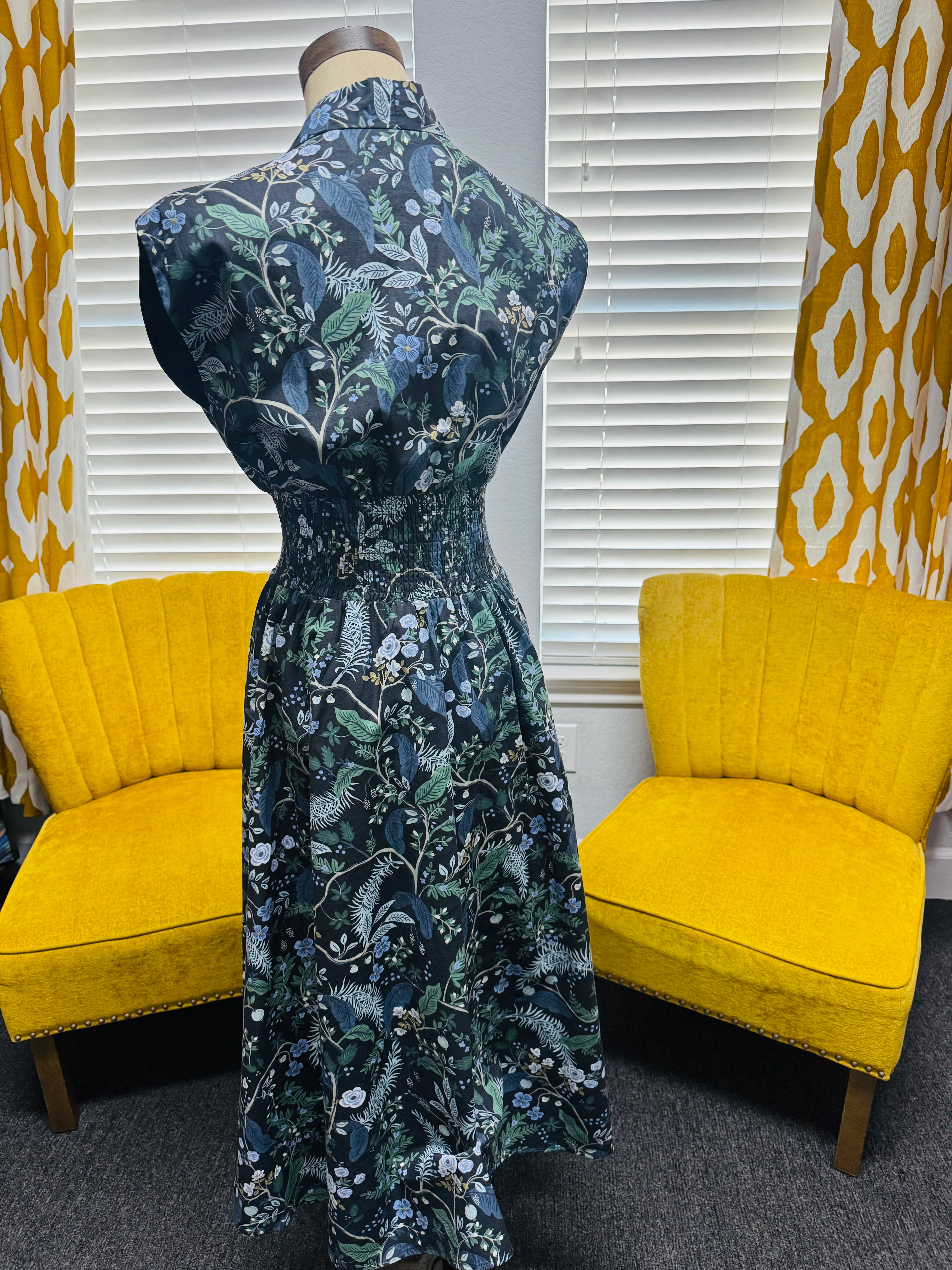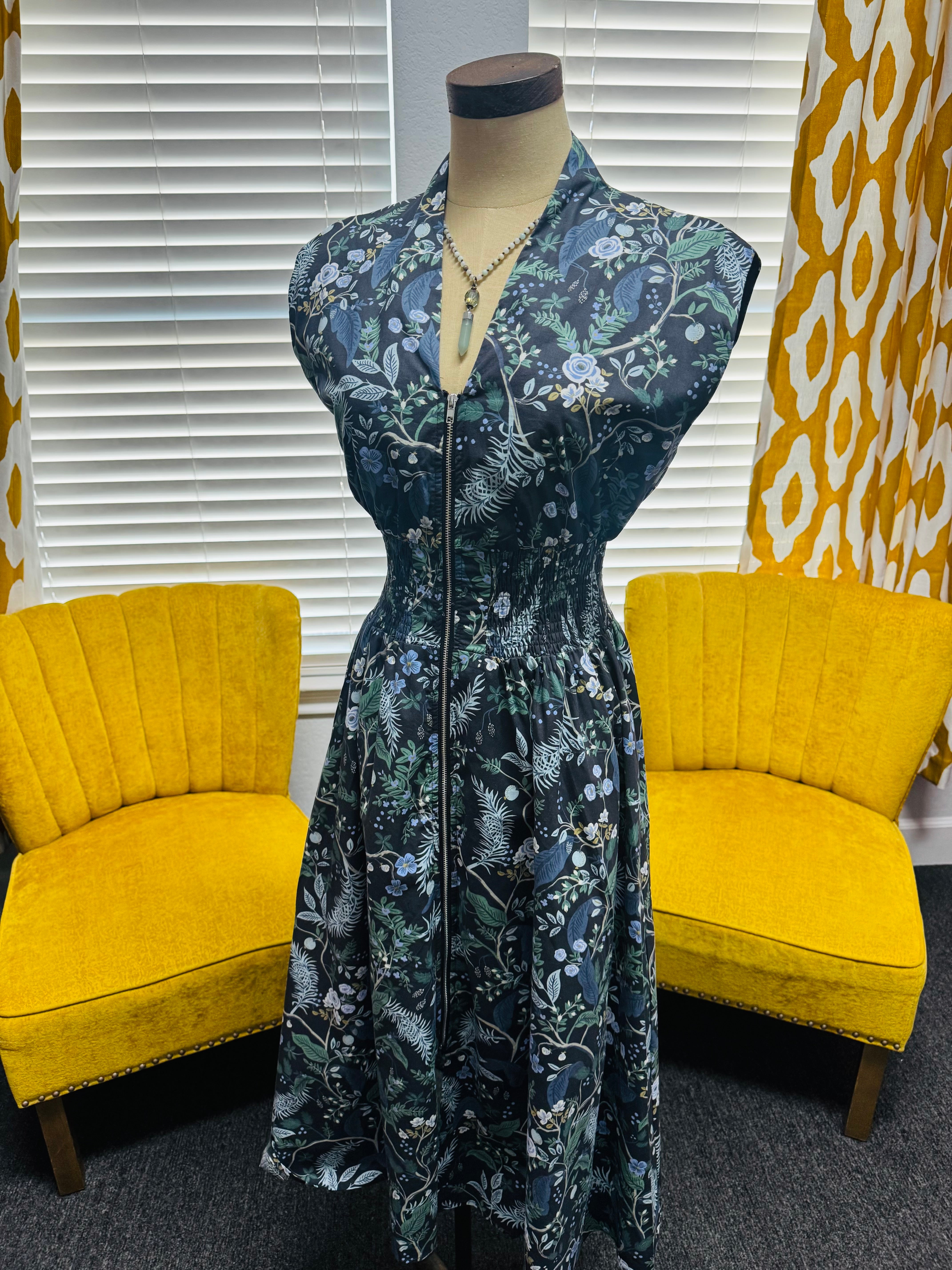 Step into spring with ease in the Breezy Garden Dress. Featuring a flattering smocked waist, drop shoulders, and a flowy midi silhouette, this dress combines comfort and style effortlessly. Functional front zip and pockets make it practical for everyday wear, while the navy-grey floral print keeps it fresh and versatile. Perfect for brunch, errands, or a spring stroll.