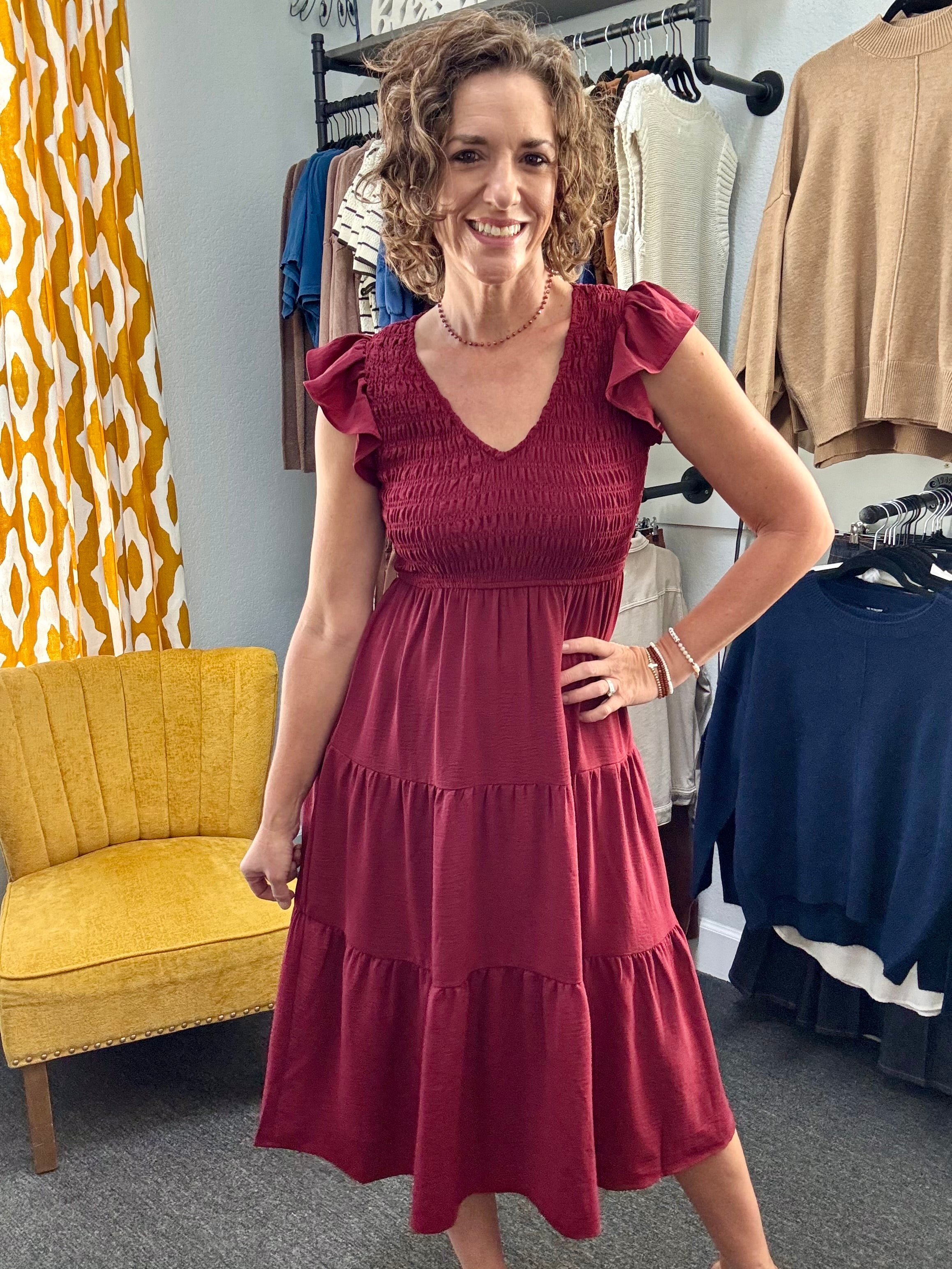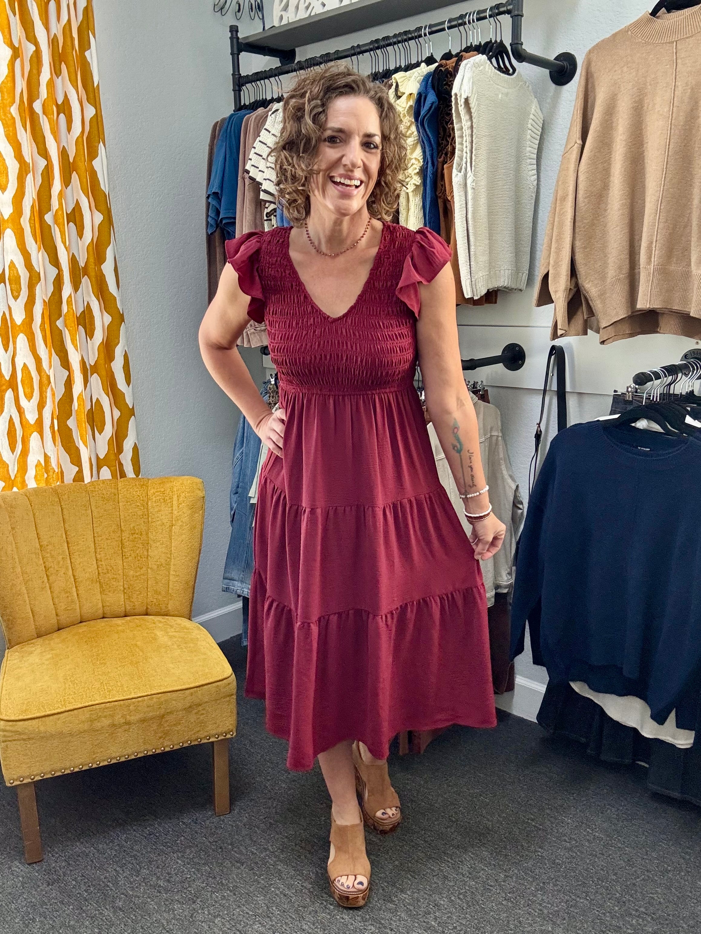 Effortless style meets everyday comfort in our Cranberry Bliss Dress. This lightweight, short-sleeve maxi features delicate flutter sleeves and a flowy silhouette. Affordable, easy, and endlessly versatile — your new go-to dress for any season.