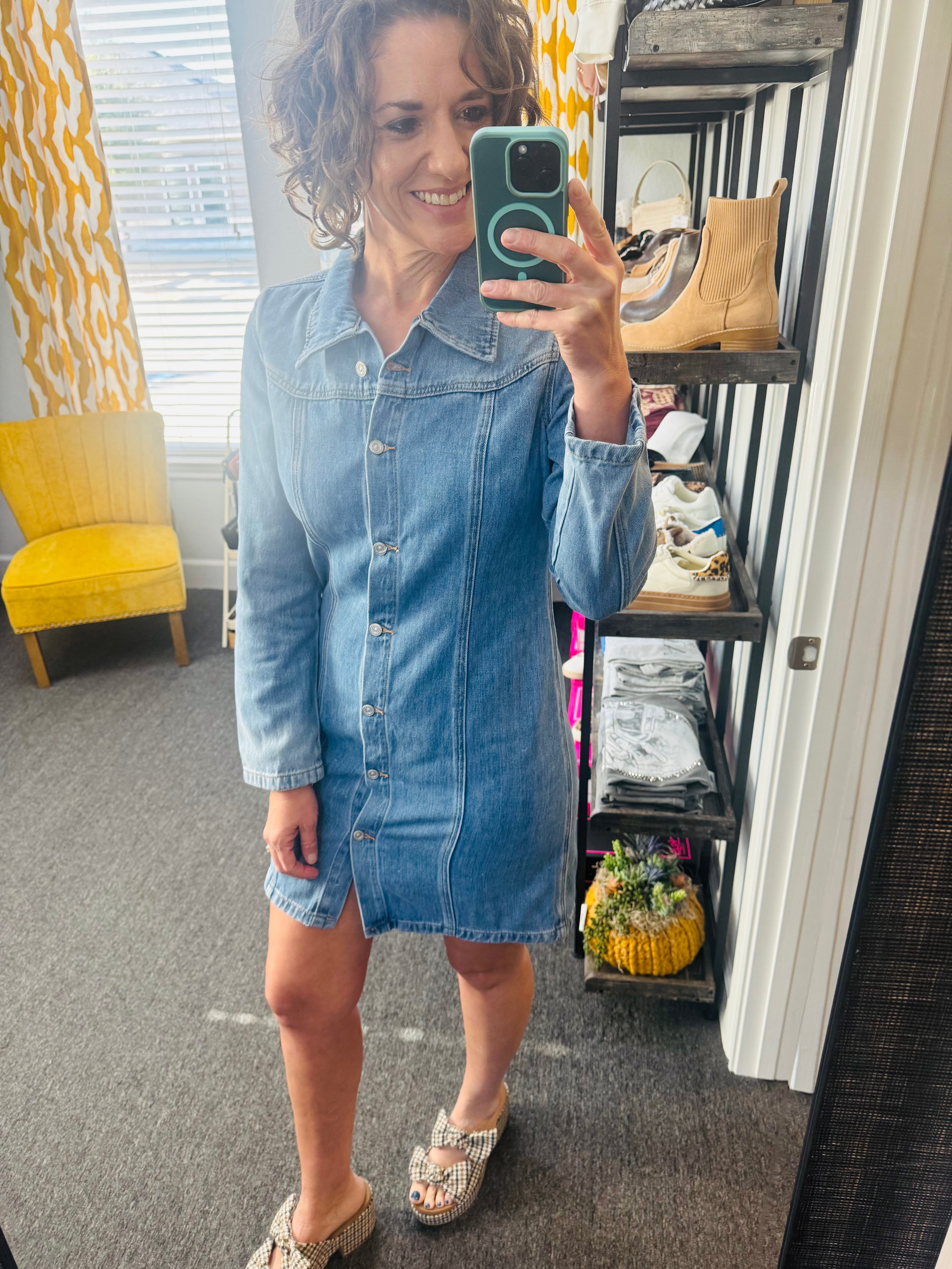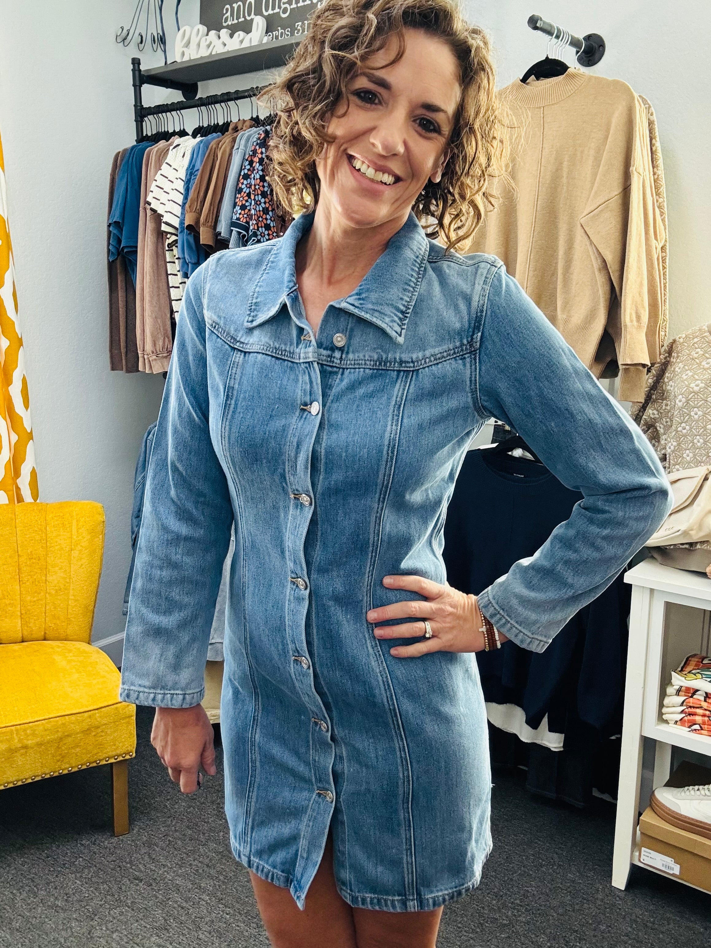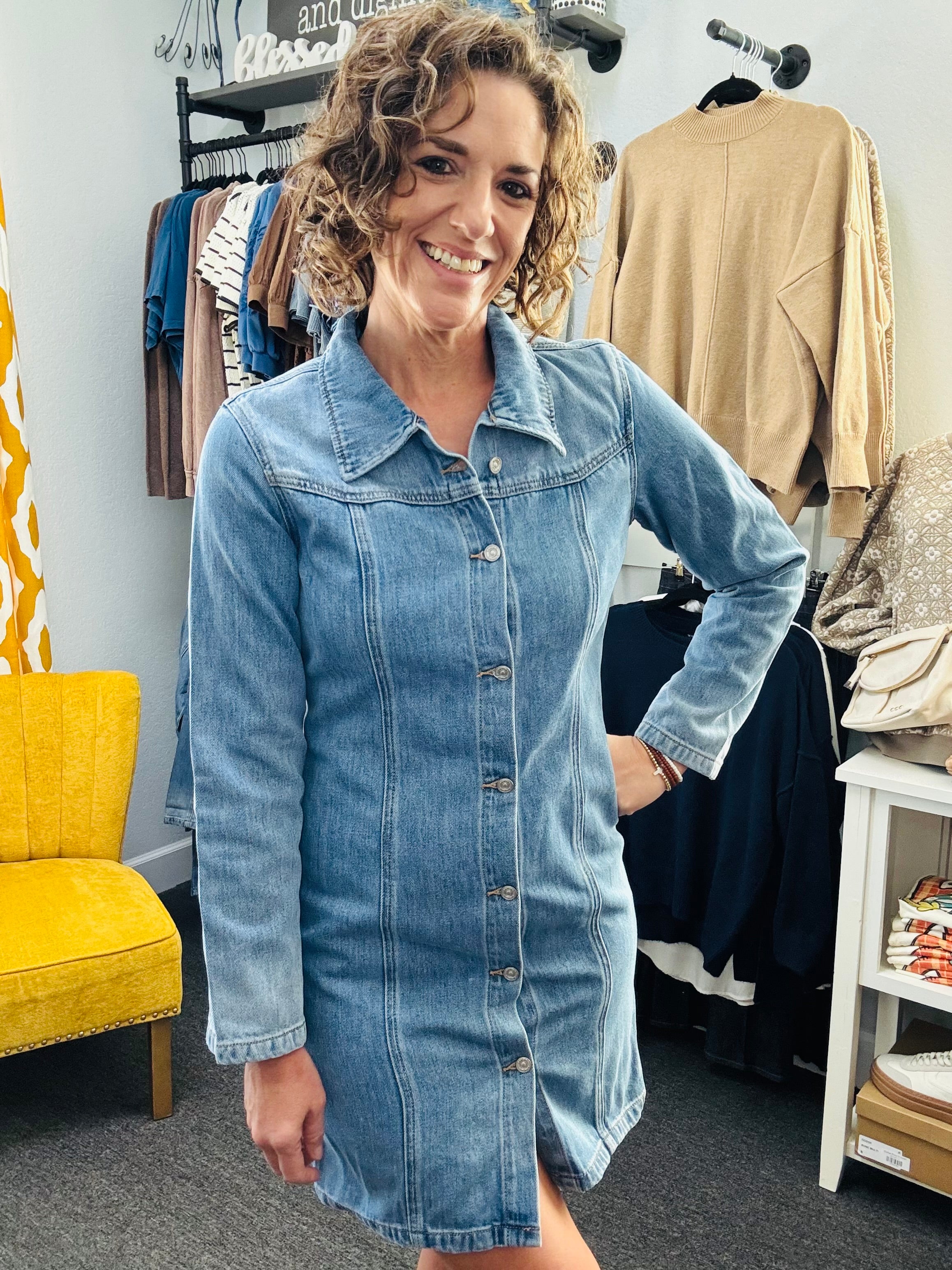 Turn heads in this sleek, seamless denim mini dress - our Midnight Thunder Dress. The one-piece design offers a flattering, body-skimming fit while subtle fading adds effortless dimension and edge. Style it with cute boots or heels for a night out or dress it down for a chic daytime look — either way, it’s effortlessly modern and versatile.