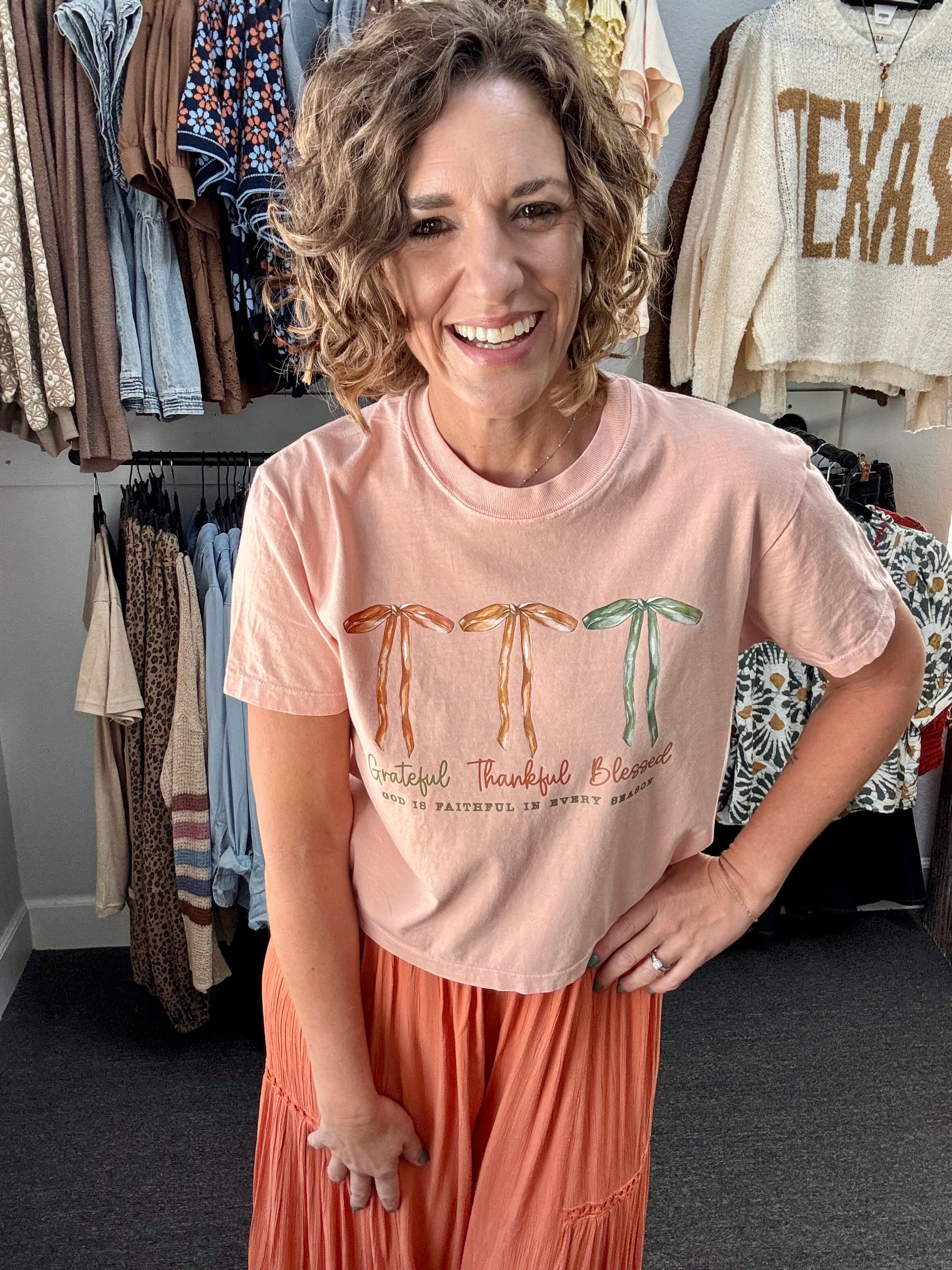 Spread gratitude in this adorable peach crop tee featuring charming bows in vibrant orange and green. Emblazoned with the uplifting message "Grateful, Thankful, Blessed" and the reassuring reminder that "God is faithful in every season," this tee celebrates faith with style. The cropped silhouette offers a modern, flattering fit perfect for layering or pairing with our Orange Flowy Pants for a coordinated look that radiates positivity and purpose.