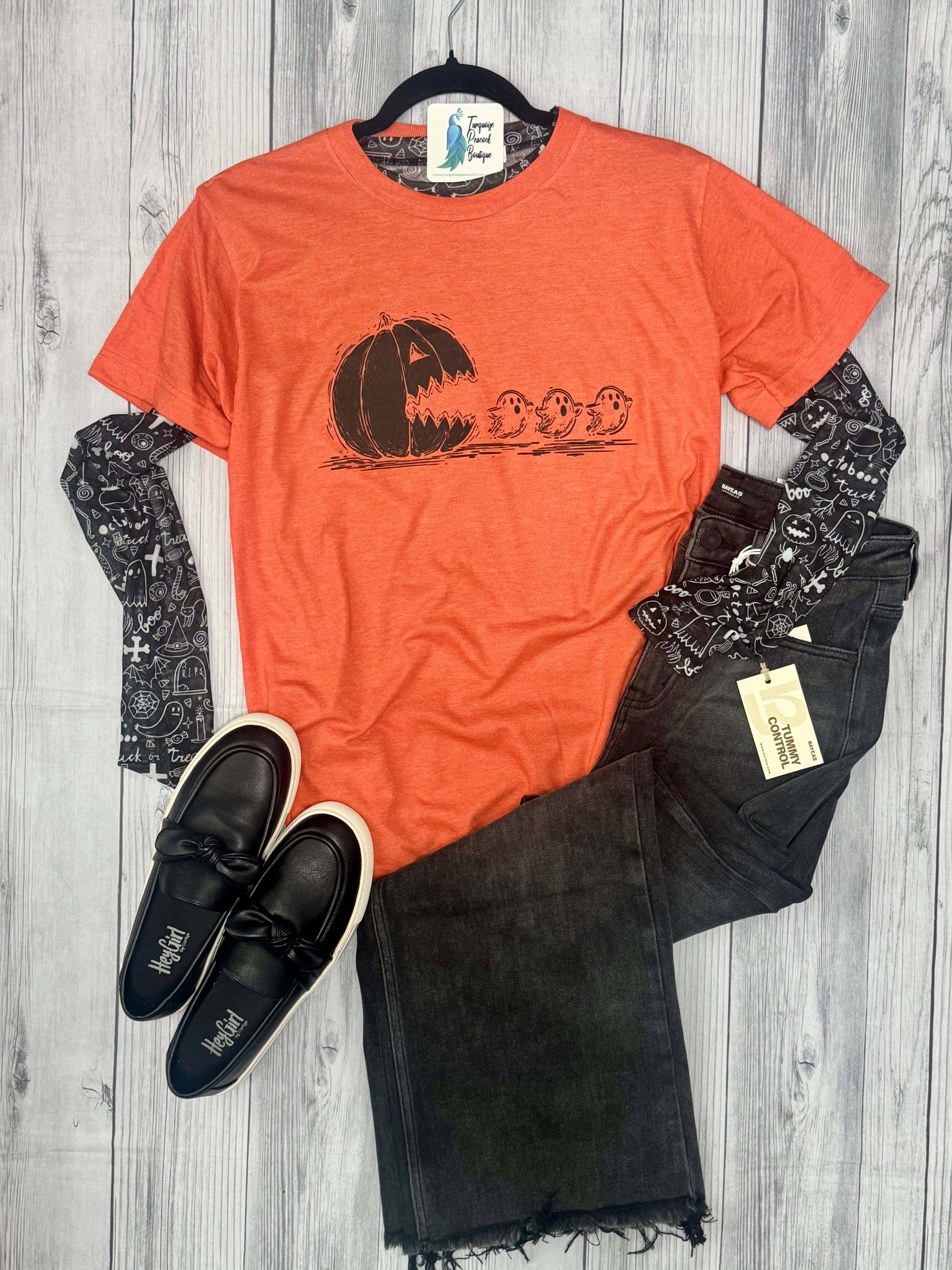 Celebrate Halloween fun with the Pac-O-Lantern Tee, featuring a playful jack-o-lantern chasing mischievous ghosts just like Pac Man! This bright orange shirt adds a festive twist to your wardrobe and pairs perfectly with our Washed Black Jeans for a spirited seasonal look.