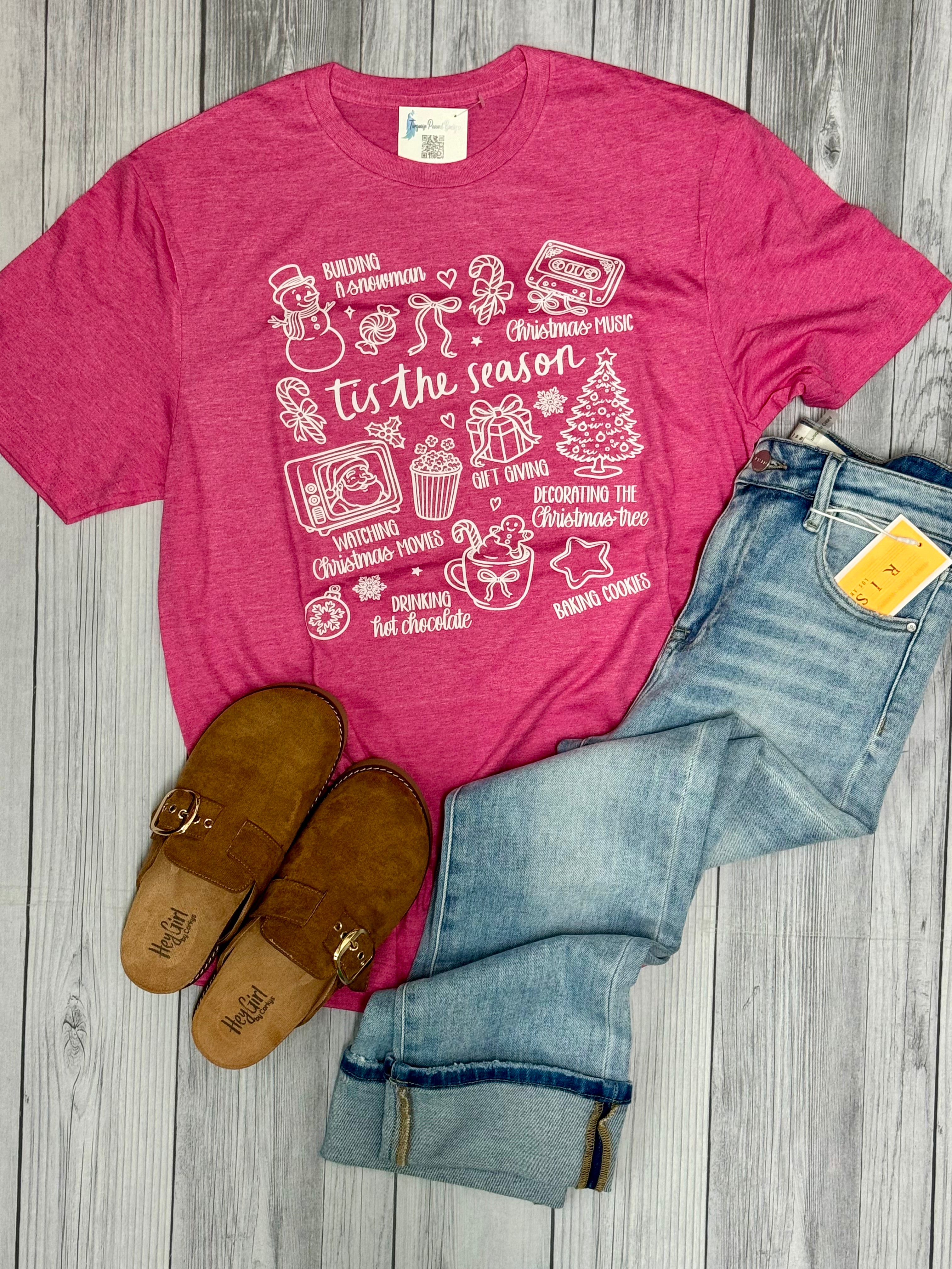 Get in the festive spirit with our Pink Holiday Favorites Tee — the cutest reminder of everything we love about Christmas! From cozy movie nights and cookie baking marathons to decking the tree and sipping hot chocolate, this tee celebrates all the season’s sweetest traditions. It’s perfect for pairing with jeans, leggings, or layering under your favorite cardigan. Comfy, cheerful, and oh-so-merry — this top is ready for every festive moment!