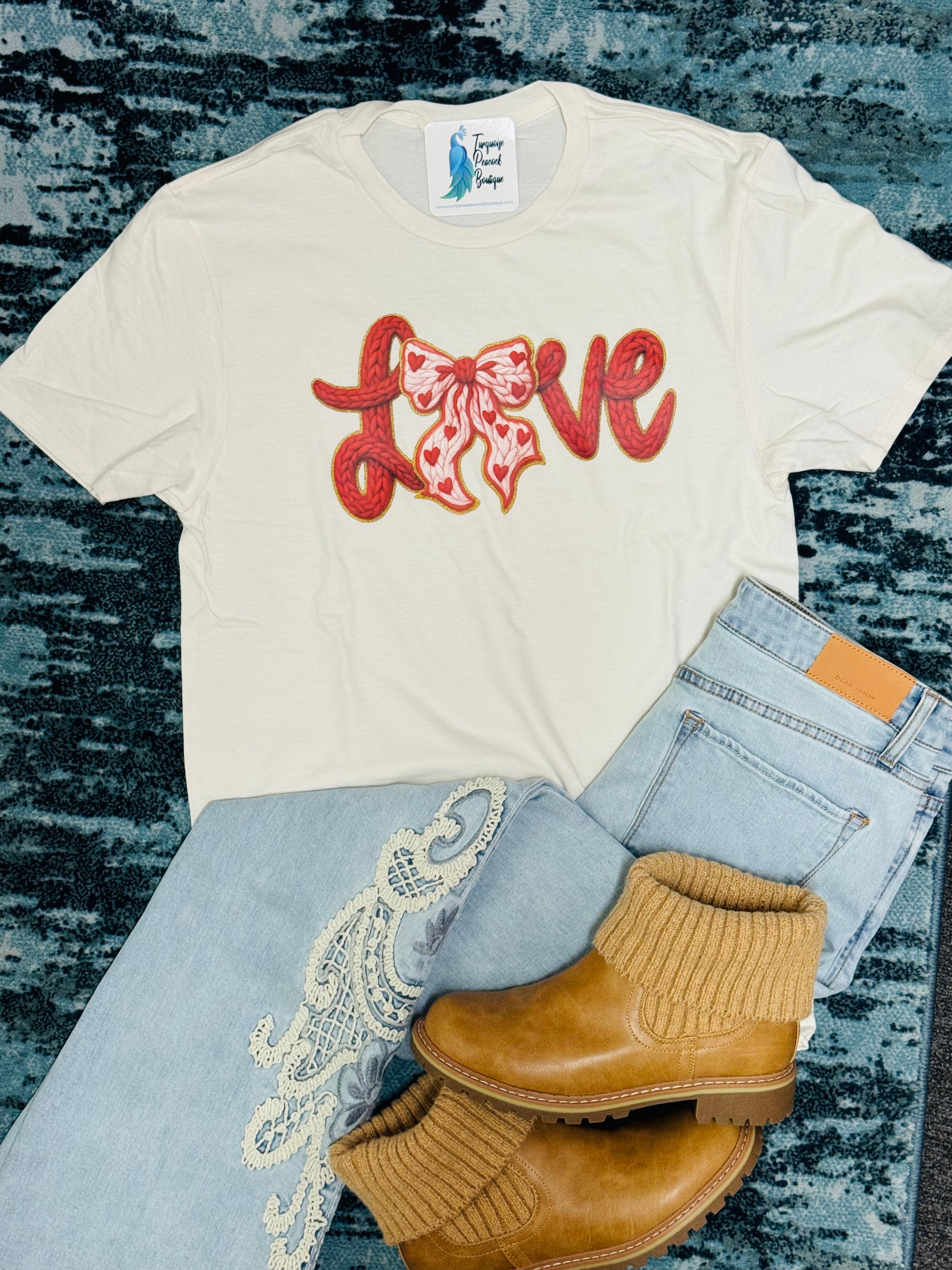 Sweet, cozy, and full of charm—our Bow My Heart Tee is a Valentine’s Day must-have! Crafted in a natural cream tee, the faux crochet “Love” graphic takes center stage, with the “O” transformed into an adorable bow dotted with red hearts. Soft, comfortable, and effortlessly cute, this tee pairs perfectly with jeans, skirts, or your favorite cardigan from The Sweetheart Edit.