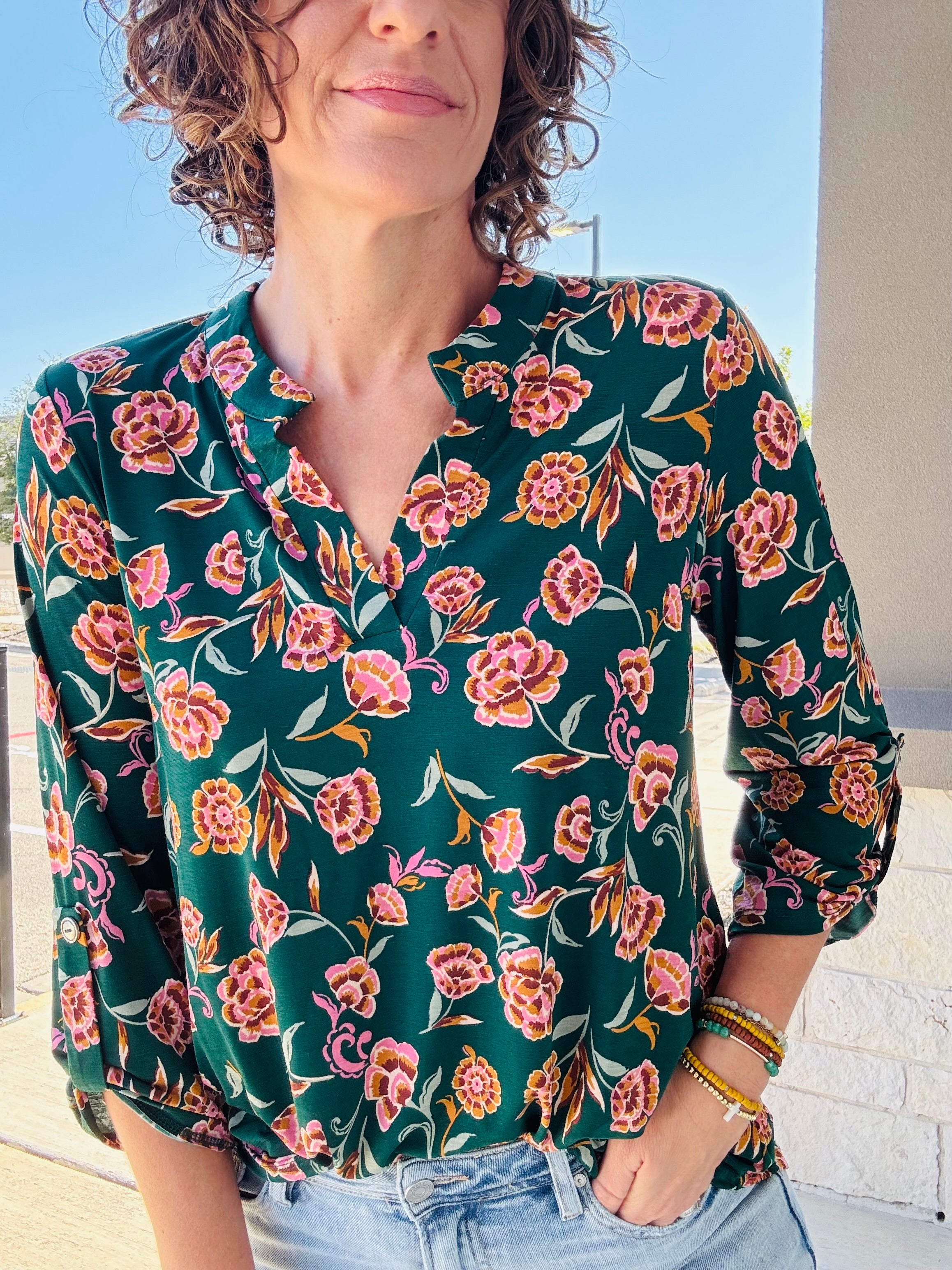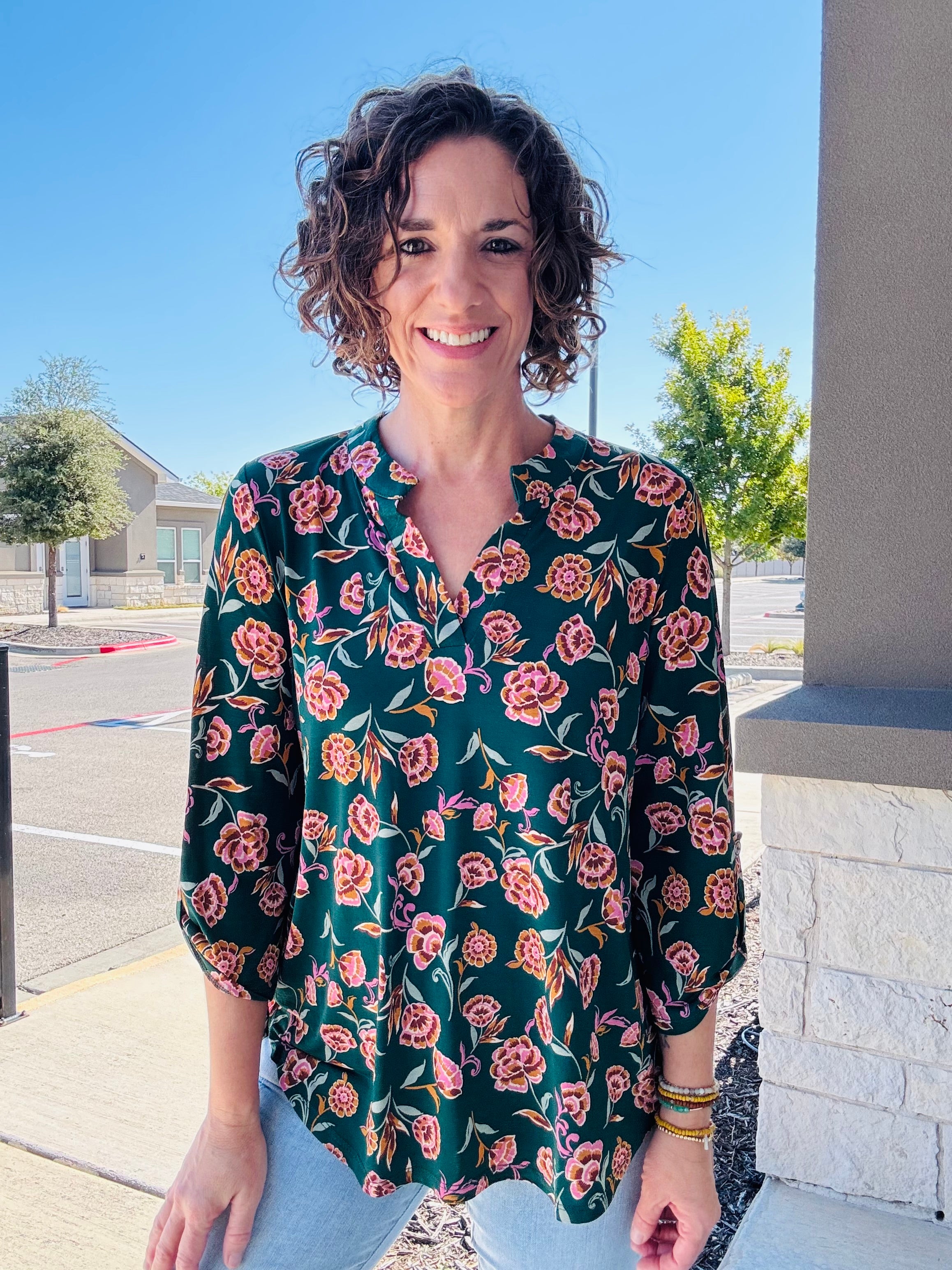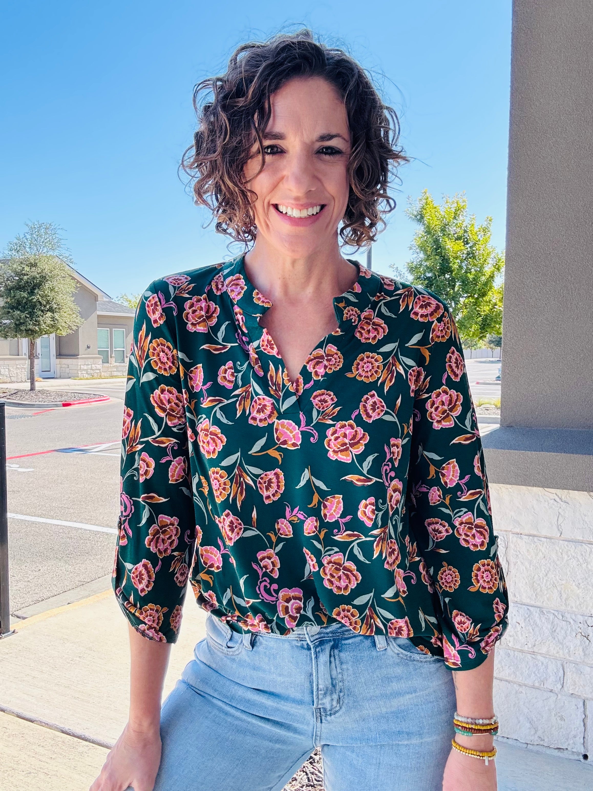 Step into fun with the Hunter Floral Lizzy Top! Sporting flirty 3/4 sleeves and a wrinkle-free fabric that’s as easy-going as you are, this top combines hunter green florals with pops of camel and rose, plus a splash of slate green to keep things interesting. It’s your new go-to for playful days and breezy nights, blending comfort and style with a cheerful twist.