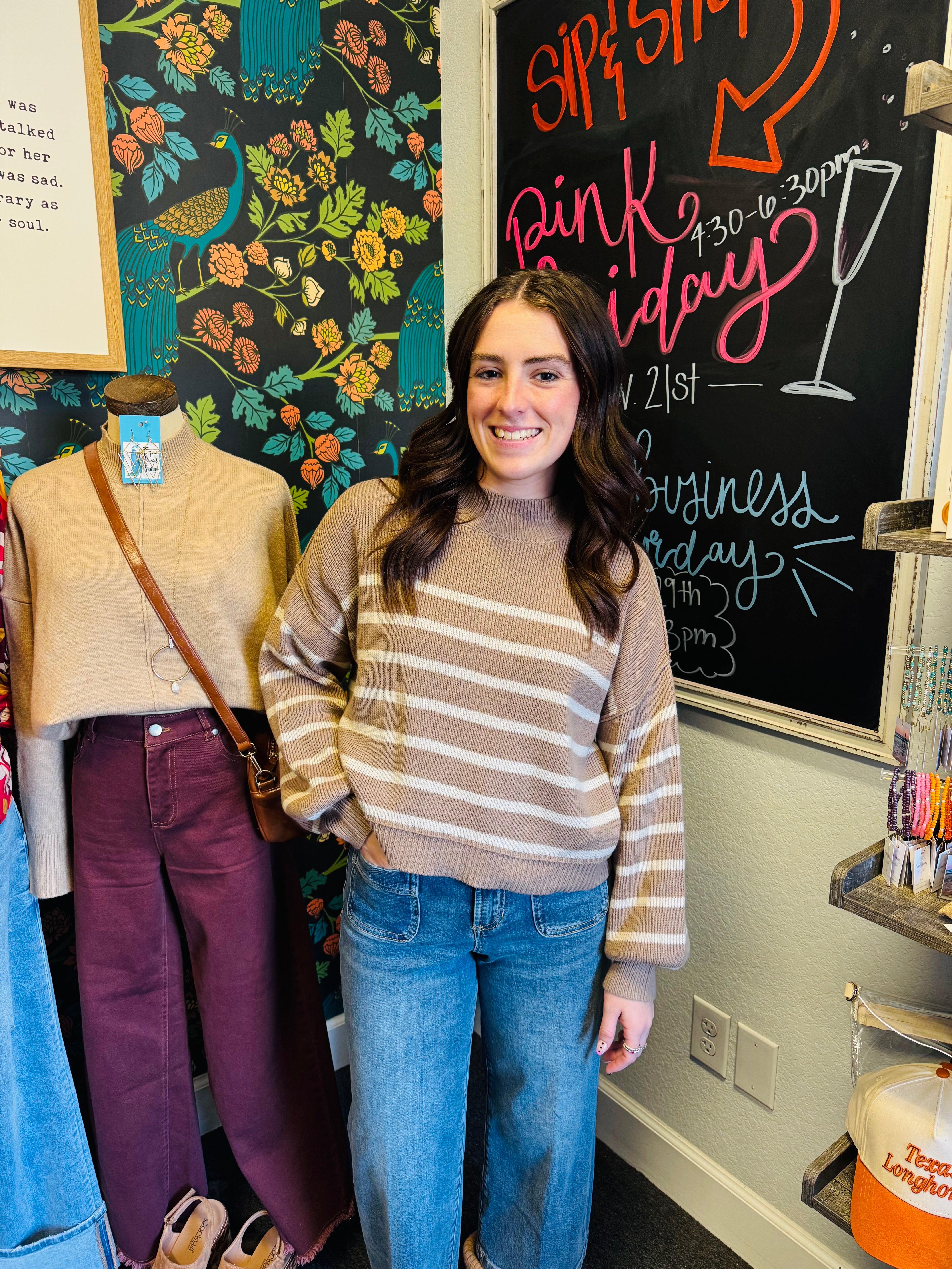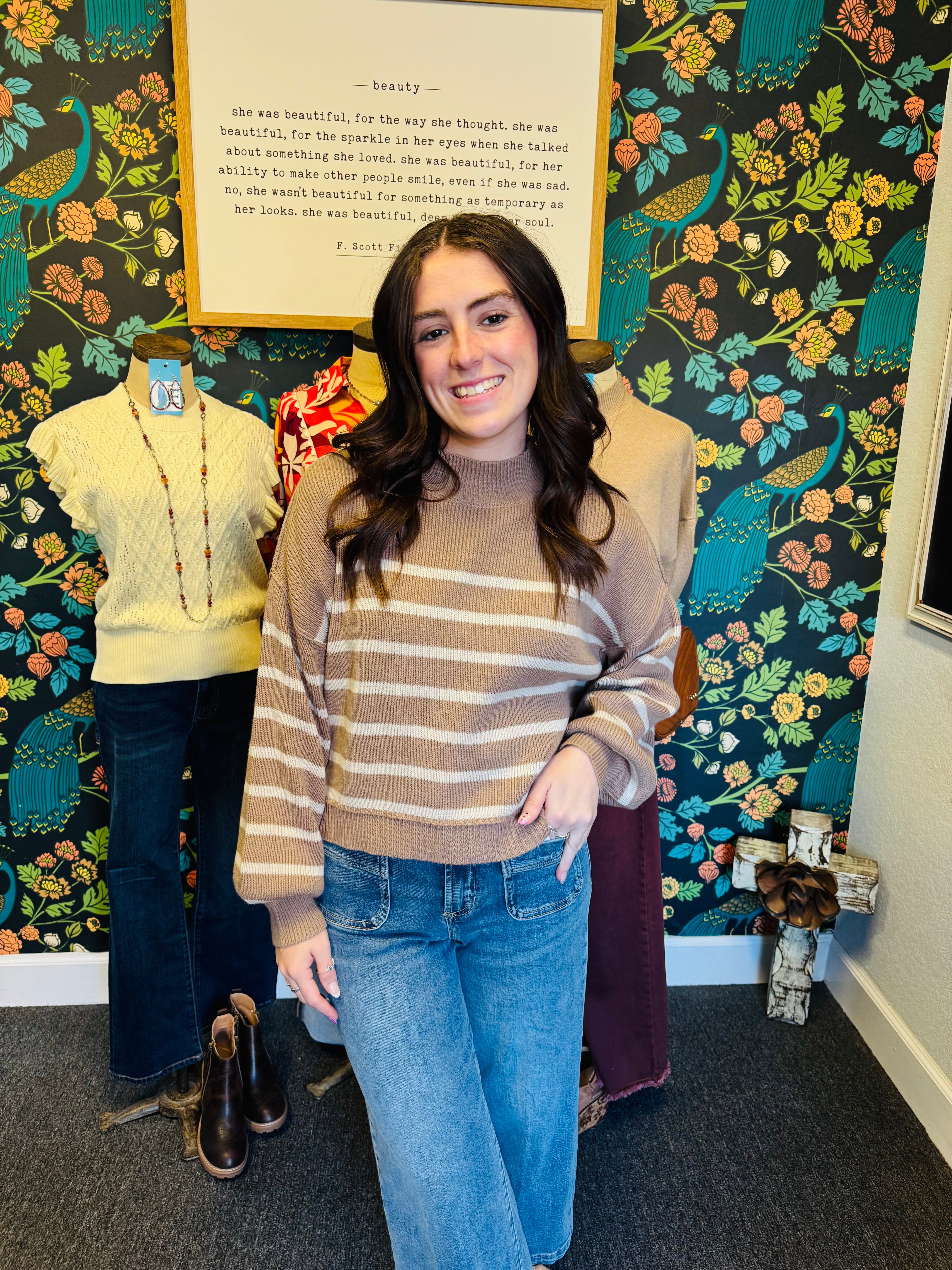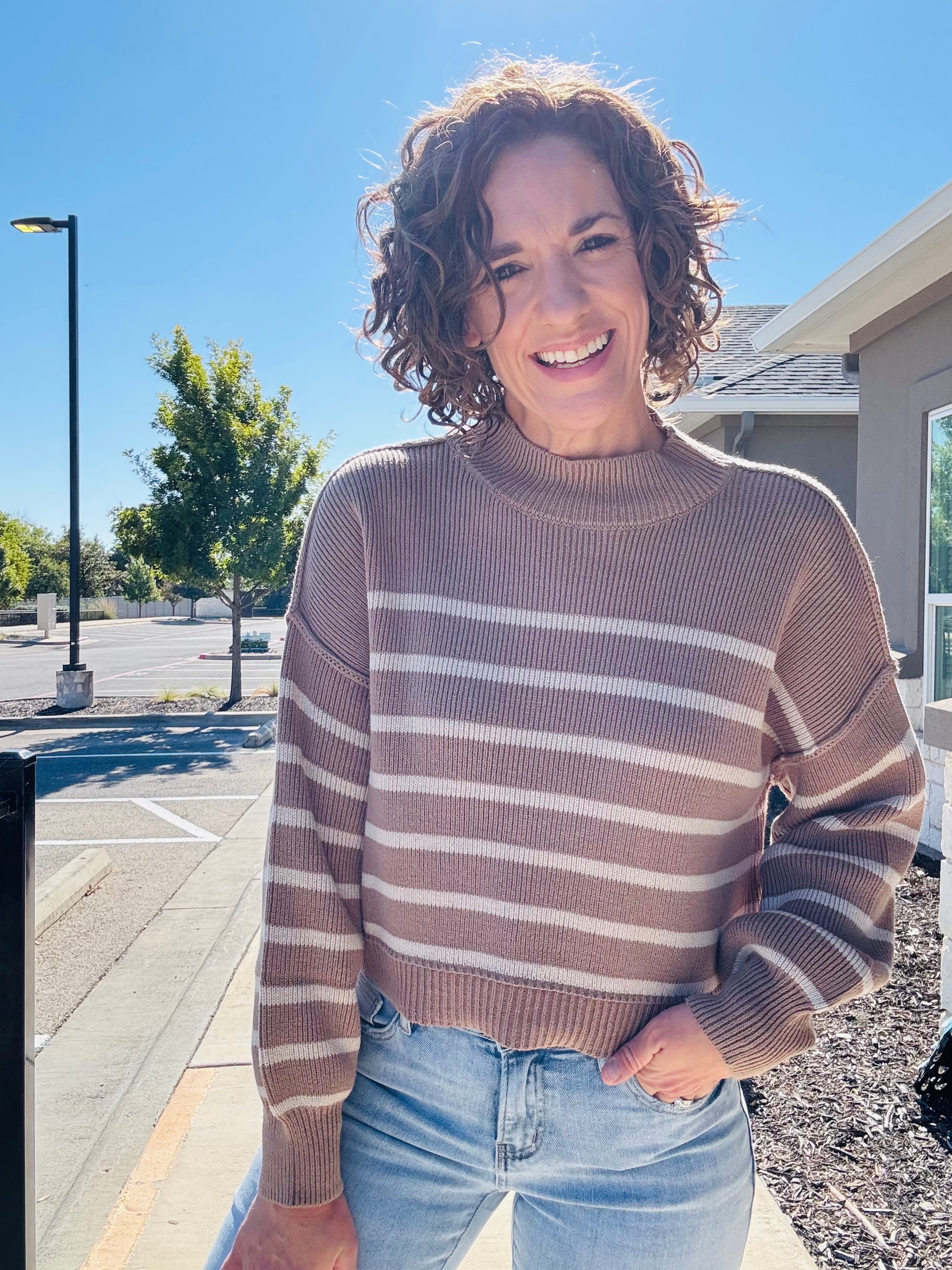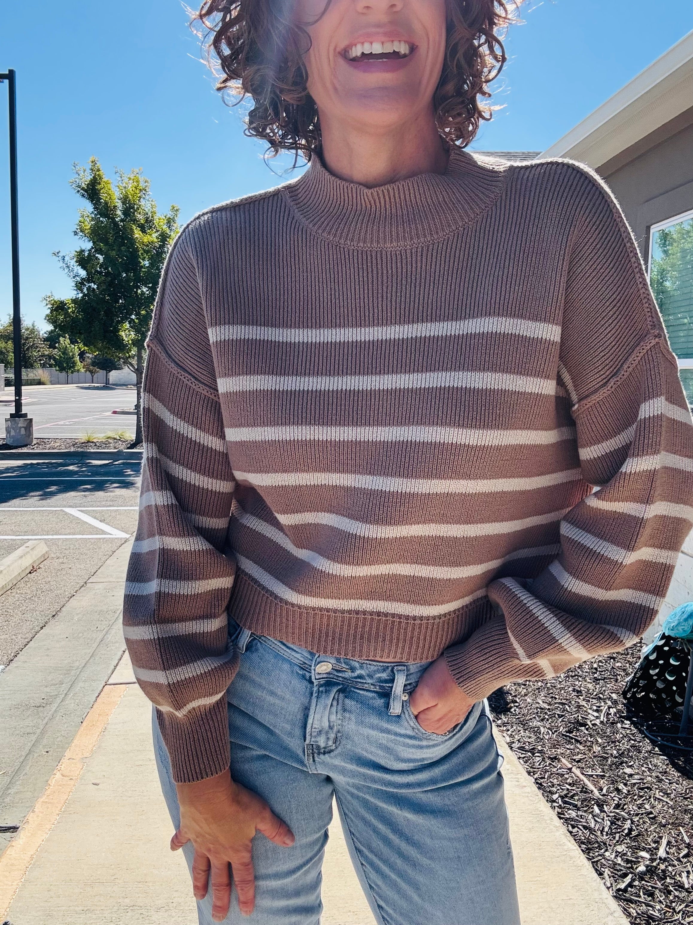 Wrap yourself in cozy charm with the Mocha Moments Sweater, featuring a playful striped pattern and adorable mockneck design. This long-sleeve essential brings warmth and whimsy to your everyday wardrobe. The soft, comfortable fit makes it an instant favorite for casual days and relaxed weekends.
