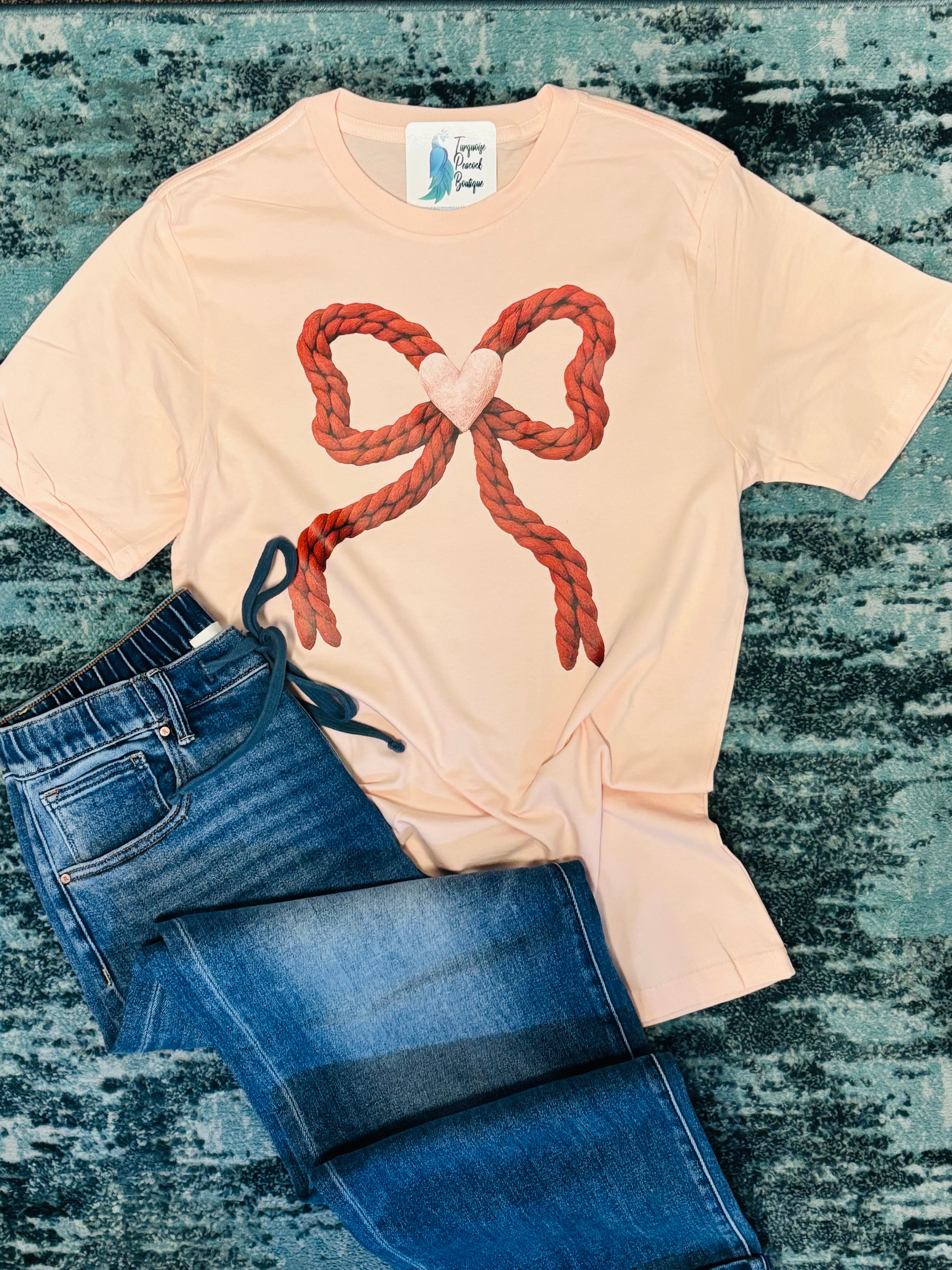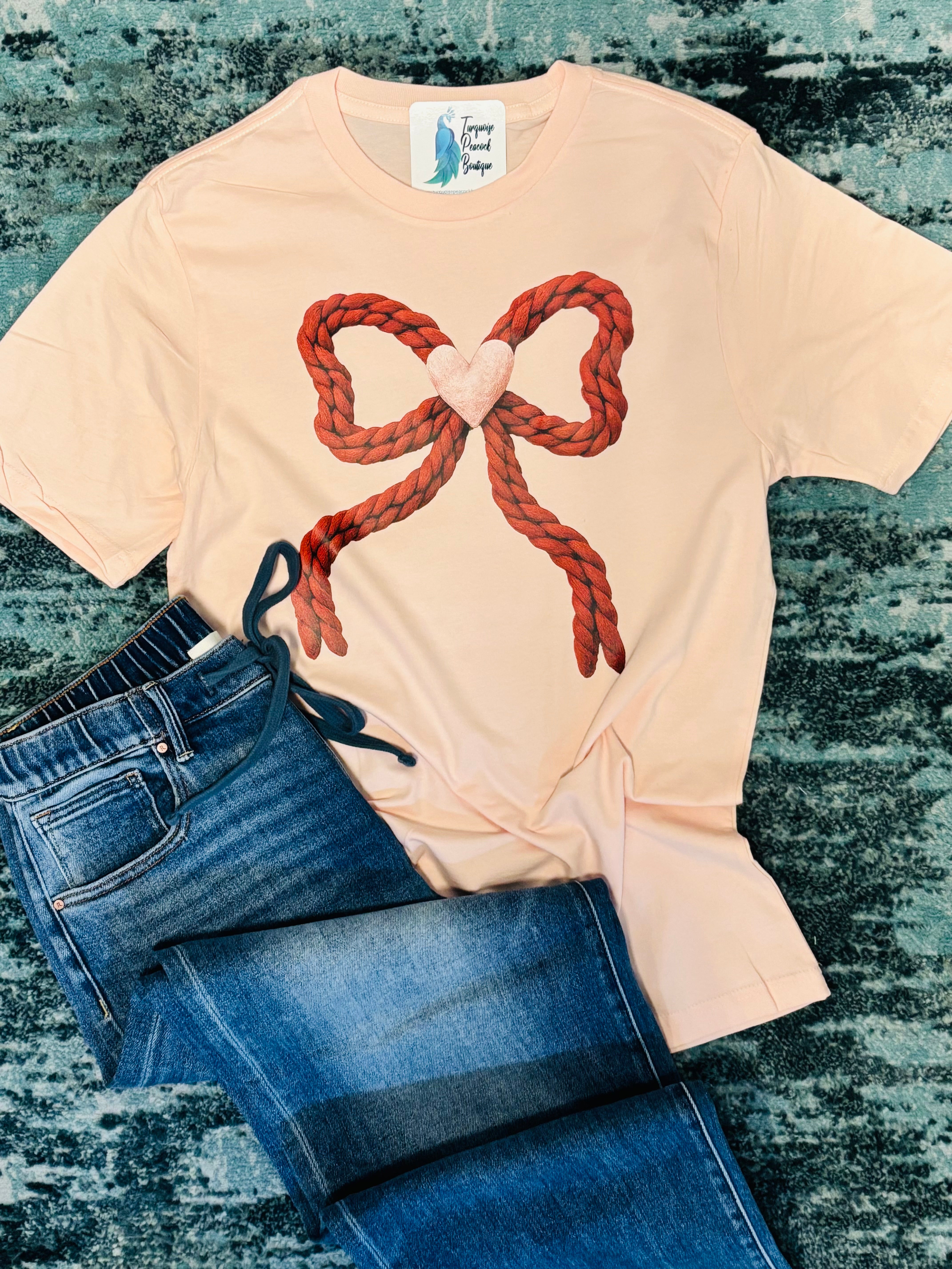 Bring a little Valentine’s Day charm to your everyday wardrobe with the Sweetheart Bow Tee. This soft, comfy tee features a faux-knit red bow with a pink heart center — the perfect sweet detail that adds a fun, flirty touch to any outfit.