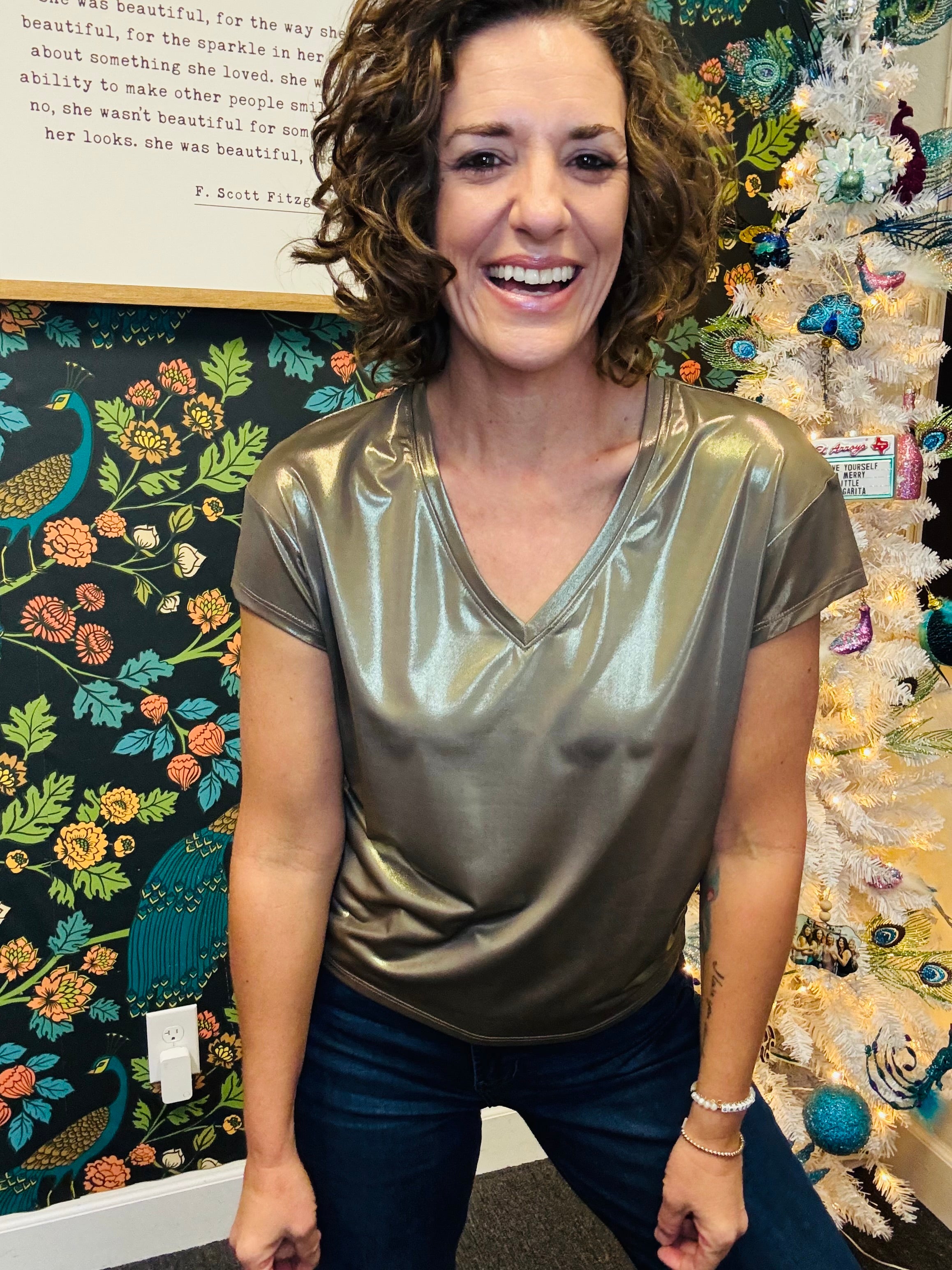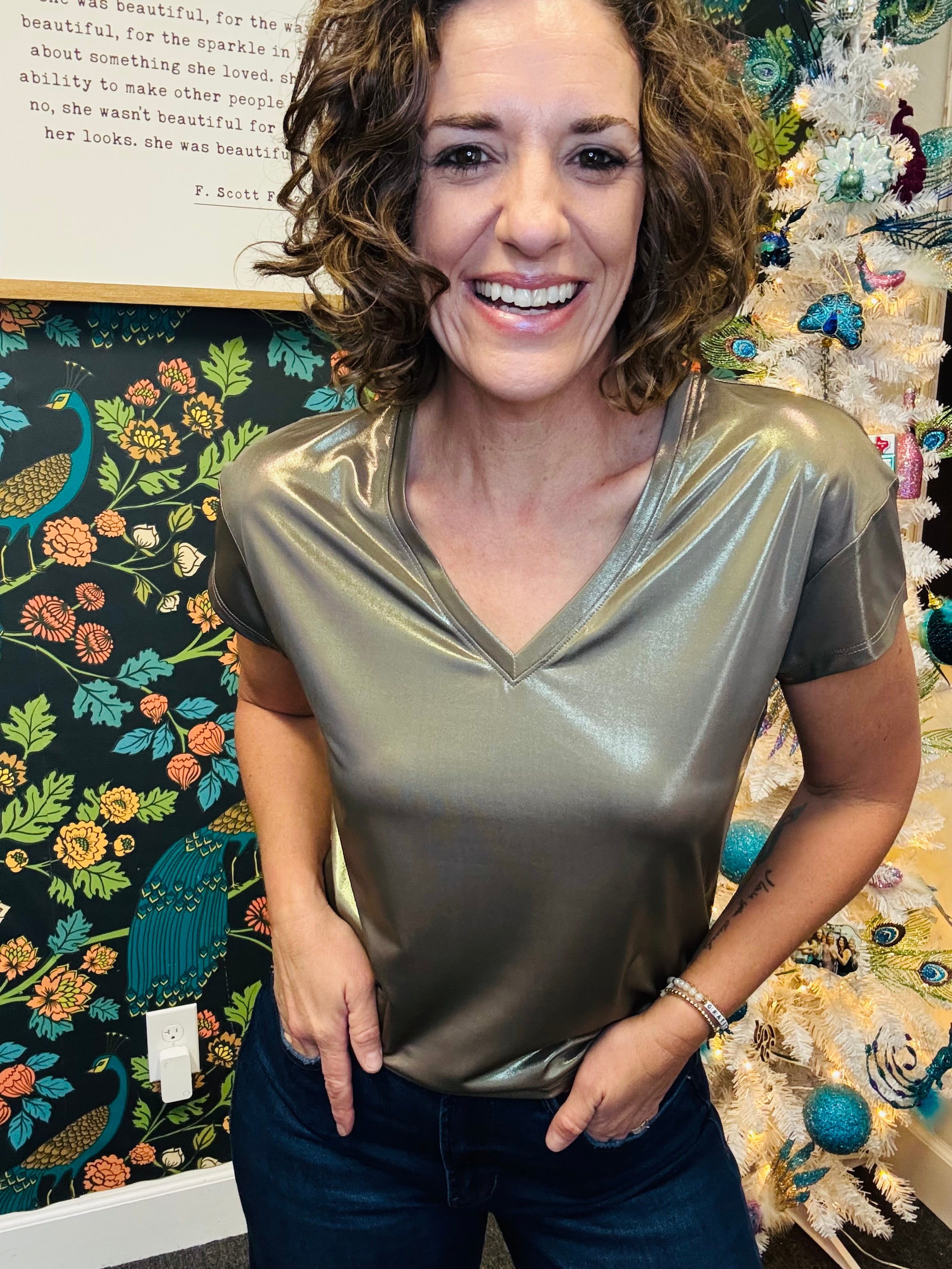 The Gold Metallic Lumi Top brings effortless elegance to your everyday wardrobe. This short-sleeve V-neck design offers a refined silhouette, while subtle metallic threading adds just the right amount of shimmer for versatile styling. Perfect as a polished staple that transitions seamlessly from day to evening.