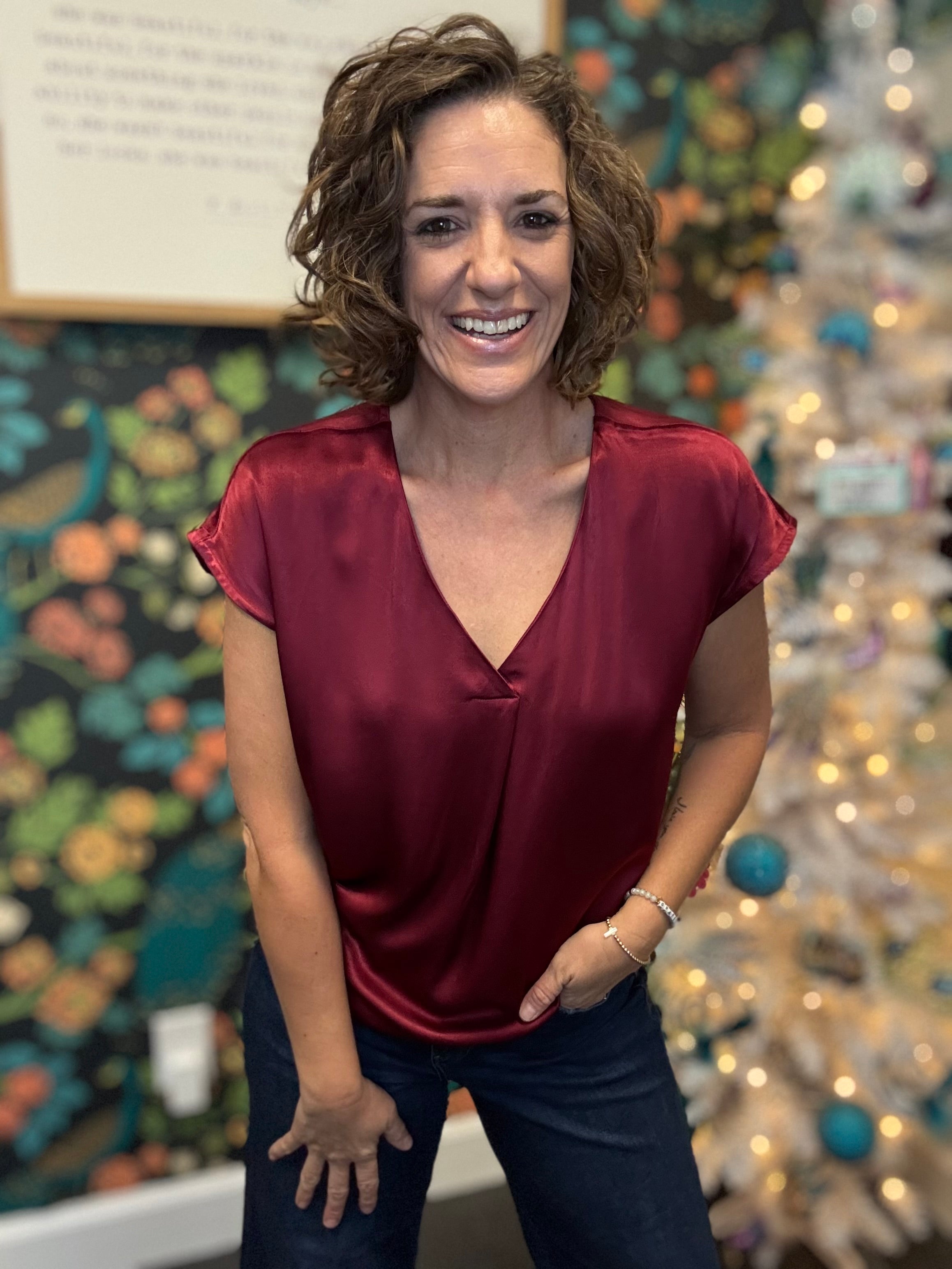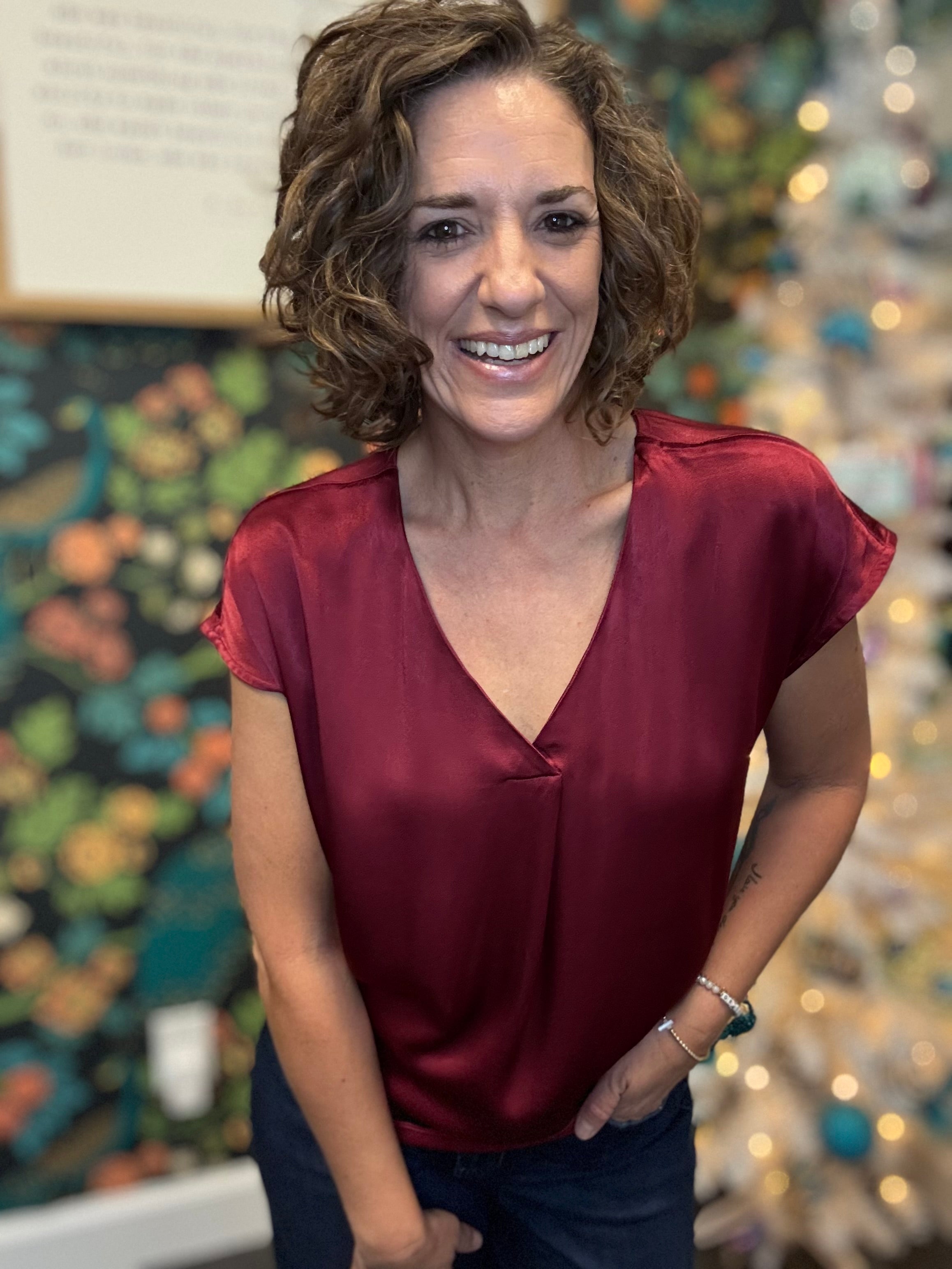 The Kristen Top is crafted from a luxurious viscose and rayon blend. This relaxed-fit v-neck blouse drapes boldly across your frame with effortless sophistication. Wear it solo or layer it. Perfect for the holidays too!