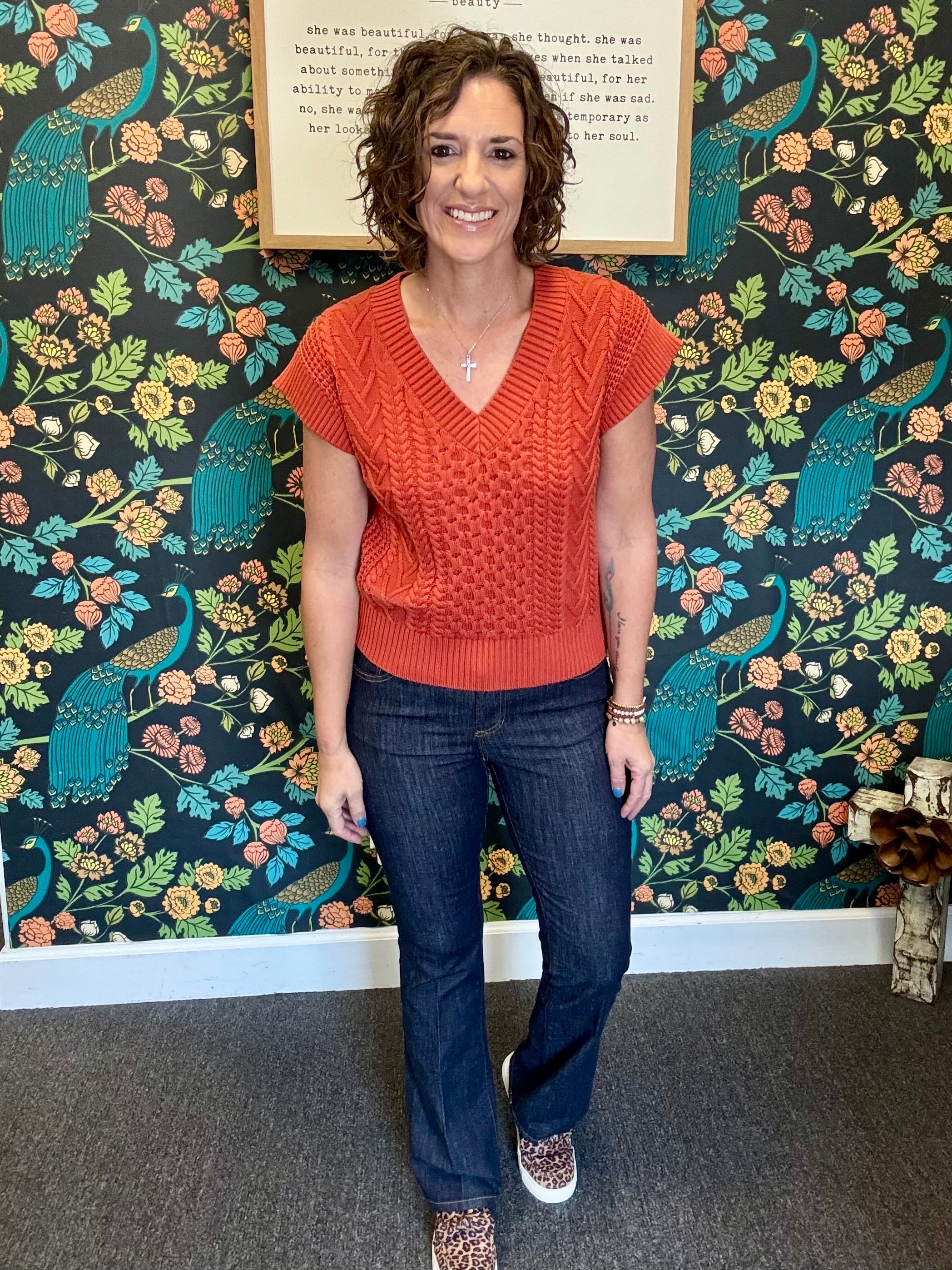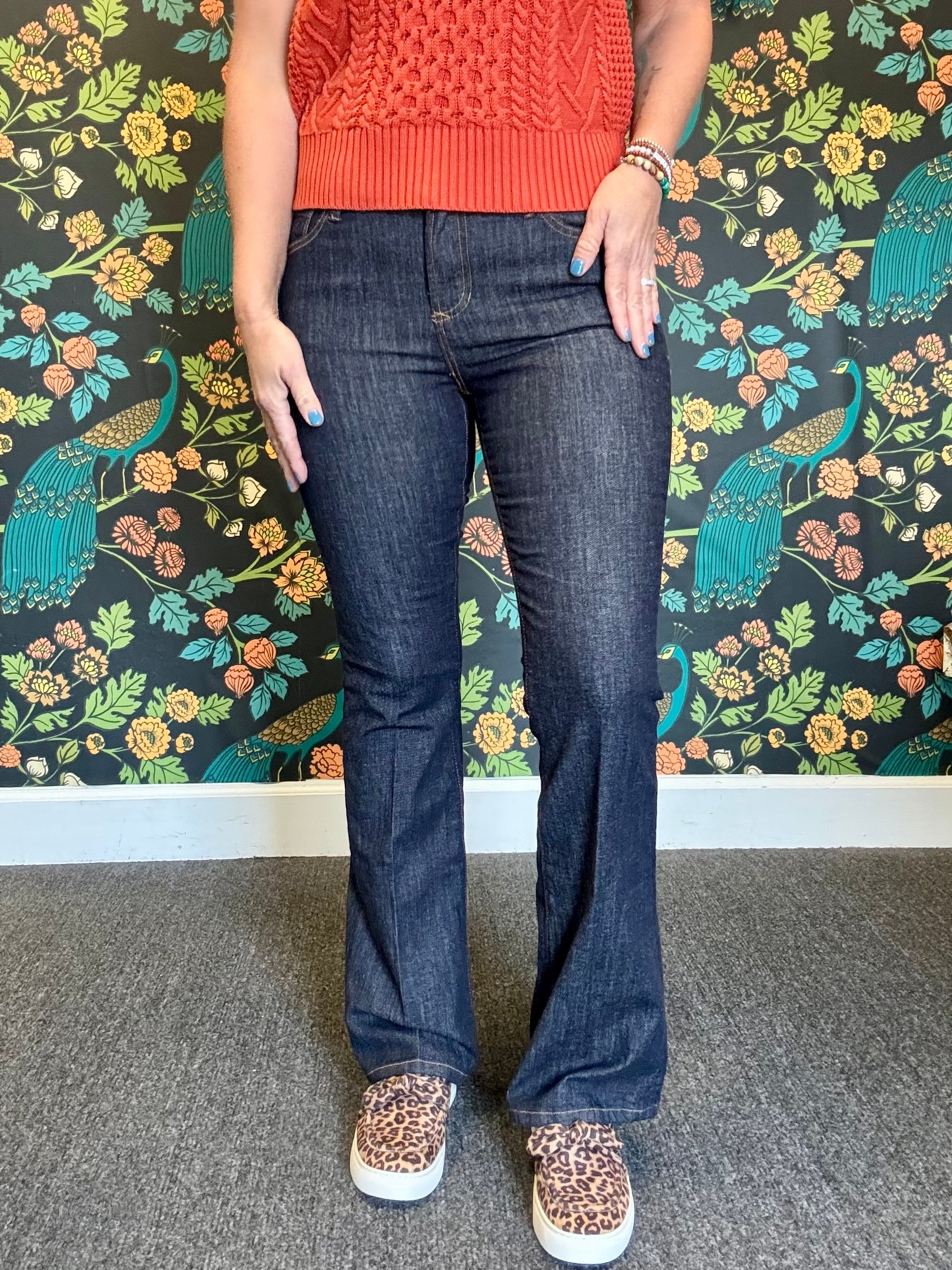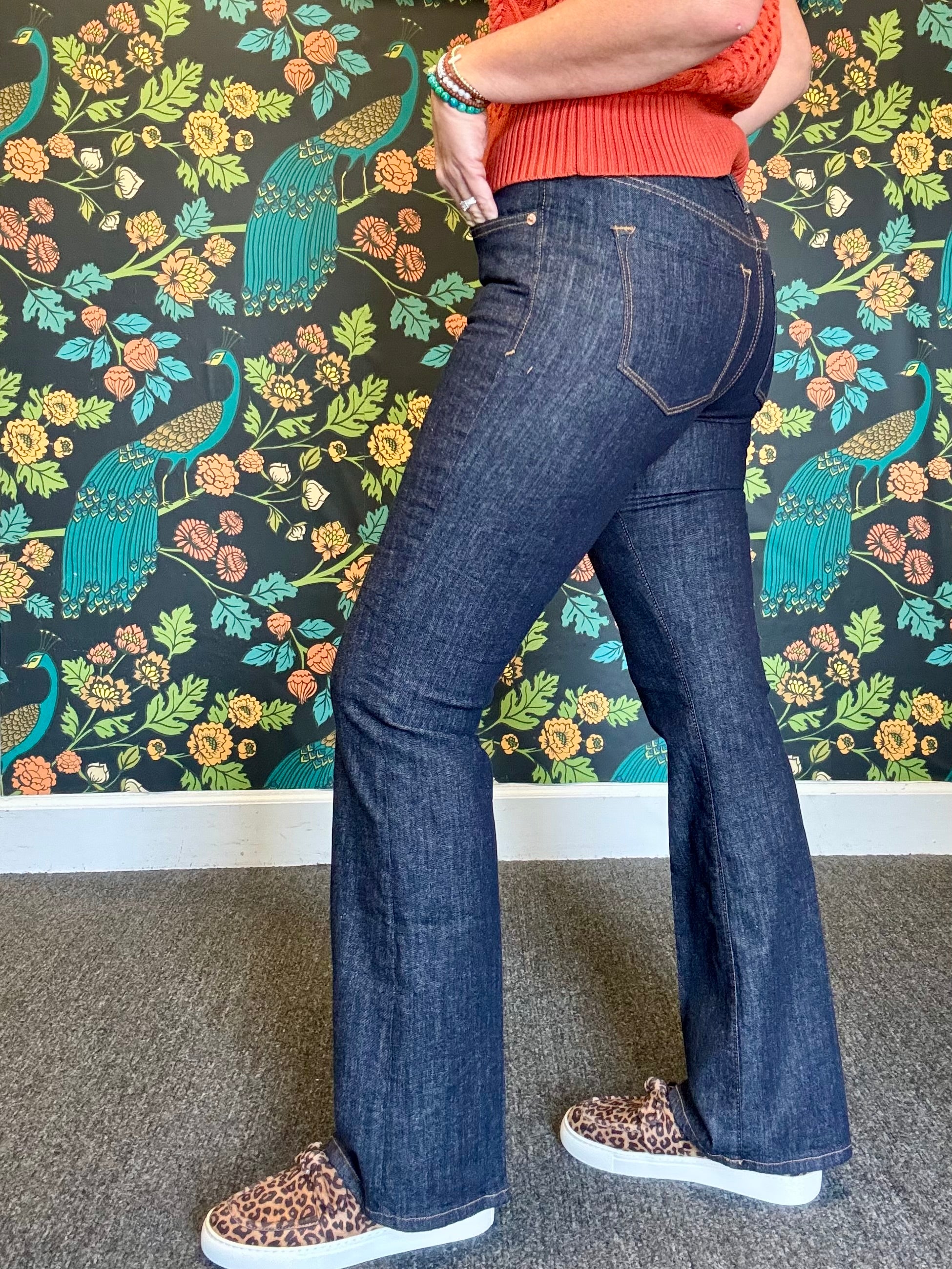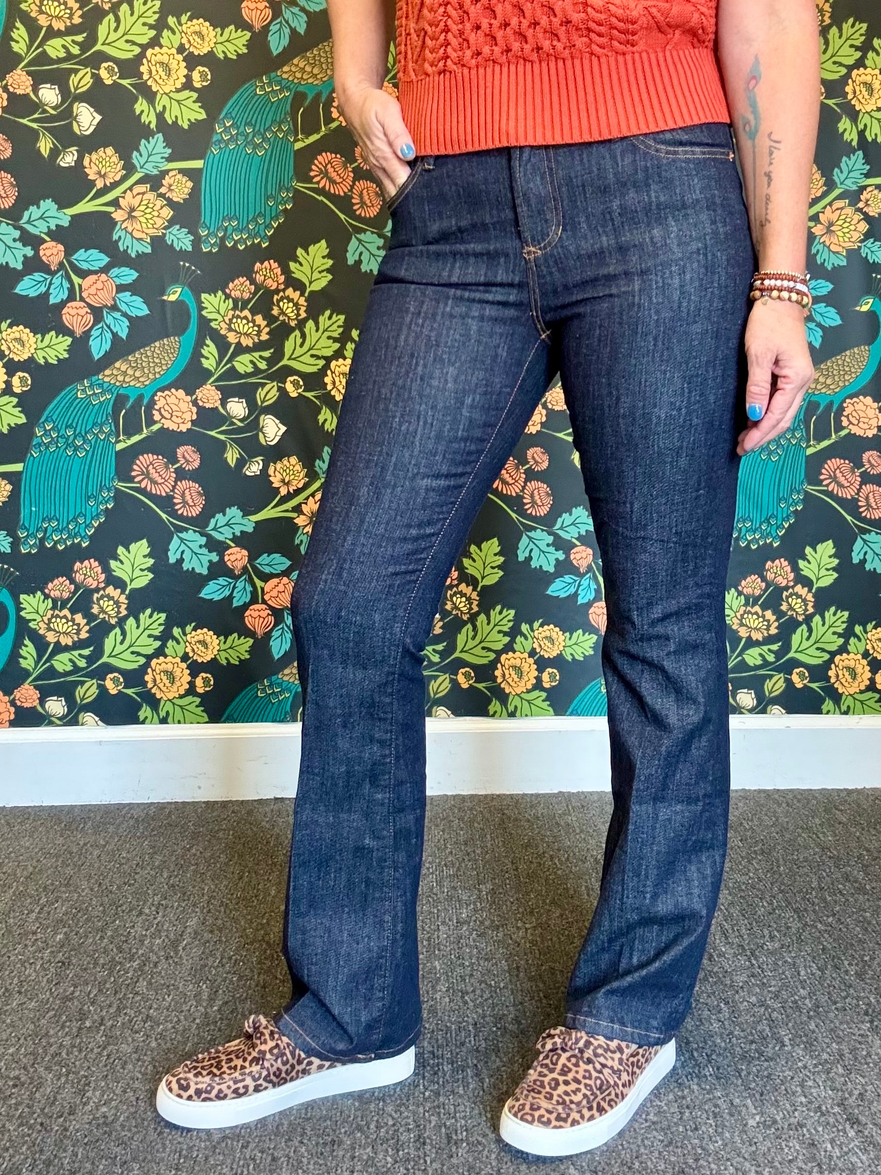 Fits snug, most ladies have sized up. Angela is wearing a size 7/28 after sizing up.