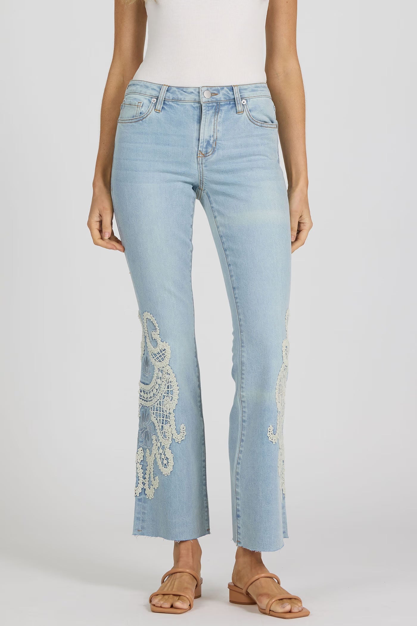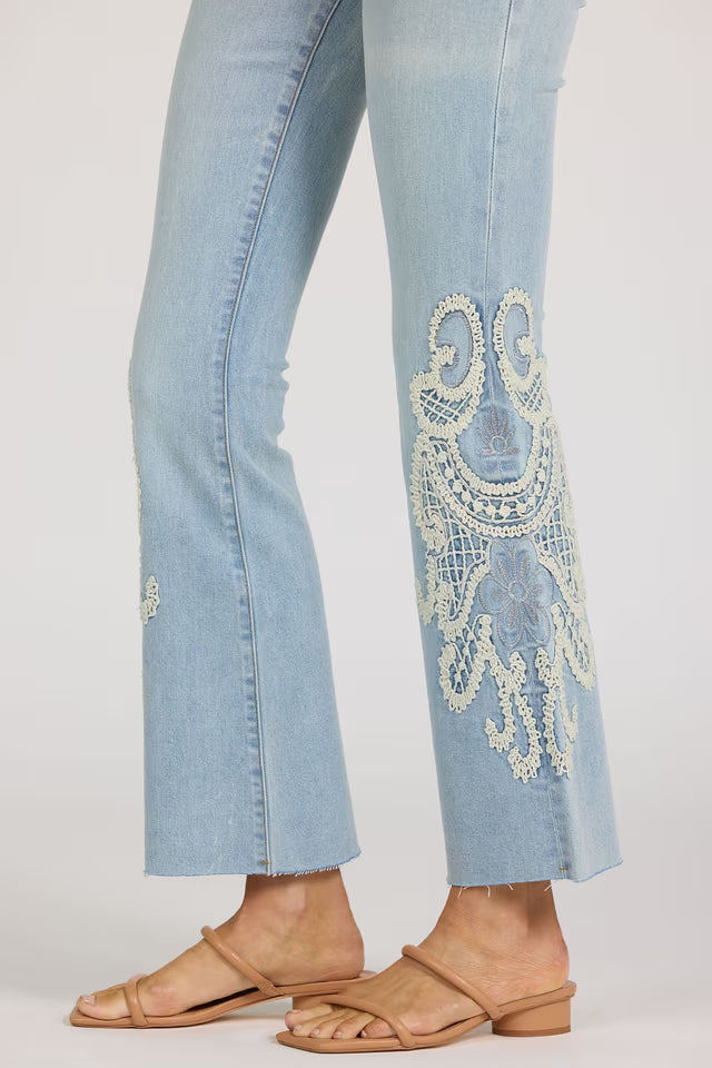 Make a statement in our stunning Denim Lace Rosa Jeans by Dear John Denim. Featuring intricate lace-inspired embroidery along the leg, these mid-rise jeans offer a classic fit with a raw-edge hem for a polished yet effortlessly casual look. Crafted from a cotton and spandex blend, they provide just the right amount of stretch for all-day comfort. Finished with a zip fly and button closure and a timeless five-pocket design, the subtle flare leg adds a flattering, fashion-forward touch you’ll love.