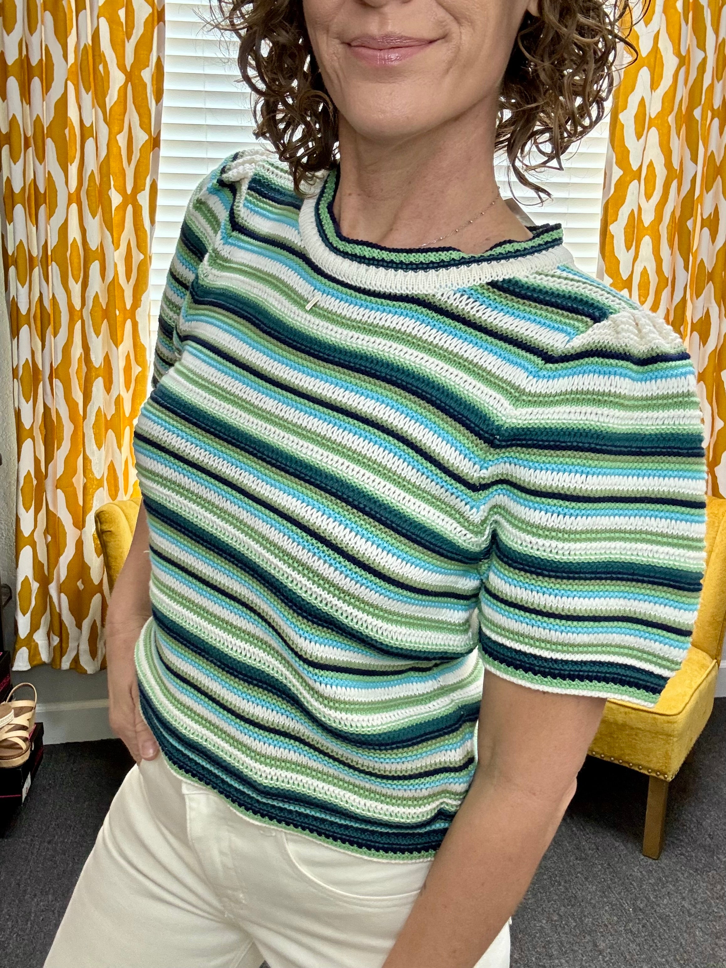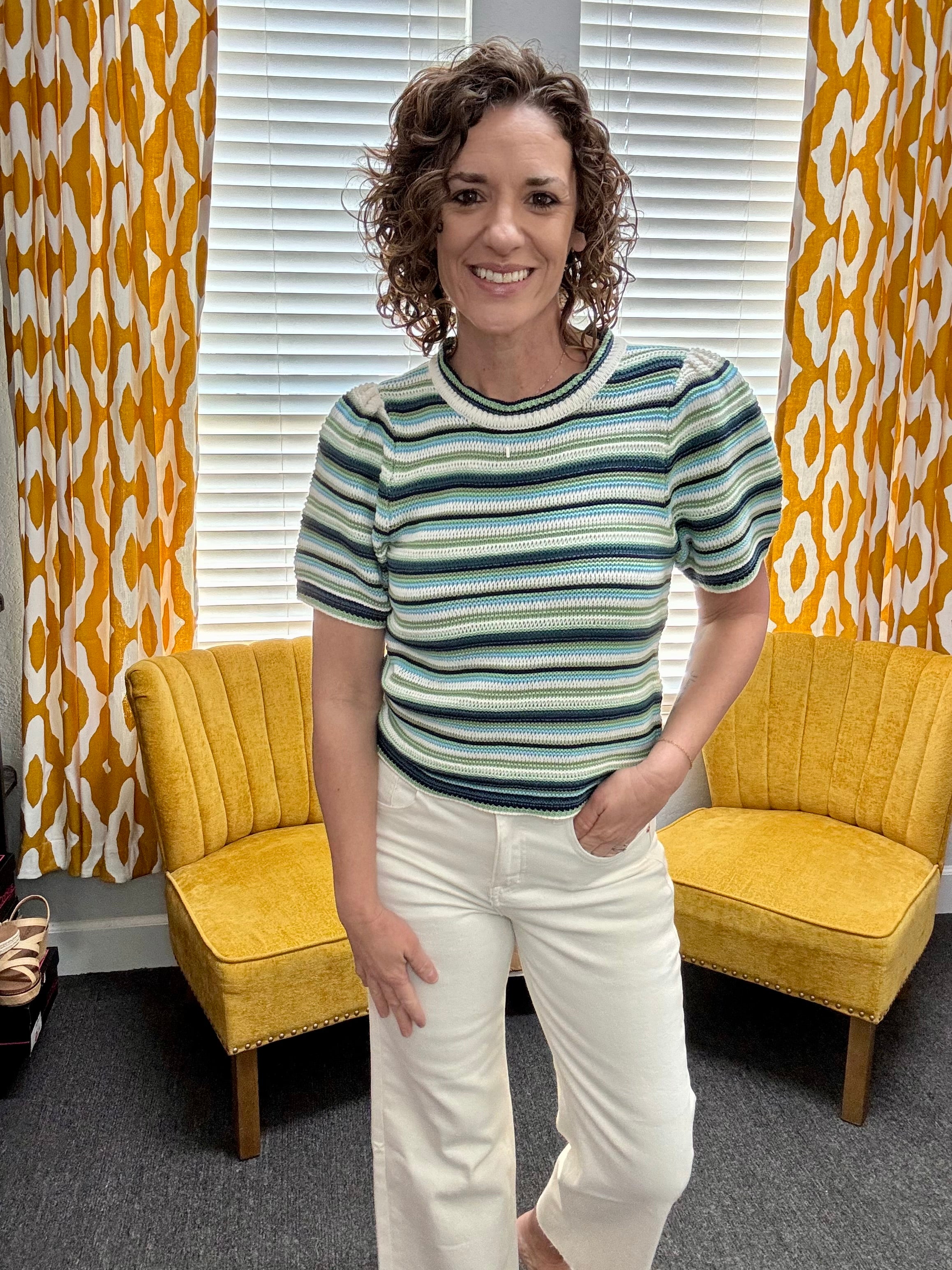 Classic, colorful, and effortlessly versatile — the Striped Simone Top is a go-to piece for spring and beyond. Featuring a soft knit with multi-color stripes in blue, teal, green, and ivory, this crew neck, short-sleeve sweater blends timeless style with a playful pop of color.