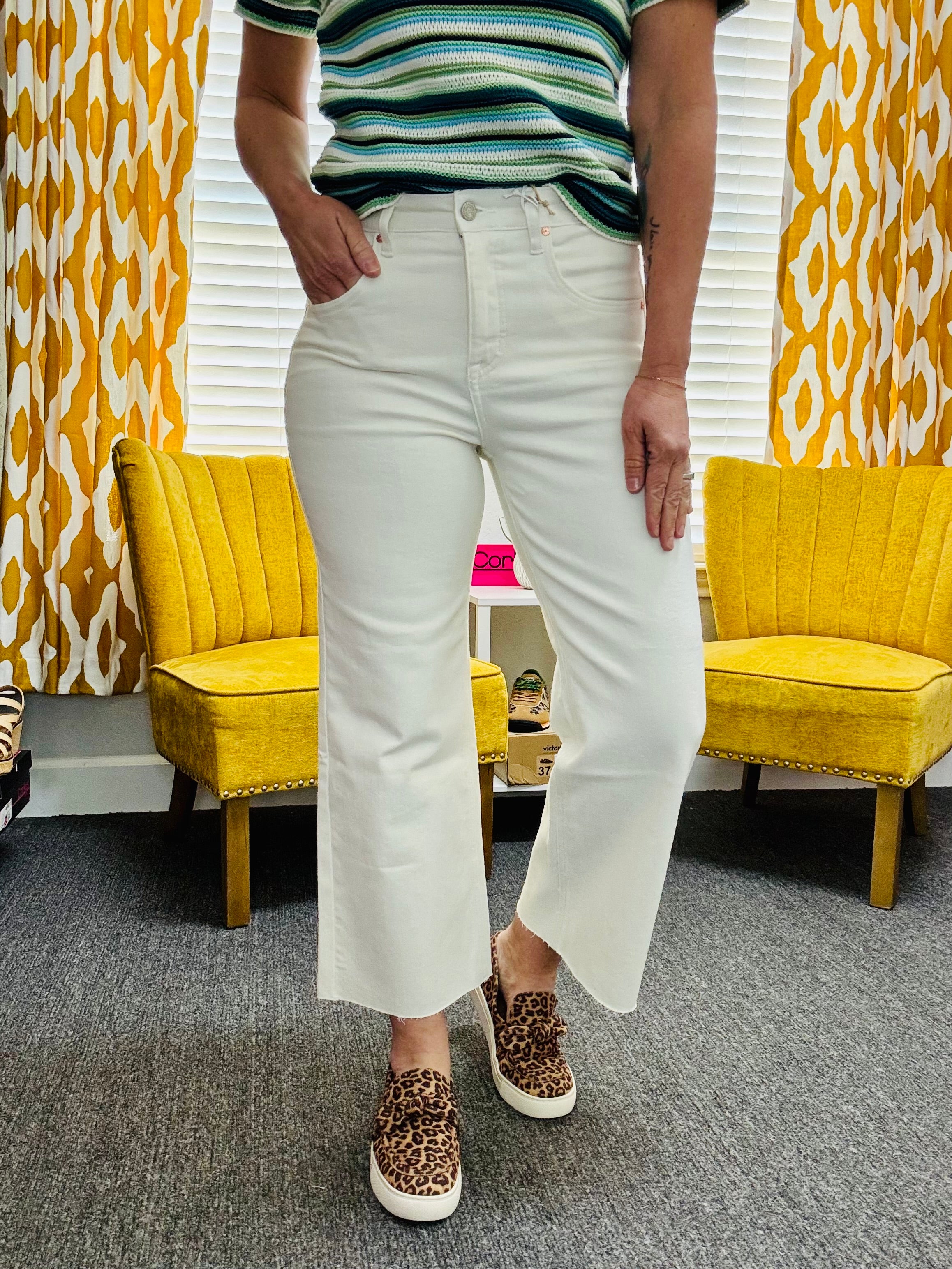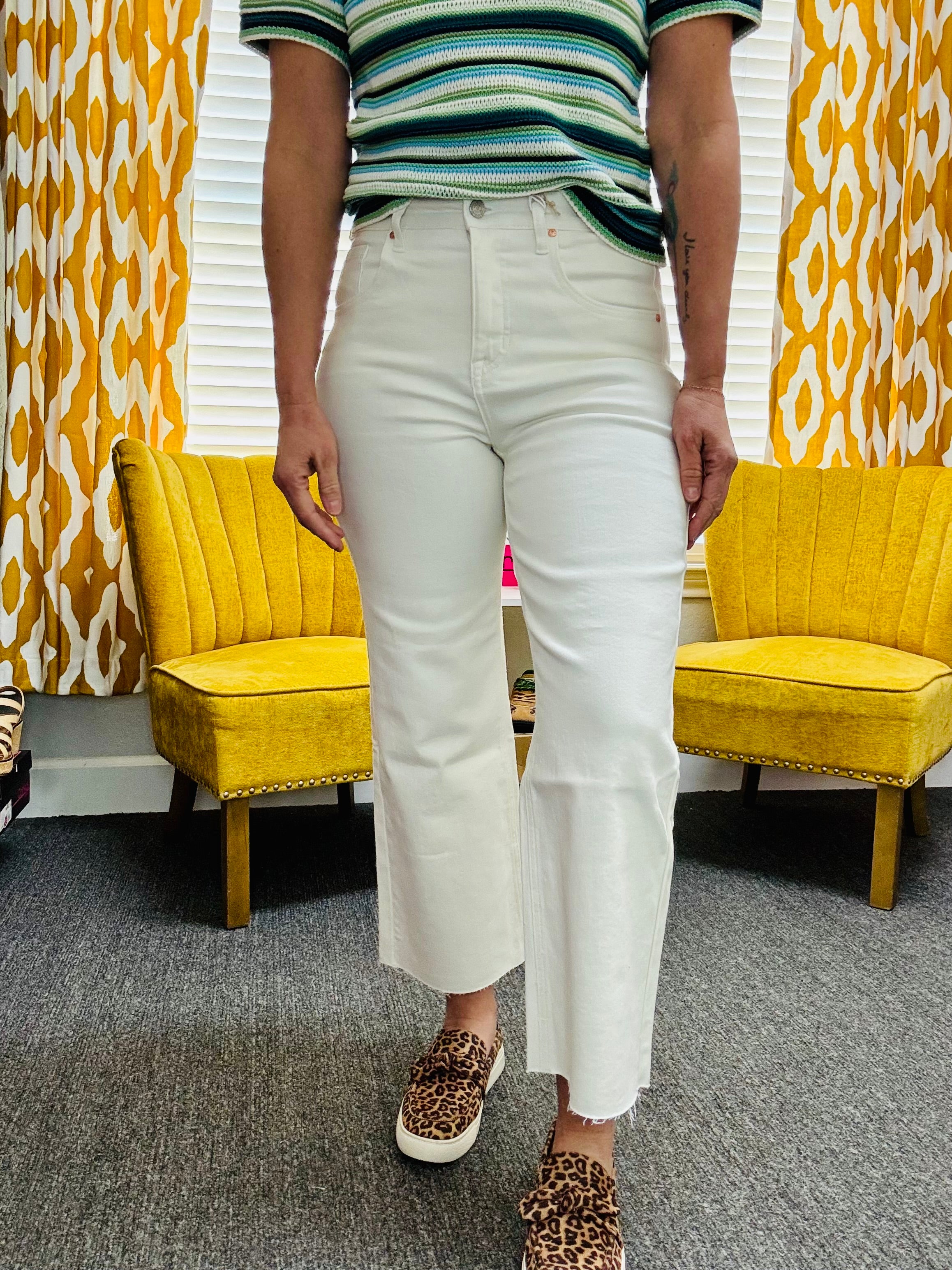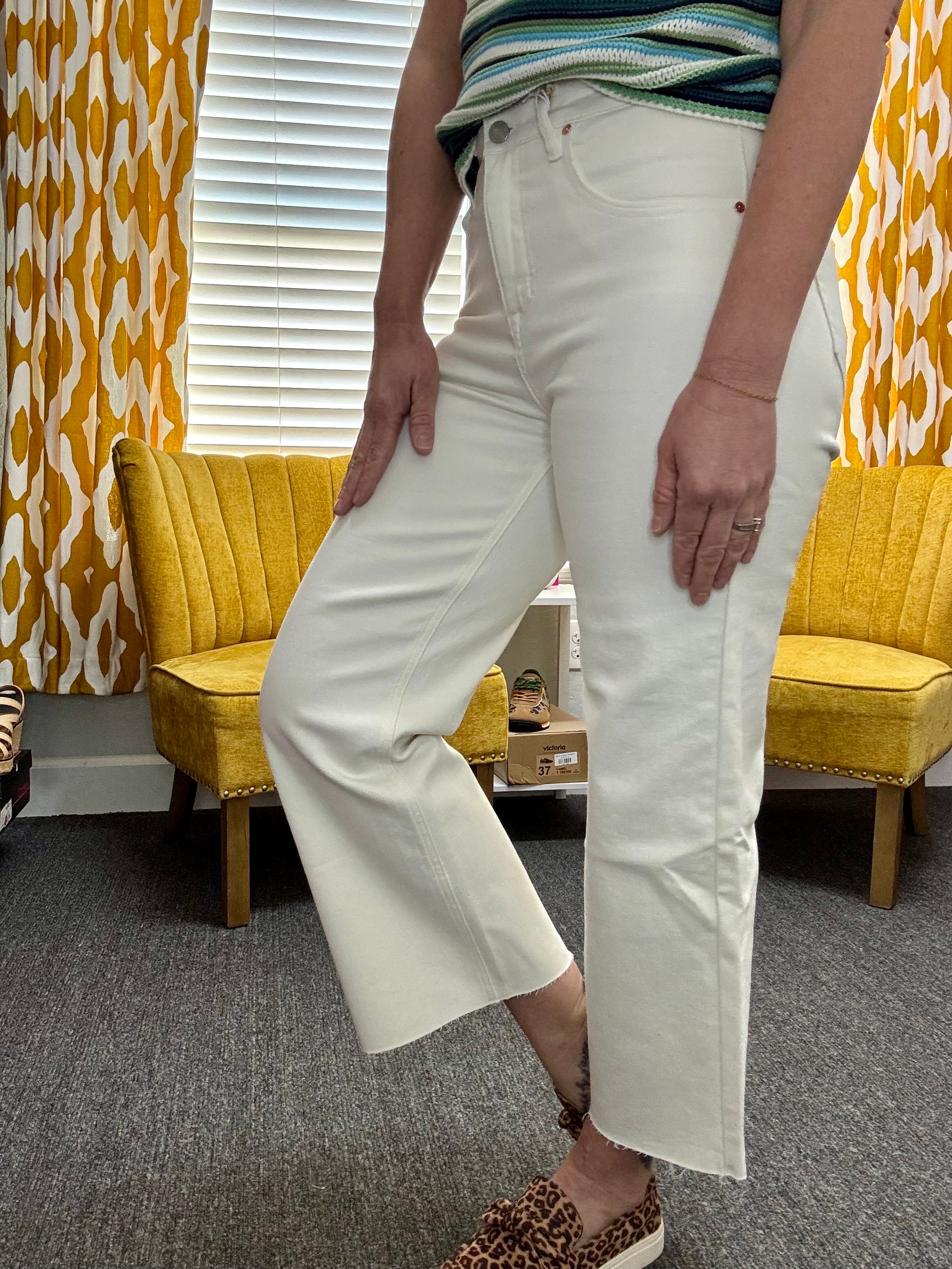 Effortless style meets everyday comfort in the Distressed Drift Jeans. Crafted from stretchy denim, these off-white high rise, cropped wide-leg jeans move with you while keeping their shape, making them perfect for all-day wear.