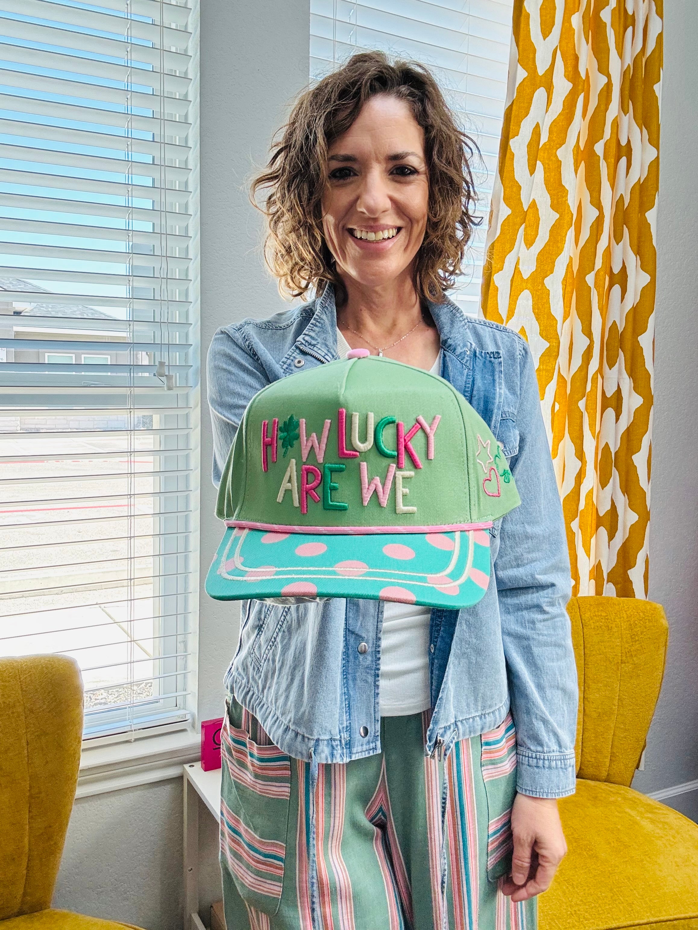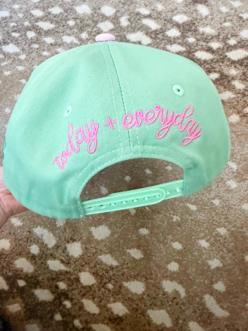 How lucky are we… today & everyday! This fun, feel-good hat is the perfect pop of color. It features a pink and green polka dot bill for the sweetest statement touch. The side embroidery adds even more charm with a stitched star, heart, and clover — little reminders of joy, love, and a bit of luck wherever you go. And on the back? “today & everyday” embroidered as the perfect finishing detail.