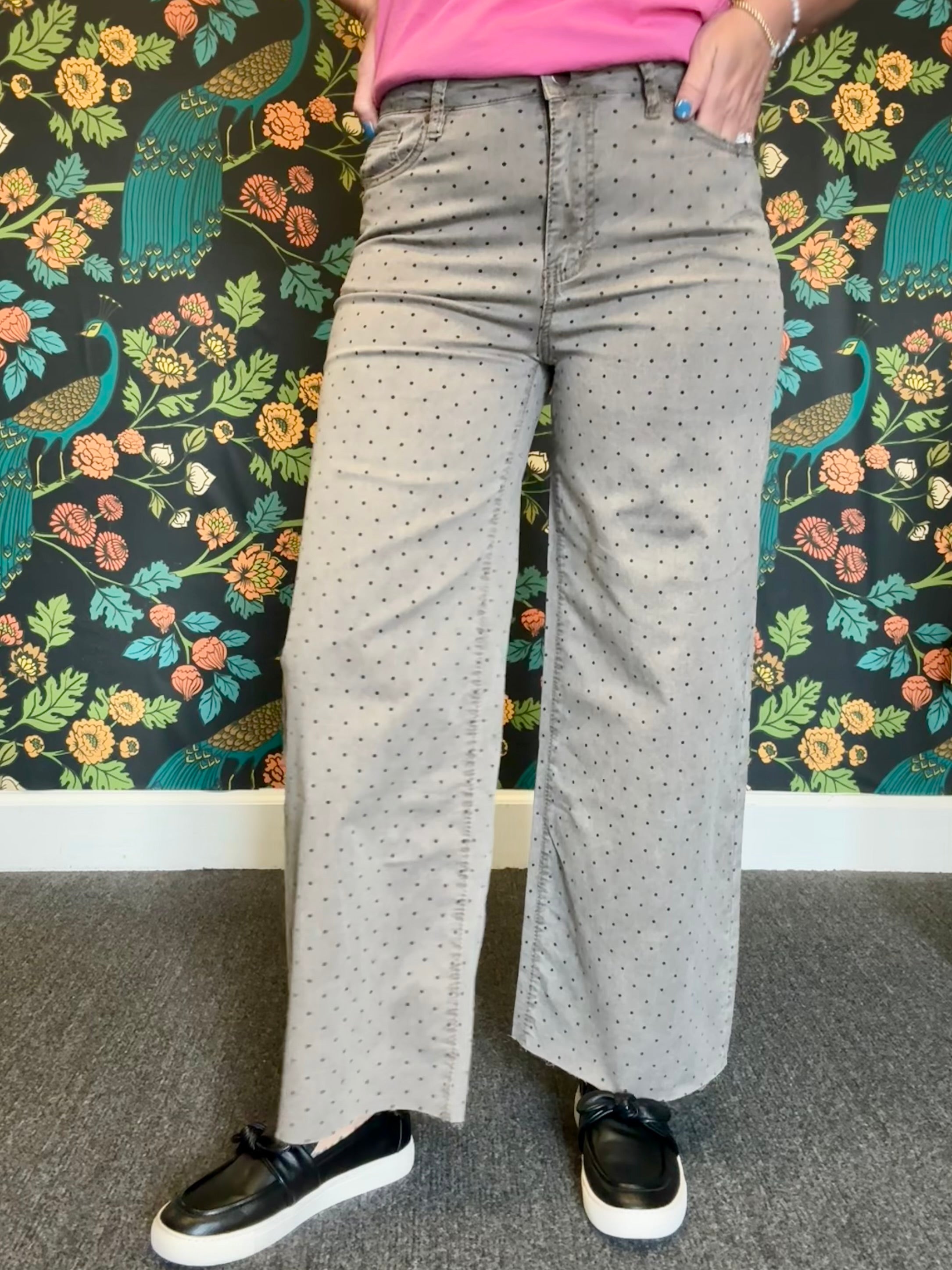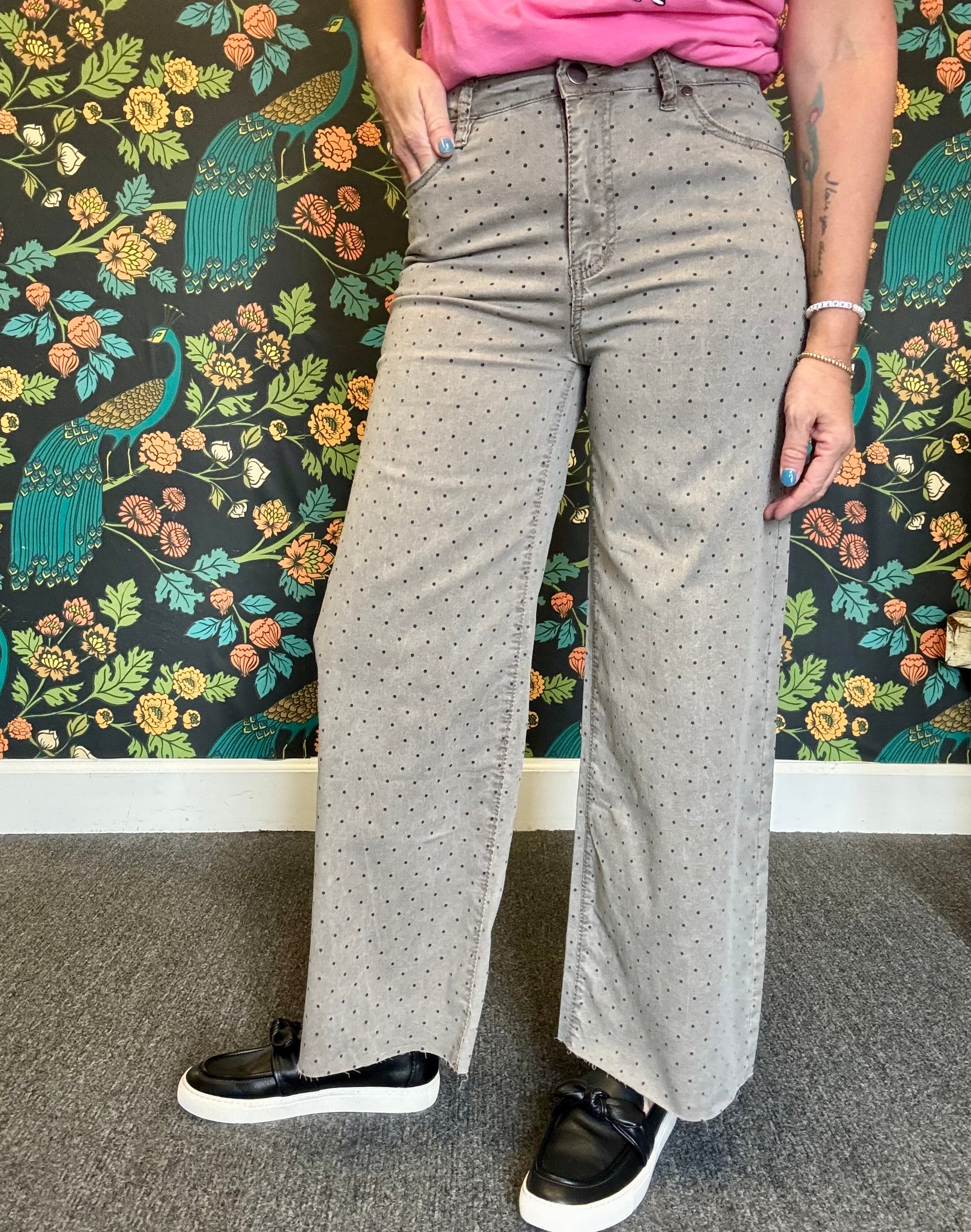 These Polka Dot Pants by Easel blend comfort and style effortlessly. Whether you see them as mocha or gray, their versatile hue pairs well with many outfits. Designed to offer a cozy fit for all-day wear. They feature a raw edge hem, allowing you to easily customize the length to suit your style.