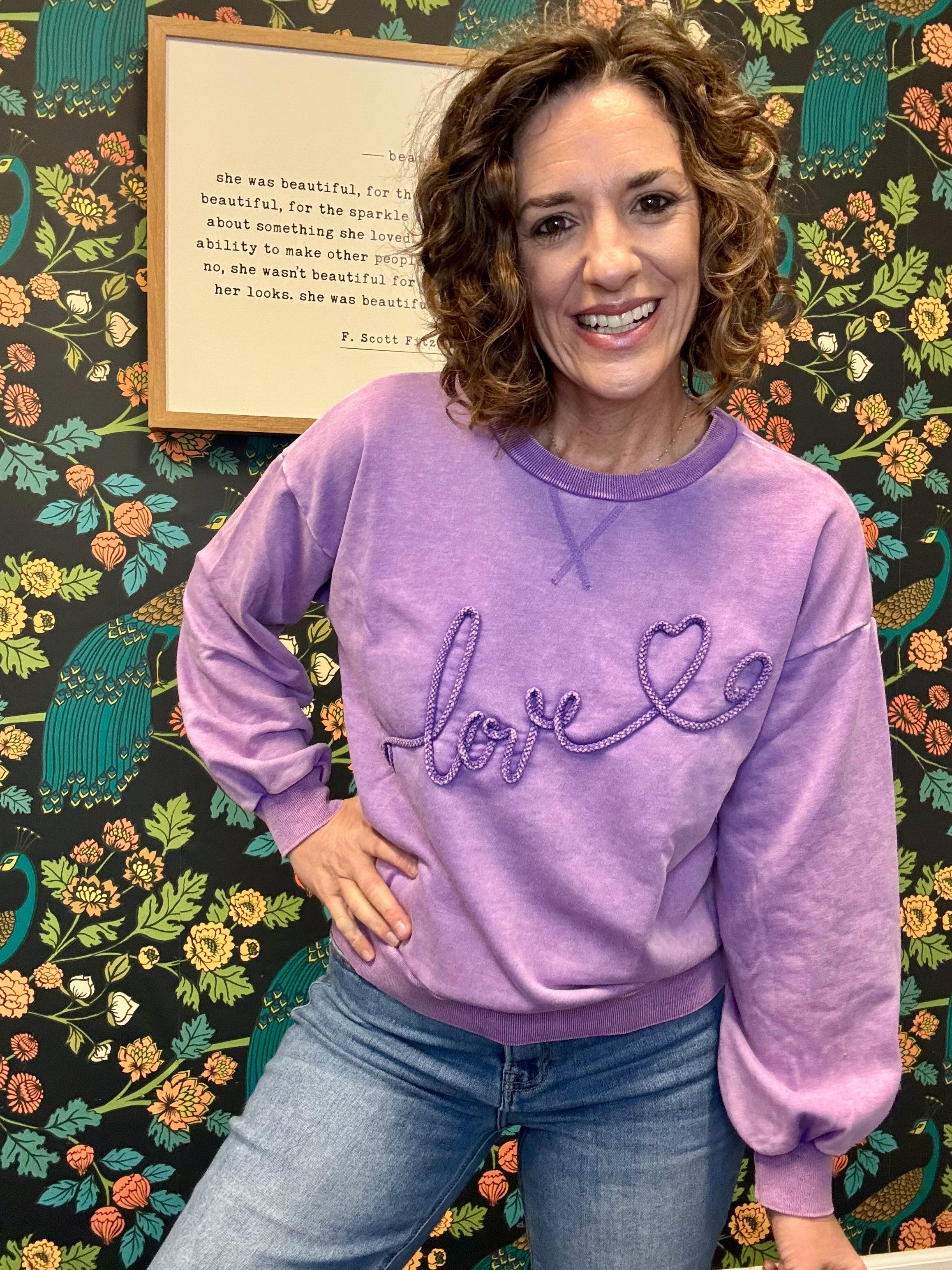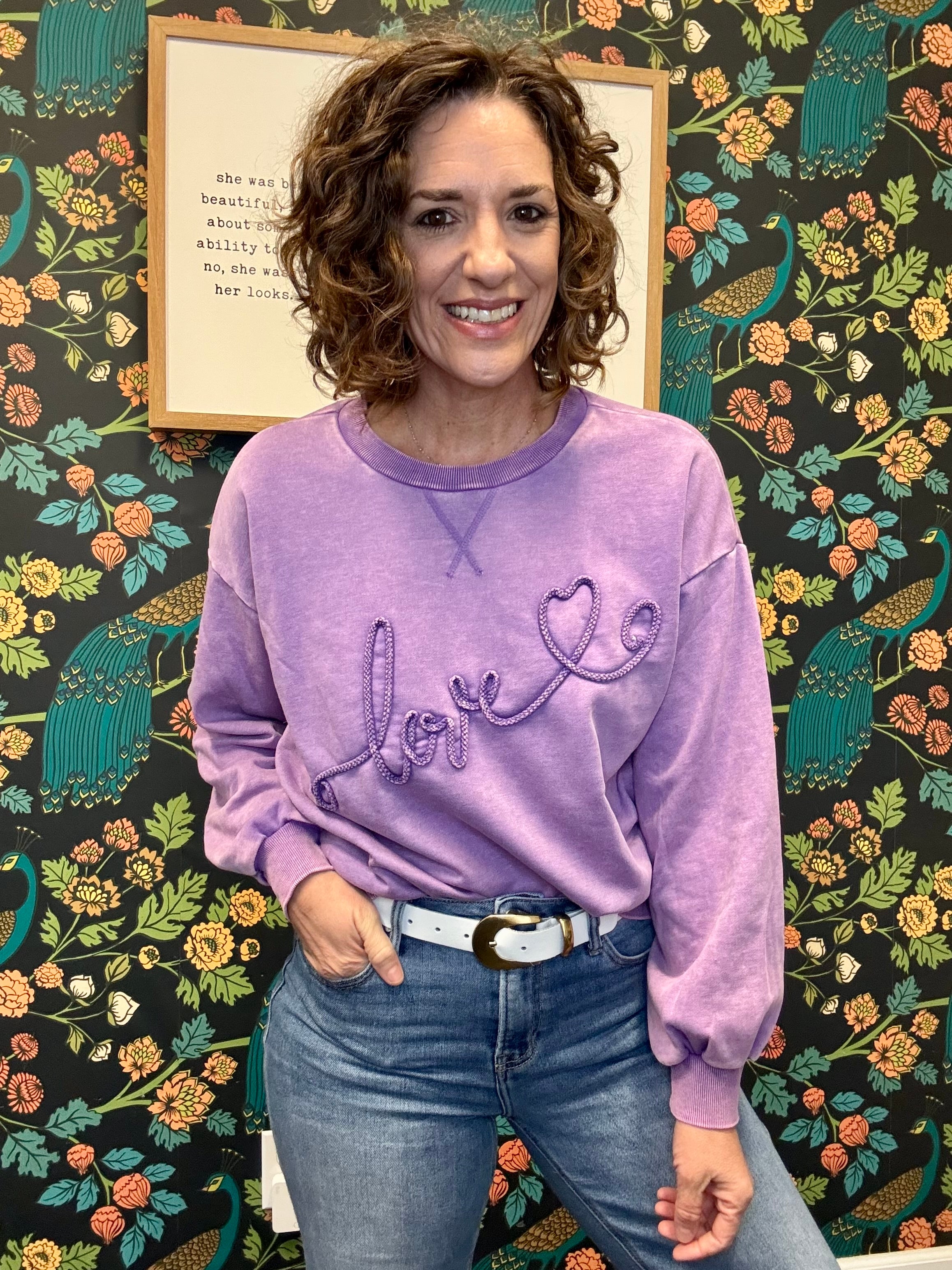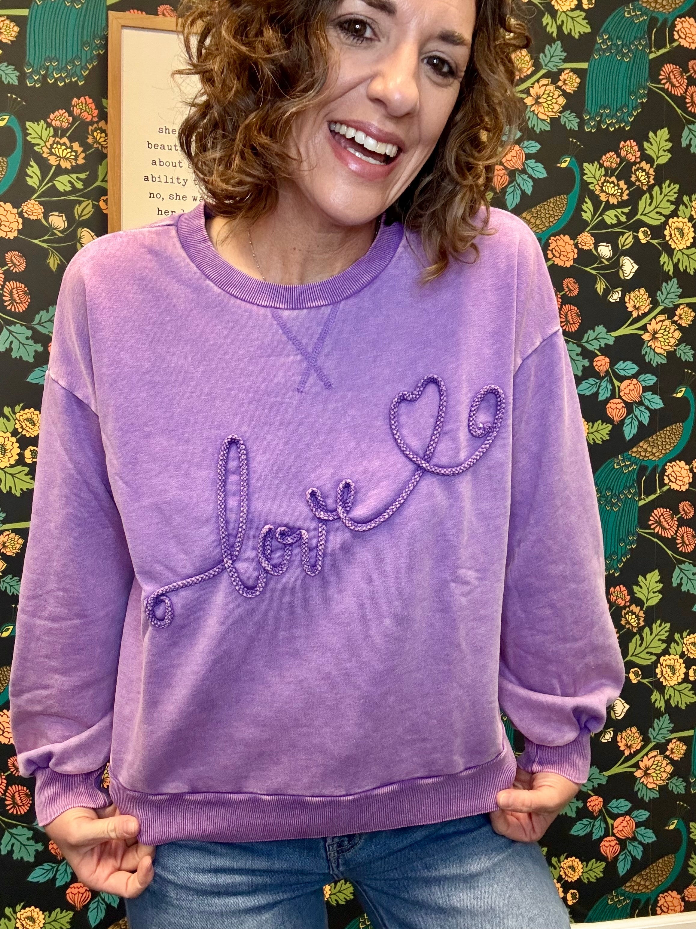 Cozy, cheerful, and made to spread the love. The Purple Love Pullover features textured rope embroidery spelling “LOVE” across the front for a fun, feel-good touch. Crafted in washed terry fabric with a relaxed fit and dropped shoulders, it’s perfect for everyday wear. Finished with a classic crew neckline and ribbed cuffs and hemline, this pullover is comfy, casual, and easy to style — a true grab-and-go favorite you’ll reach for again and again.