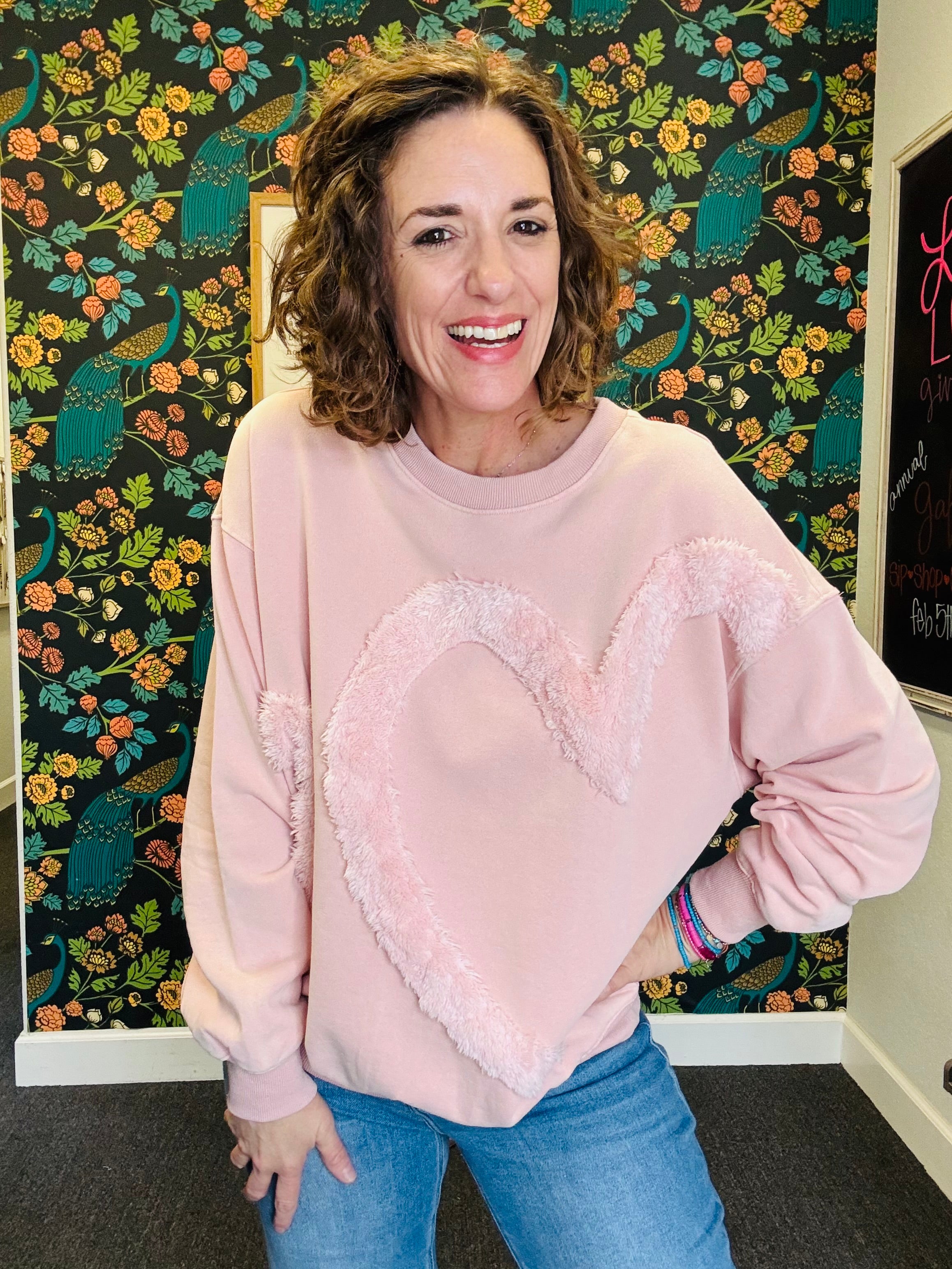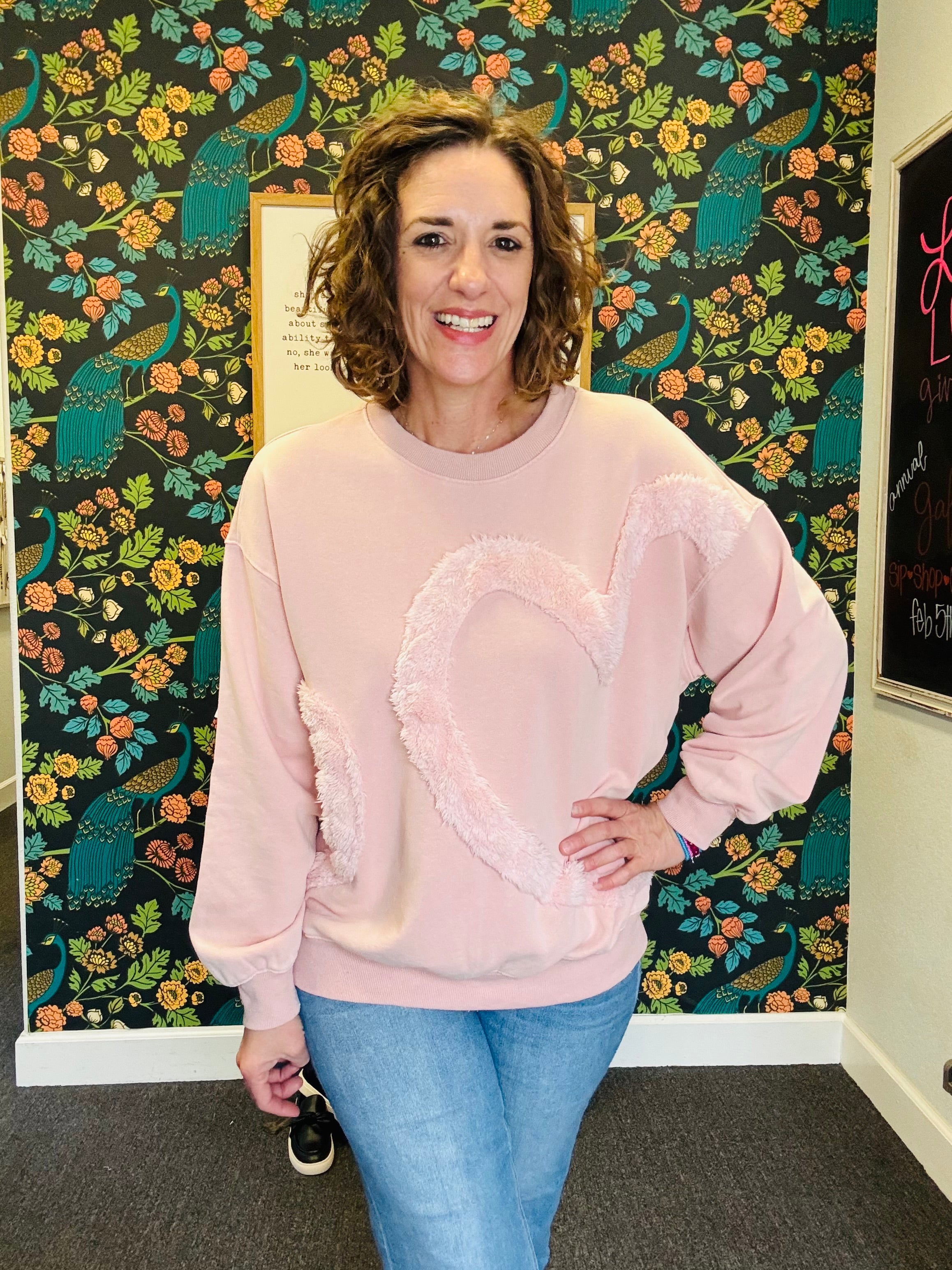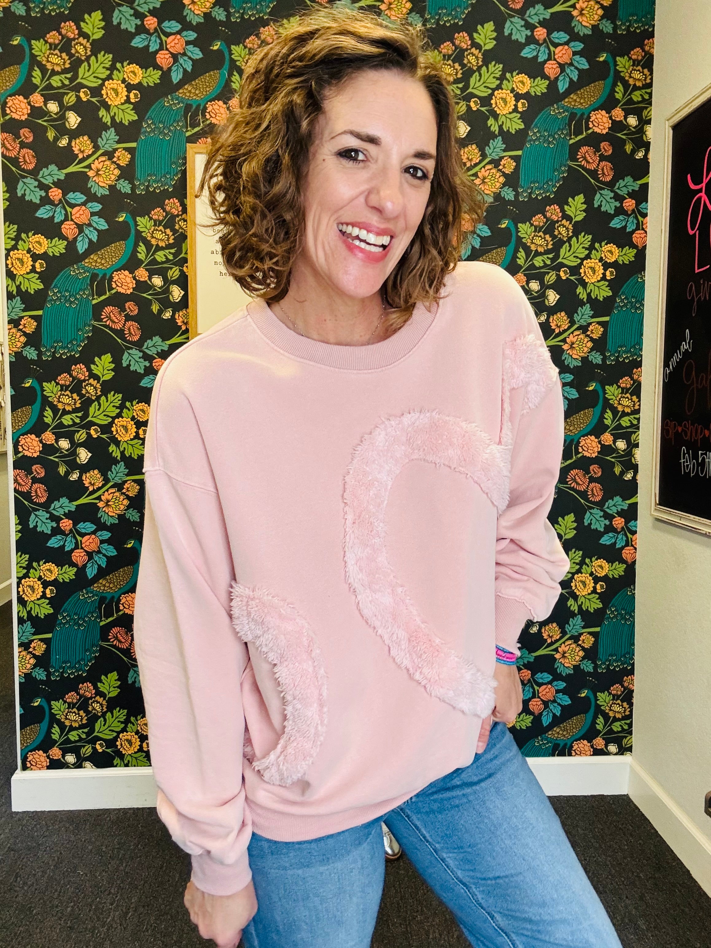 Soft, cozy, and full of charm! The Rosé All Day Heart Pullover features a fuzzy heart detail on the front for a playful, sweet touch. Crafted in washed terry fabric with a relaxed, oversized fit and dropped shoulders, it’s perfect for lounging, layering, or adding a little fun to your everyday look. Finished with a ribbed crew neck, this pullover is the ultimate mix of comfy and cute — wear it all day, every day!