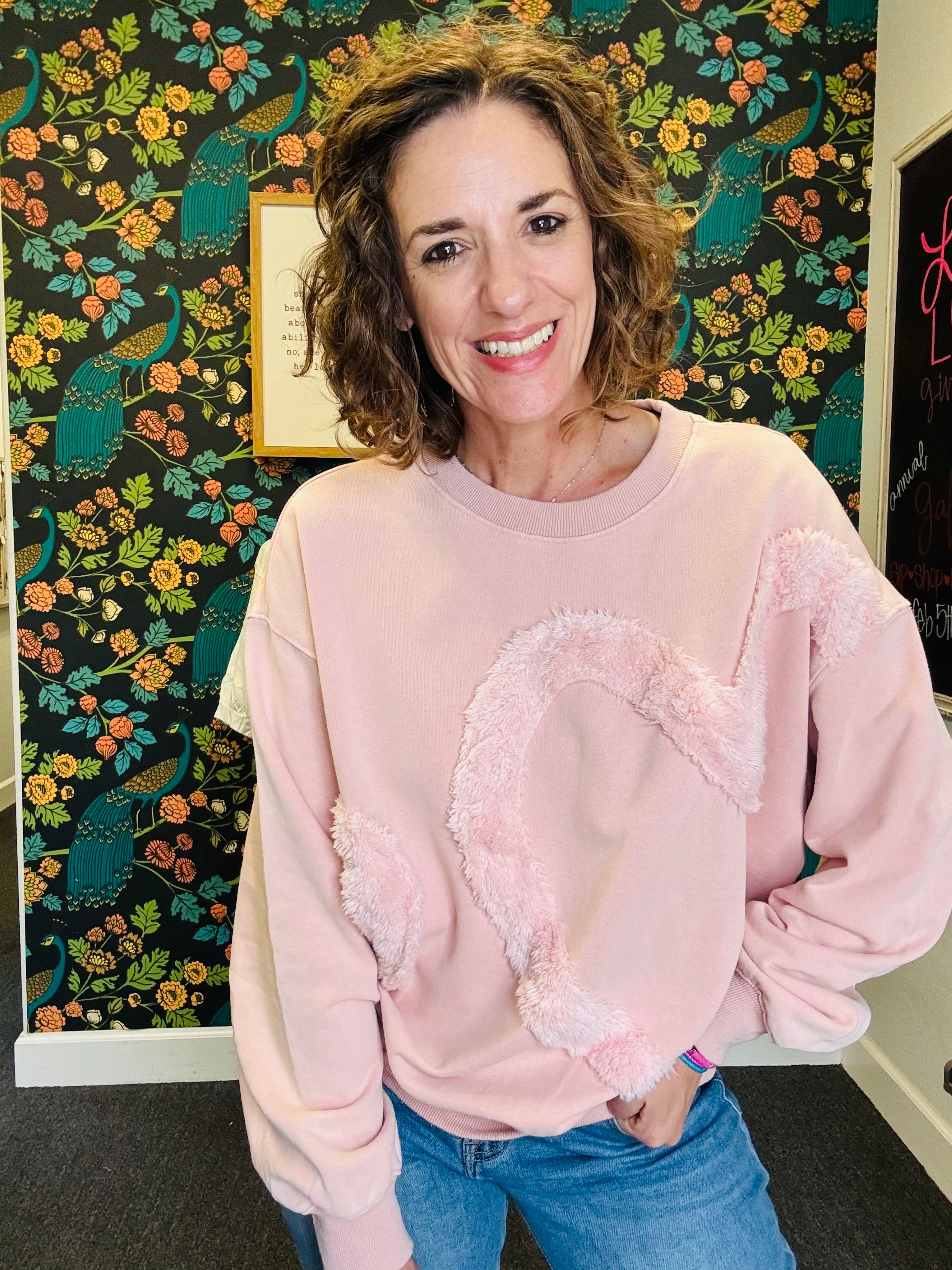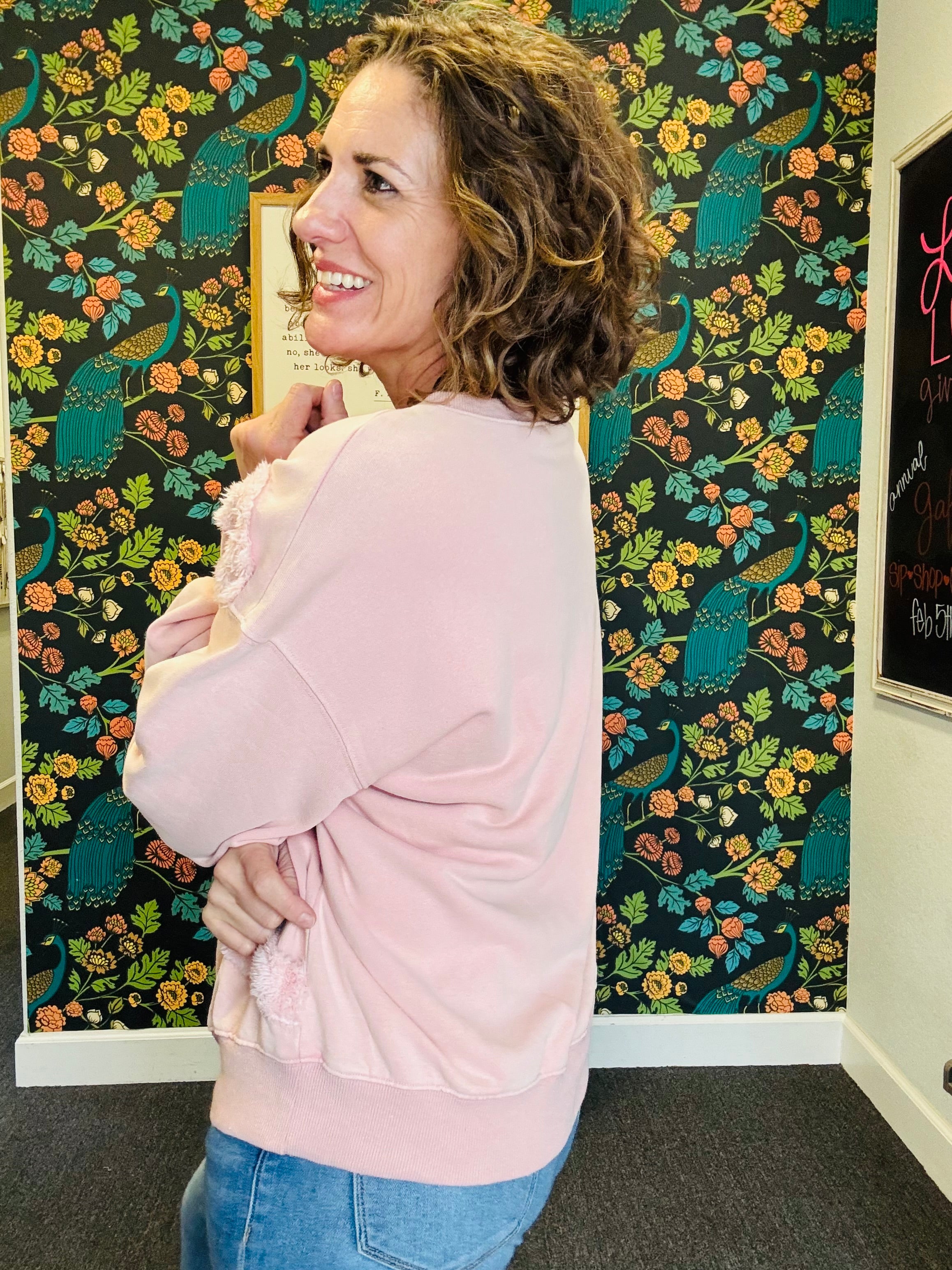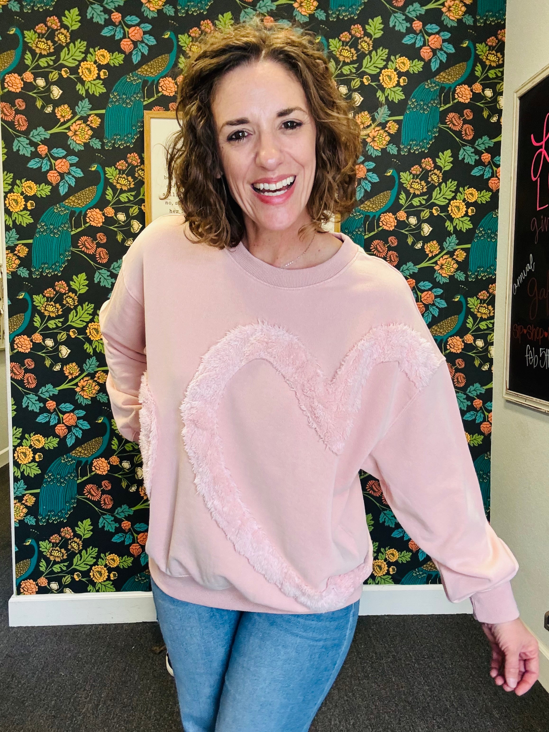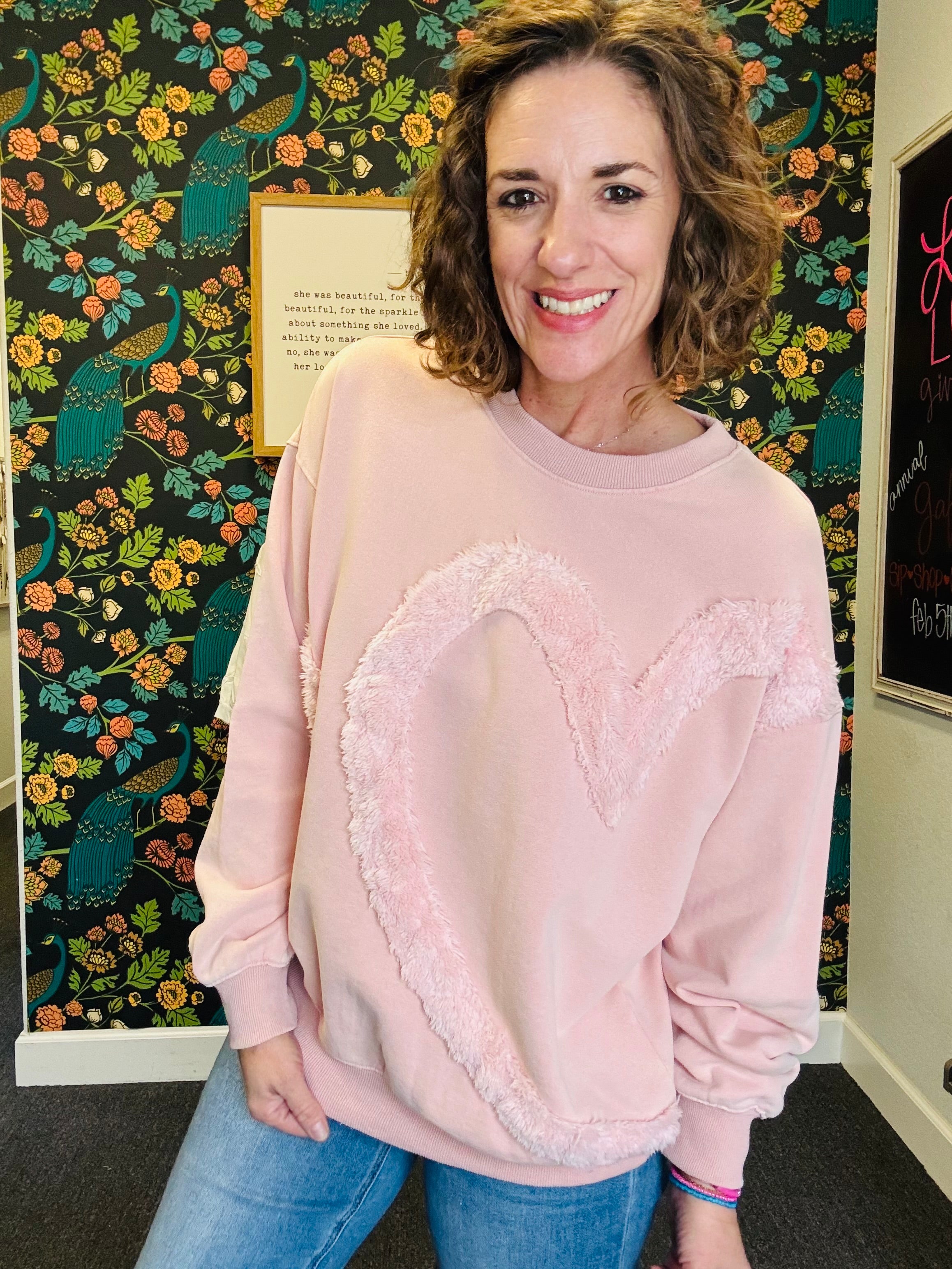 Soft, cozy, and full of charm! The Rosé All Day Heart Pullover features a fuzzy heart detail on the front for a playful, sweet touch. Crafted in washed terry fabric with a relaxed, oversized fit and dropped shoulders, it’s perfect for lounging, layering, or adding a little fun to your everyday look. Finished with a ribbed crew neck, this pullover is the ultimate mix of comfy and cute — wear it all day, every day!