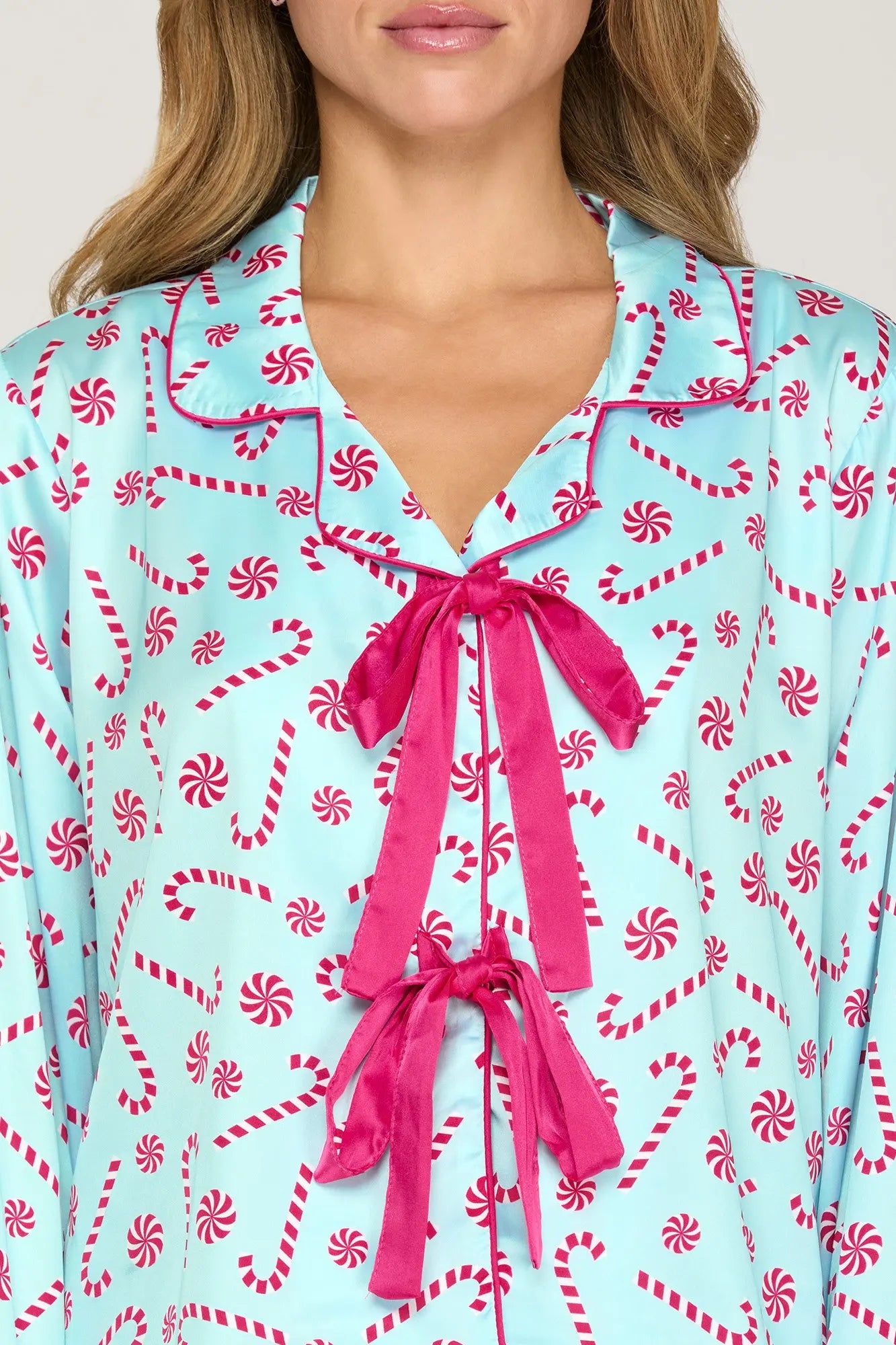 Snuggle up in style with the Peppermint Kisses Pajama Set! This festive set features a light blue long-sleeve top and matching shorts with an elastic waist for all-night comfort. Adorned with pink bows and a playful candy cane and peppermint print, it’s the perfect mix of cozy, cute, and holiday-ready. Sweet dreams never looked so adorable!