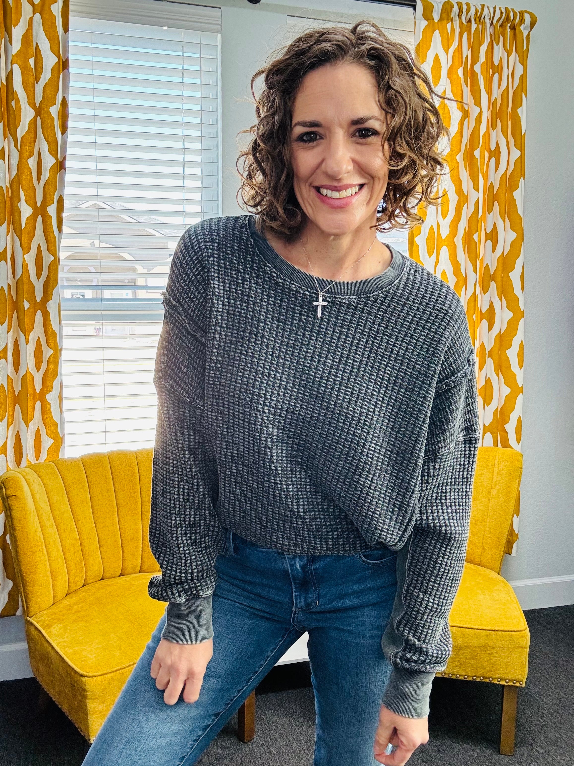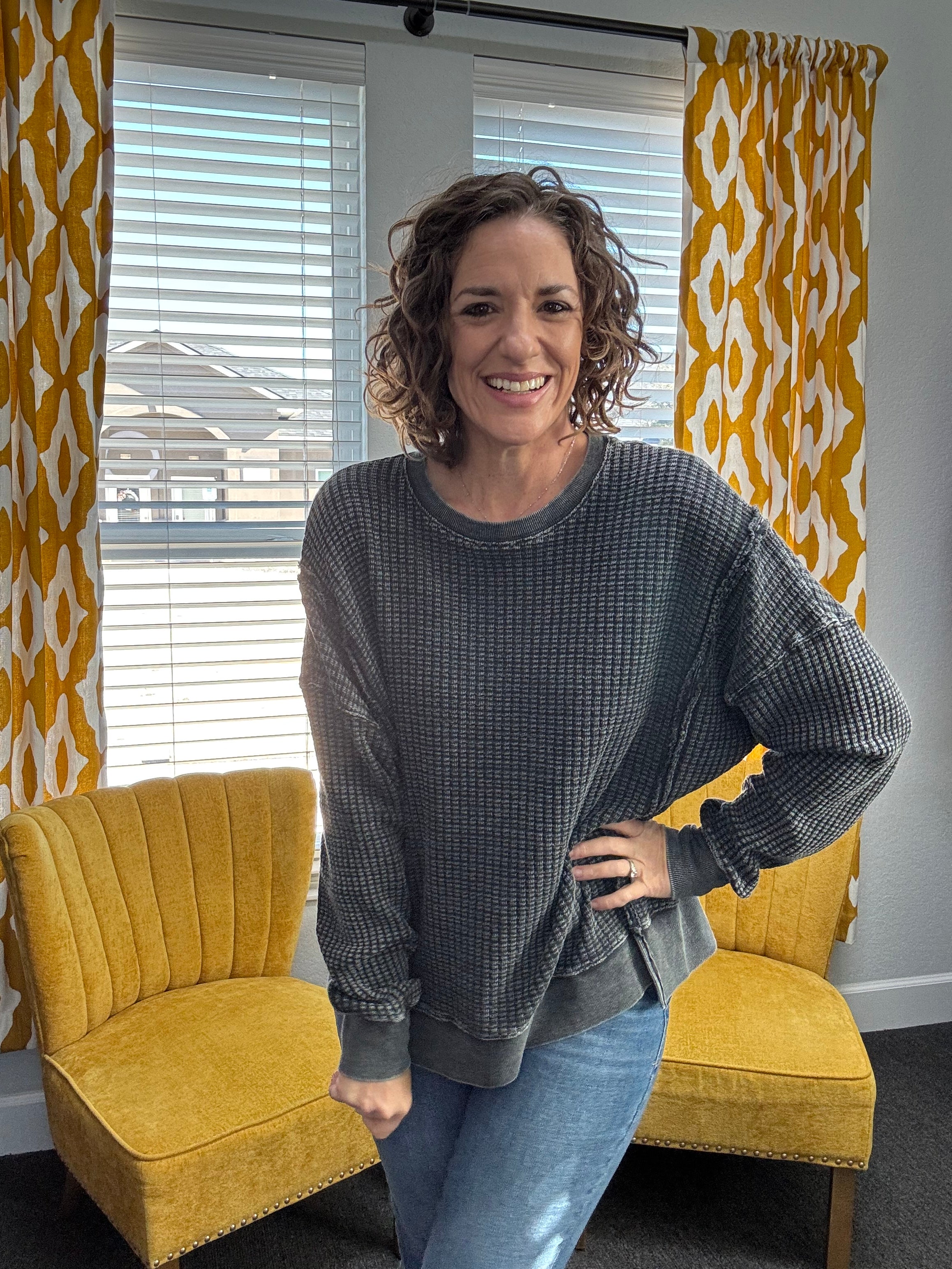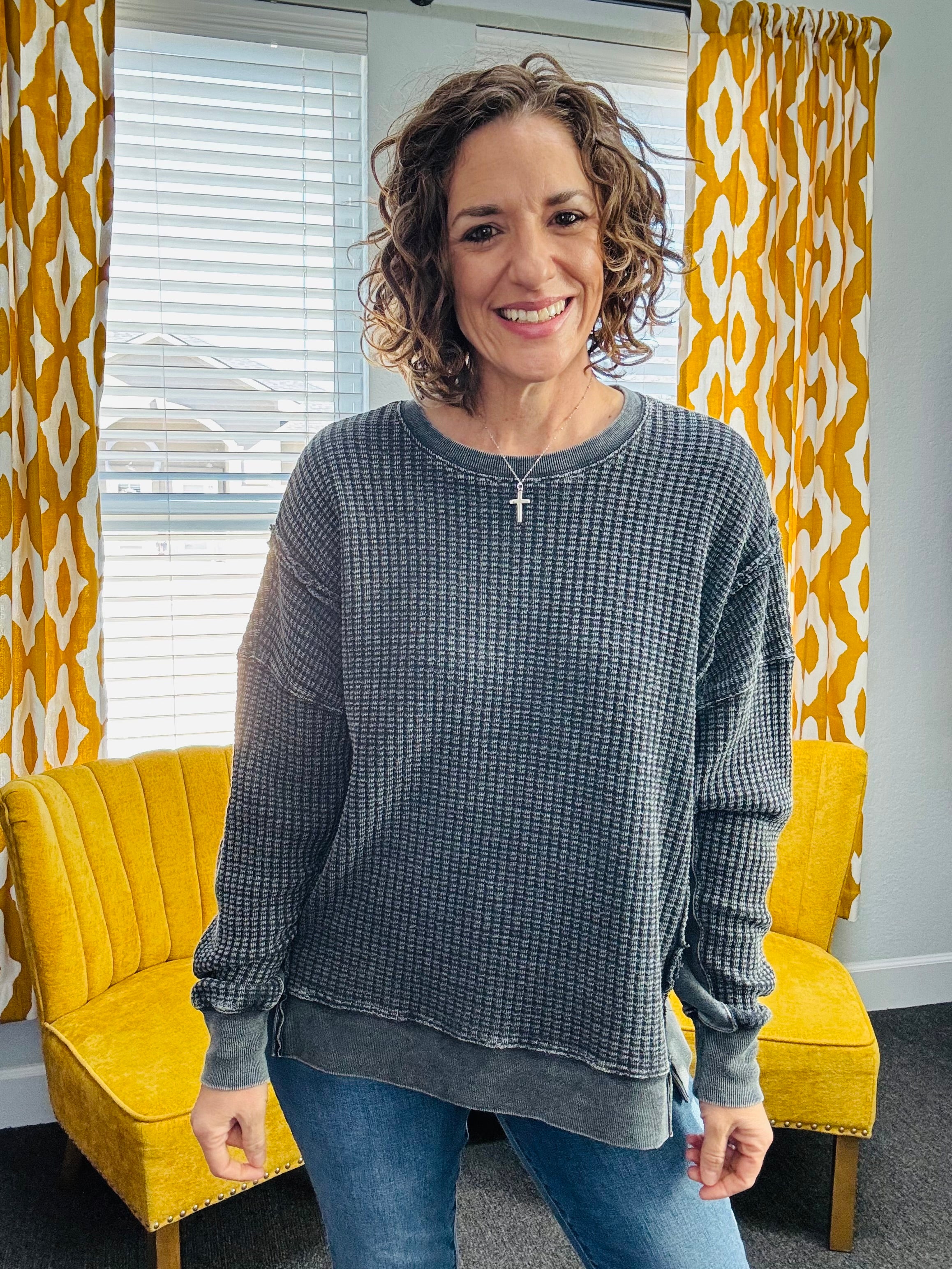 Easy, cozy, and perfectly lived-in. The Slow Morning Black Pullover features a mineral-washed finish with raw, defined seams for that relaxed, effortless look. Designed with a oversized comfy fit, side slits, and a slightly uneven hem, it’s made for movement and all-day wear. Ribbed sleeve bands and hem add subtle structure while keeping things soft and cozy.