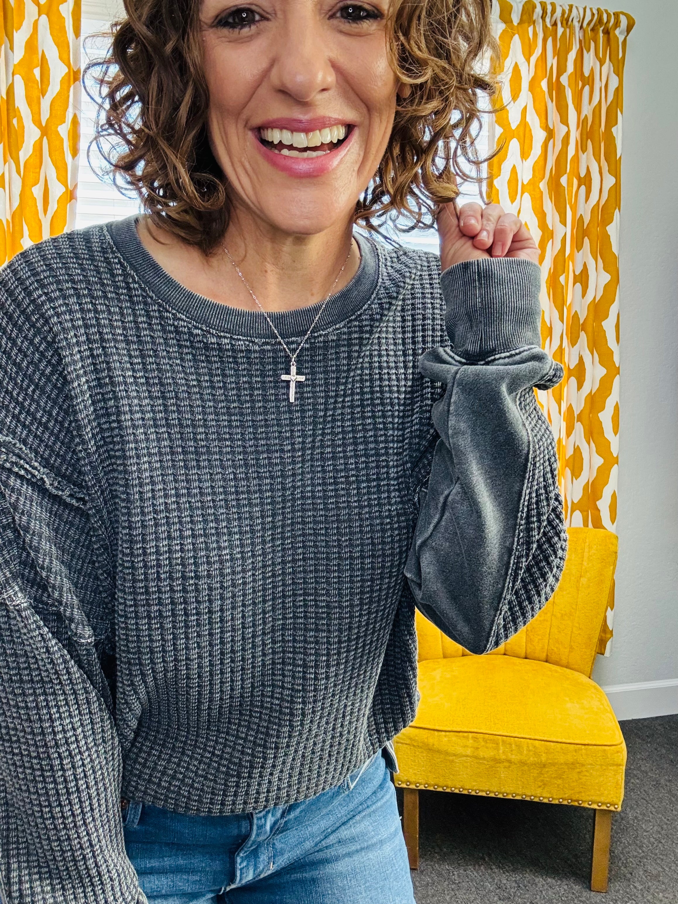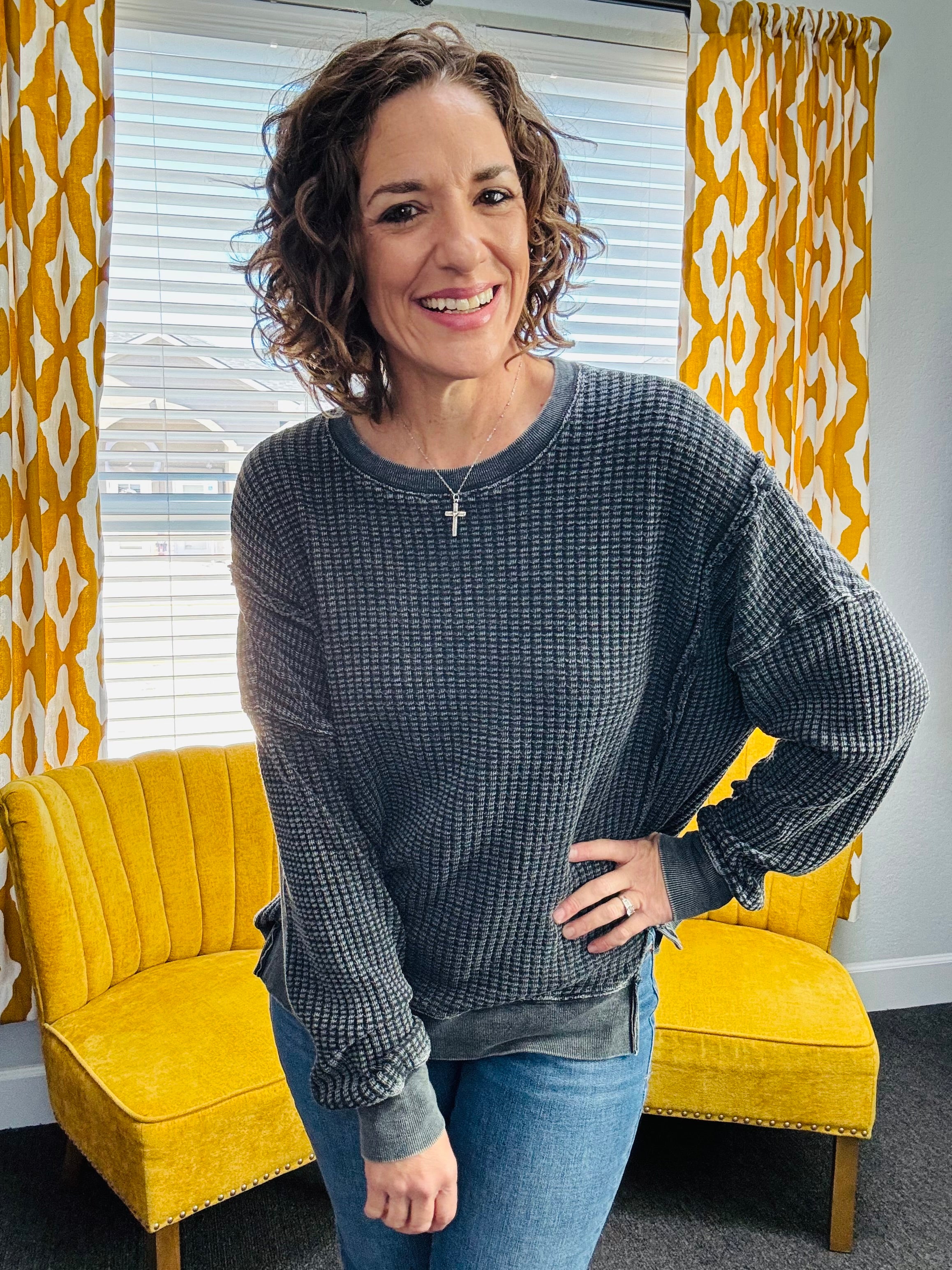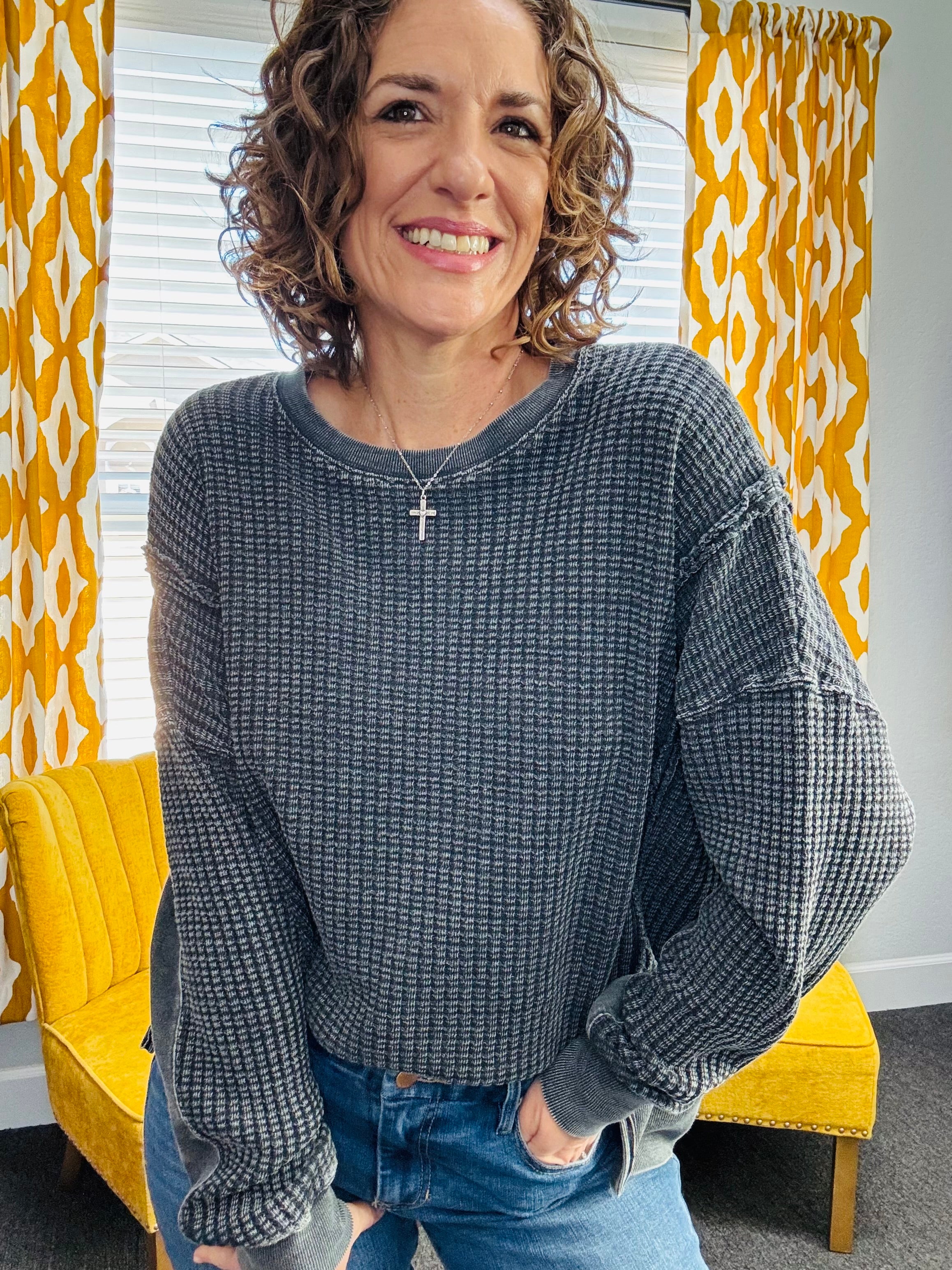 Easy, cozy, and perfectly lived-in. The Slow Morning Black Pullover features a mineral-washed finish with raw, defined seams for that relaxed, effortless look. Designed with a oversized comfy fit, side slits, and a slightly uneven hem, it’s made for movement and all-day wear. Ribbed sleeve bands and hem add subtle structure while keeping things soft and cozy.
