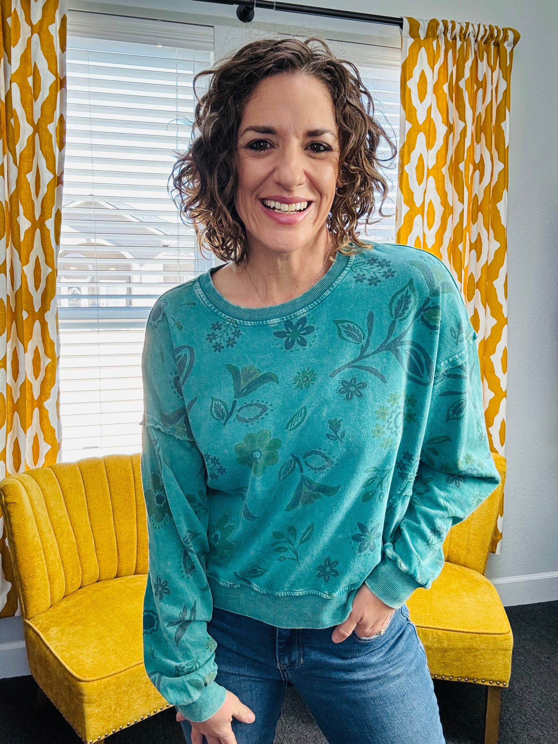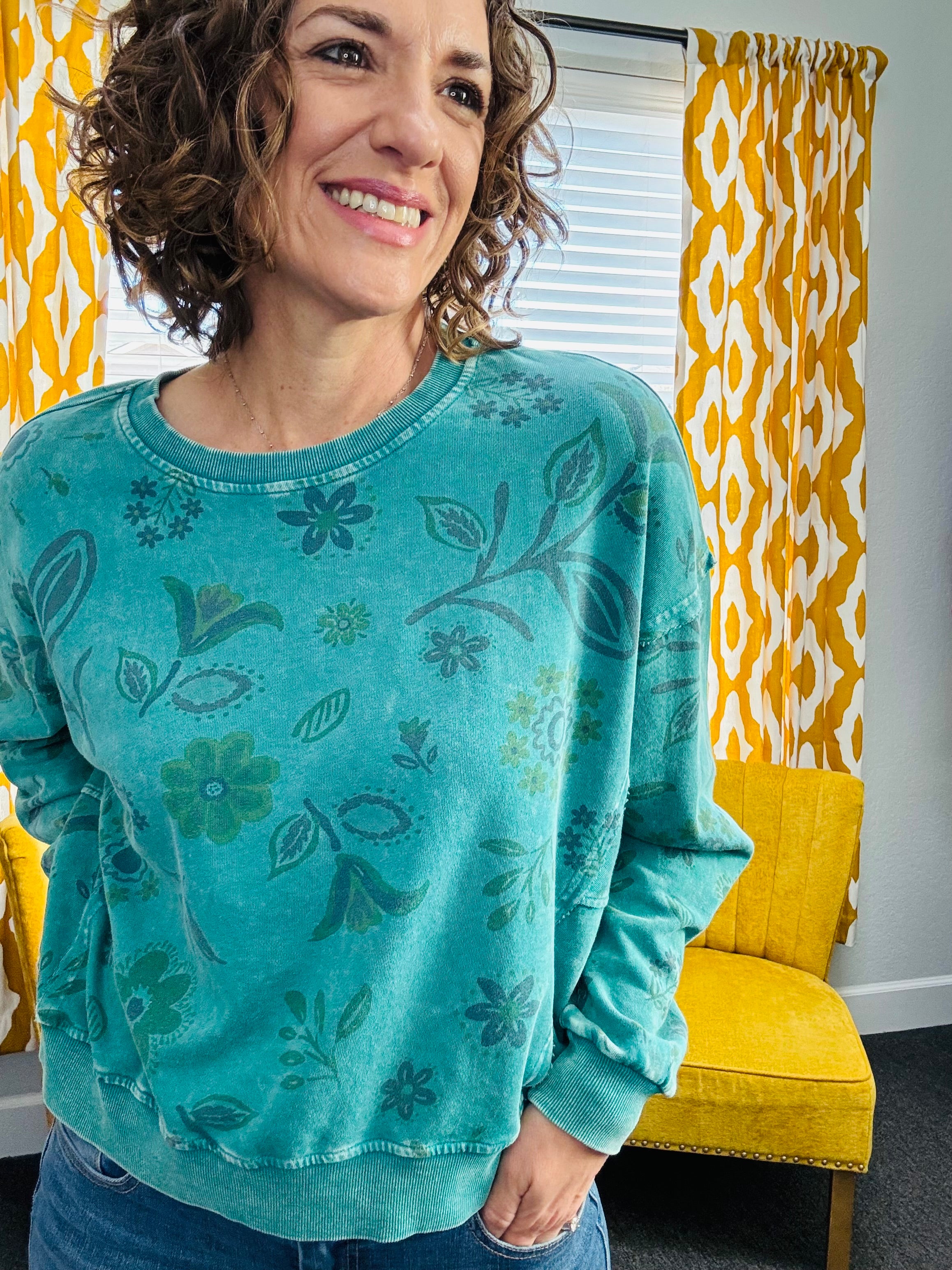 Soft, cozy, and effortlessly cute. The Teal Wildflower Pullover features a washed teal floral print on comfy terry fabric with a relaxed, oversized fit that’s perfect for everyday wear. Designed with a classic crew neckline and finished with ribbed cuffs and hem, it delivers that laid-back, lived-in feel you love. Easy to style and even easier to wear — pair it with our comfy jeans for a casual OOTD that feels just as good as it looks.
