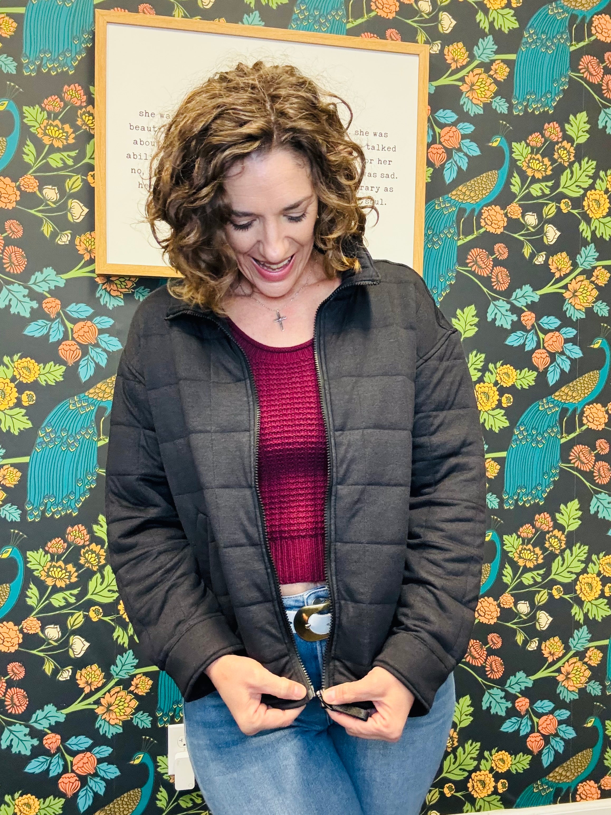 Meet your new go-to layer. Our Indiana Jacket features a full front zipper for easy on-and-off wear, relaxed drop shoulders for that perfectly laid-back look, and convenient side pockets you’ll actually use. Crafted from a soft, cozy fabric, this black jacket is effortless to throw on and easy to style—perfect for everyday errands, casual outings, and staying comfortable without sacrificing style.