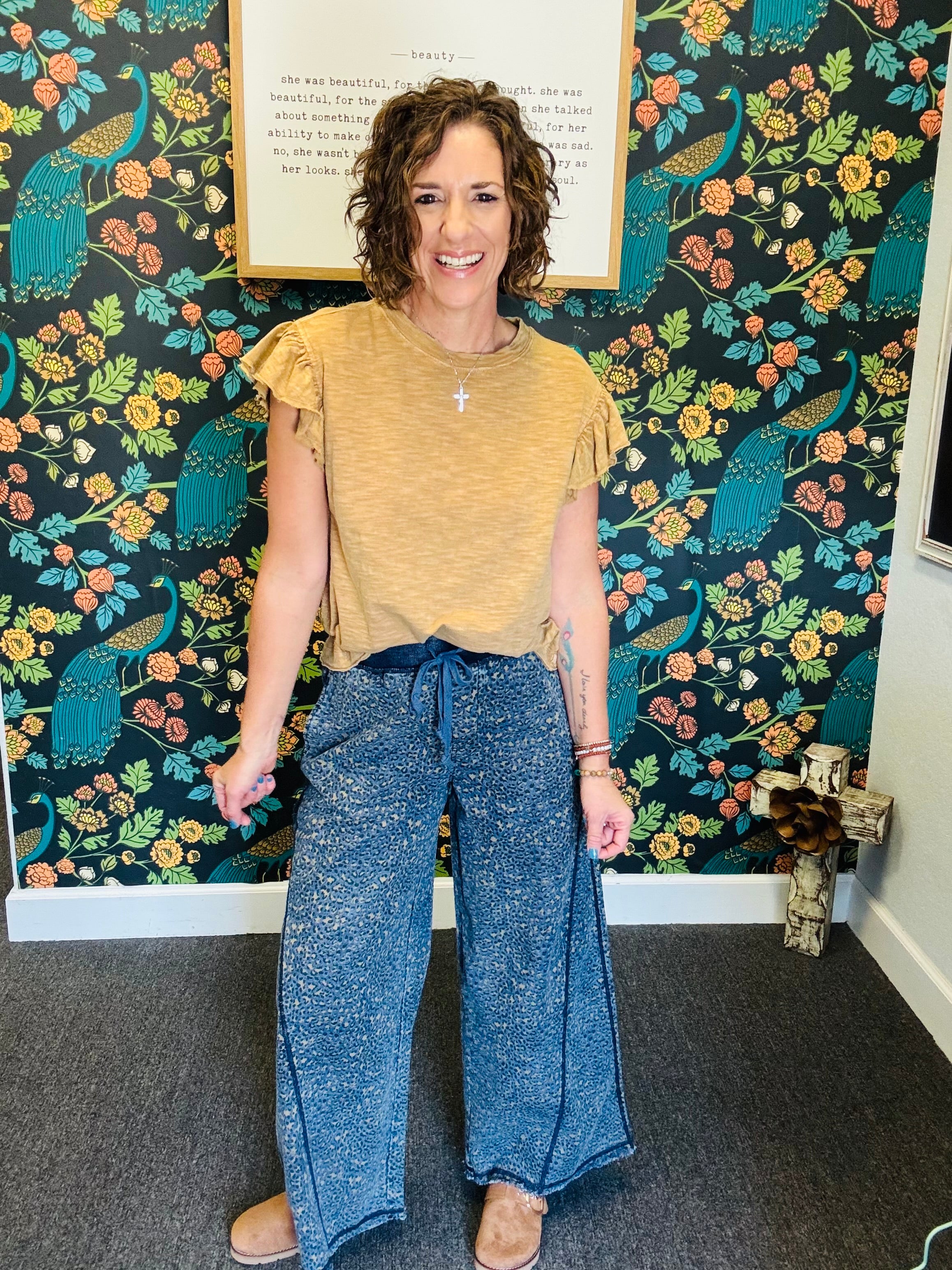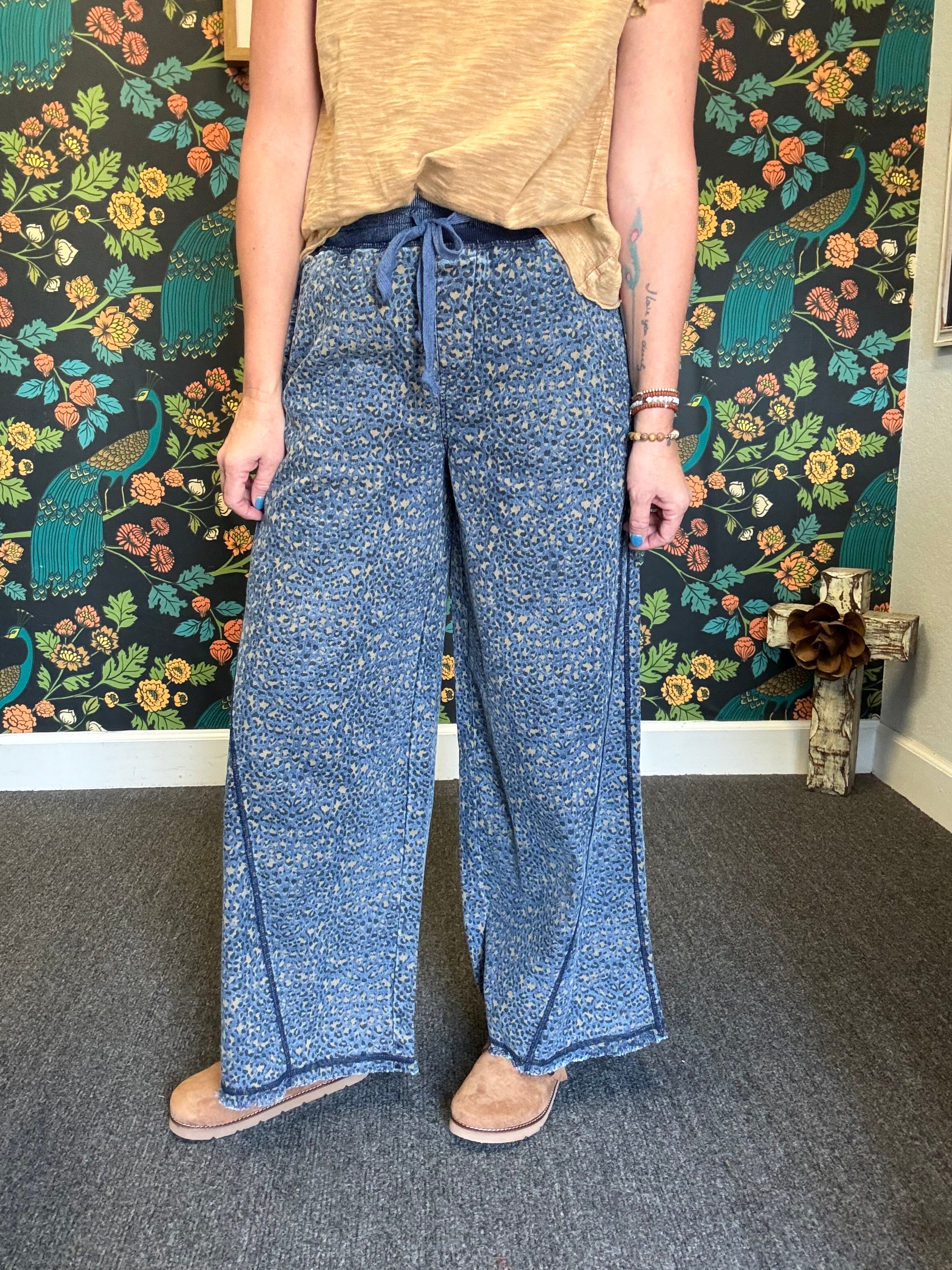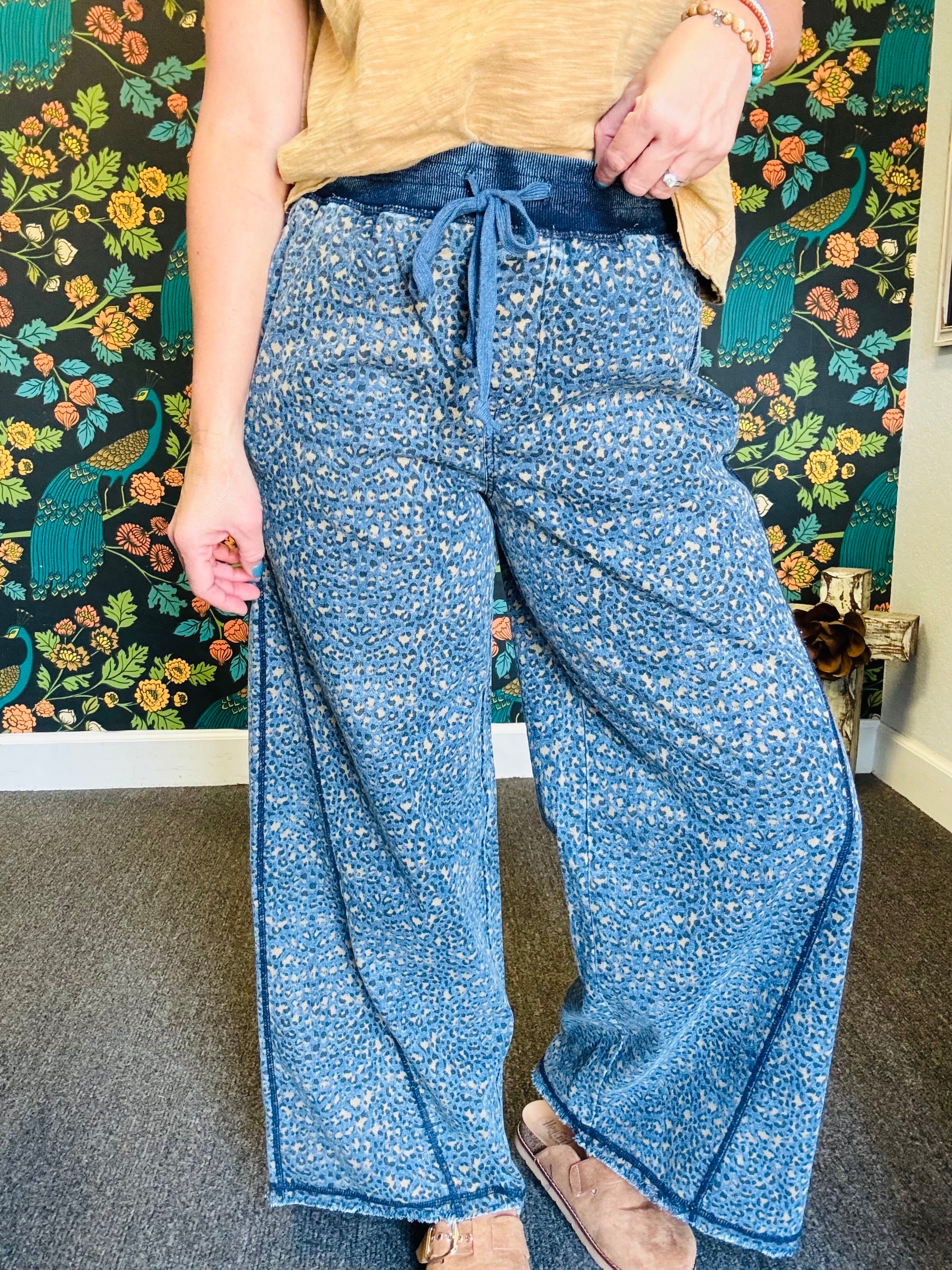 Bring a wild twist to your wardrobe with these Denim Animal Pants. Featuring a comfy elastic waistband with an adjustable drawstring, relaxed wide legs, and a cropped fit with edgy raw frayed hems, they combine comfort and playful style. Handy side pockets add a practical touch. For a complete look, pair them with our Vintage Sahara Top and let your adventurous spirit shine.