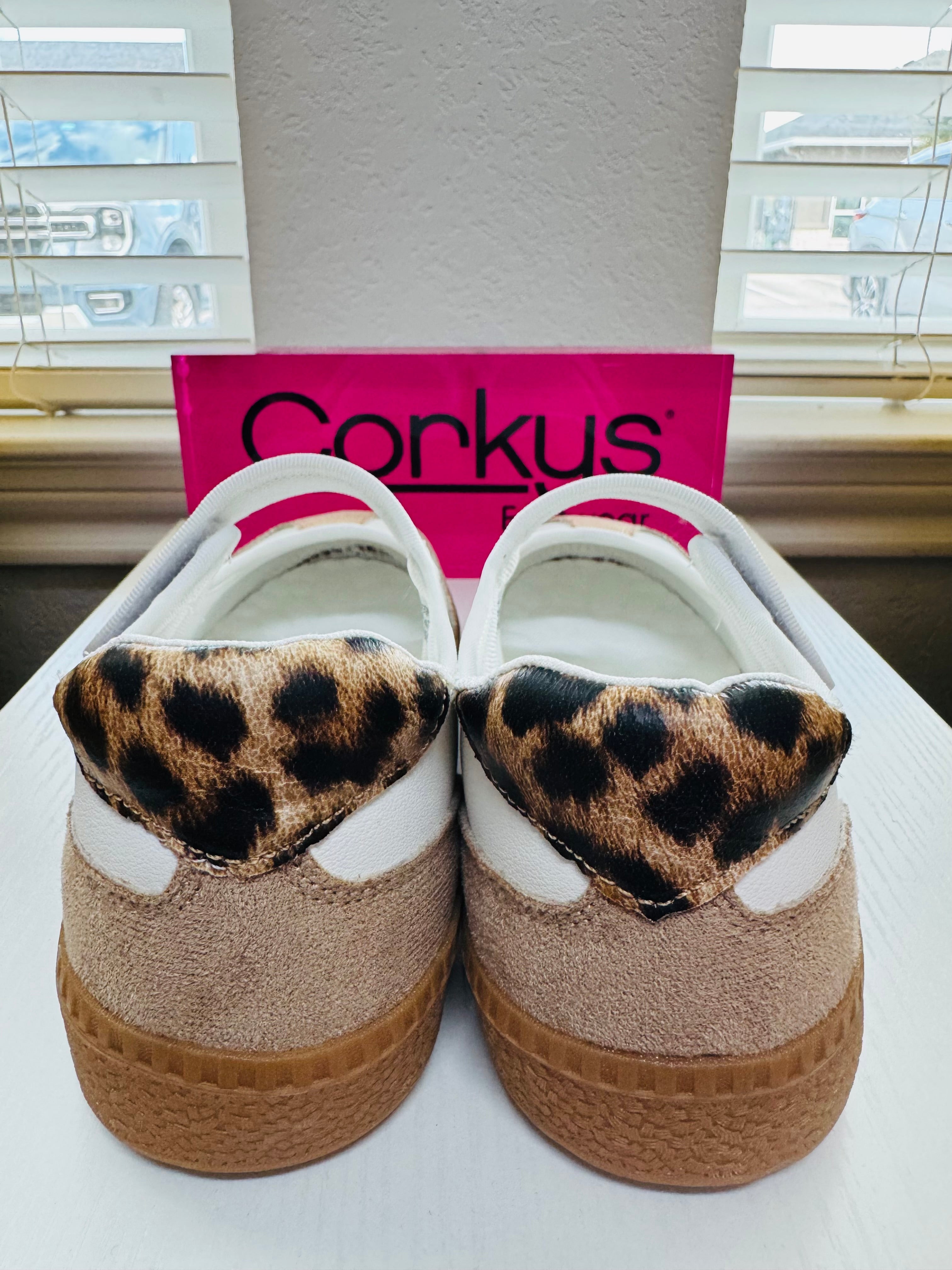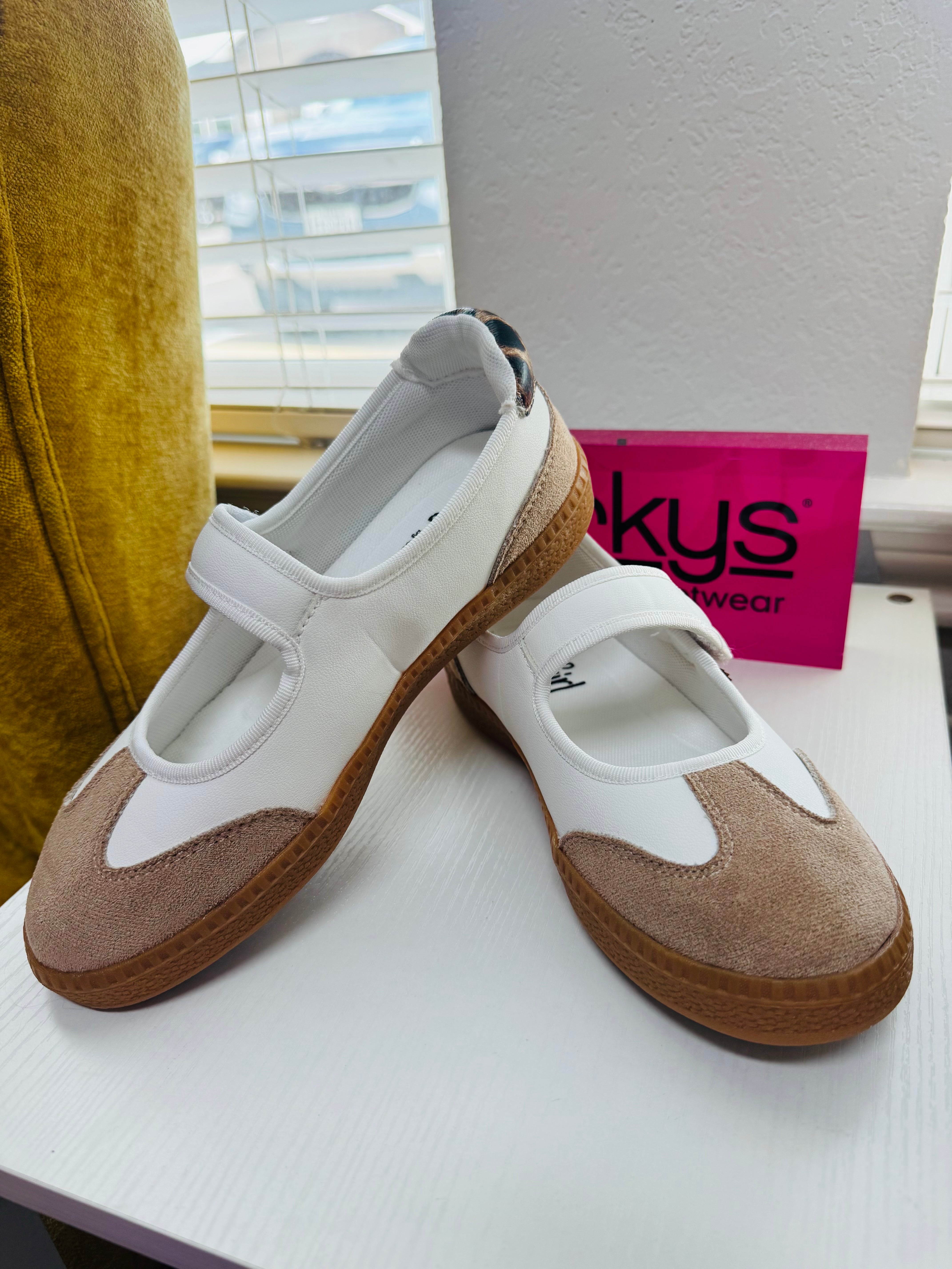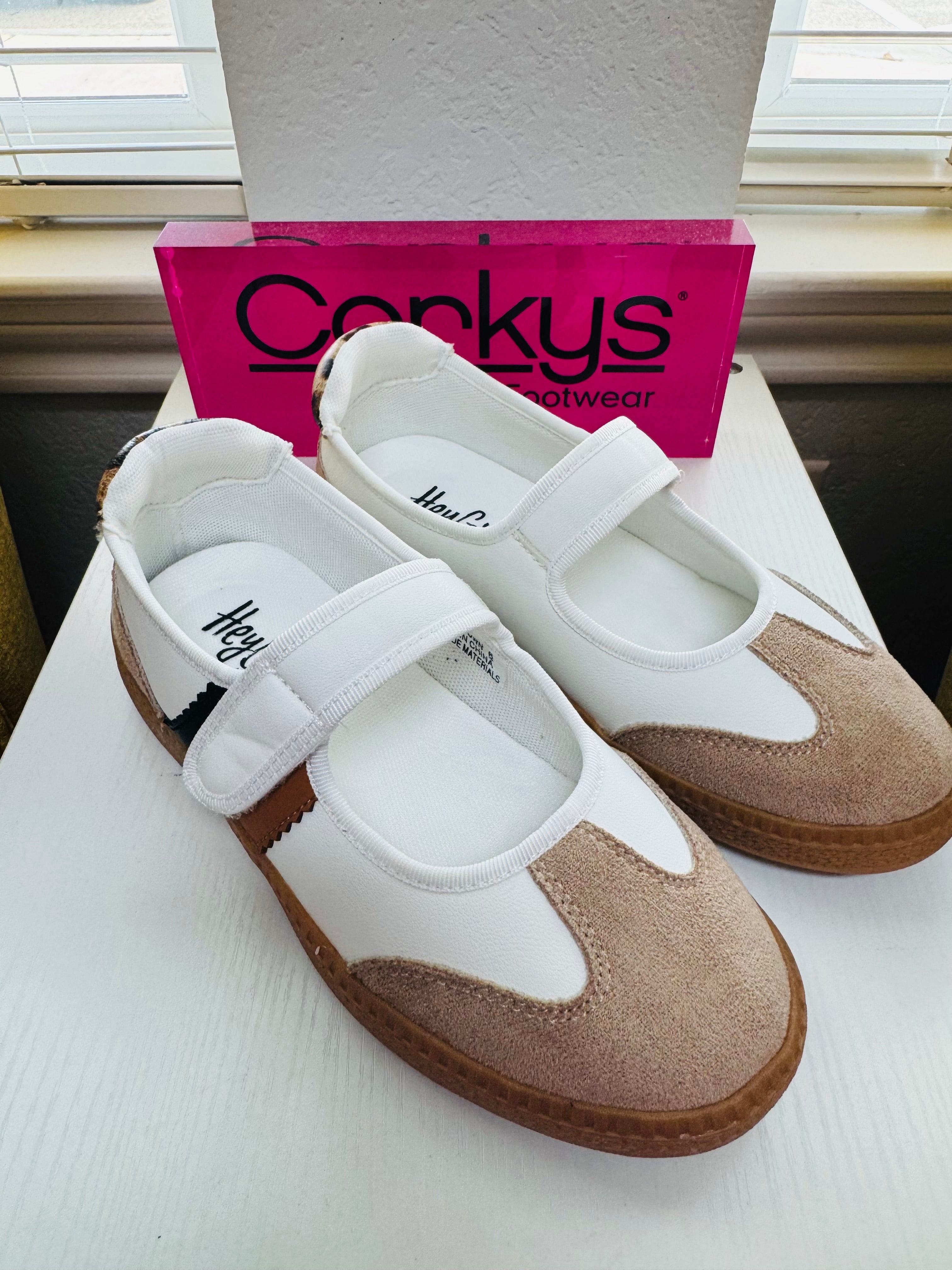 From our best-selling brand Corky’s, known for incredible comfort, the Calm Down Sneakers bring a fun twist to a casual everyday shoe. This Mary Jane-inspired sneaker features a crisp white base with soft sand-toned suede accents and a playful hint of leopard at the heel for a stylish little pop.