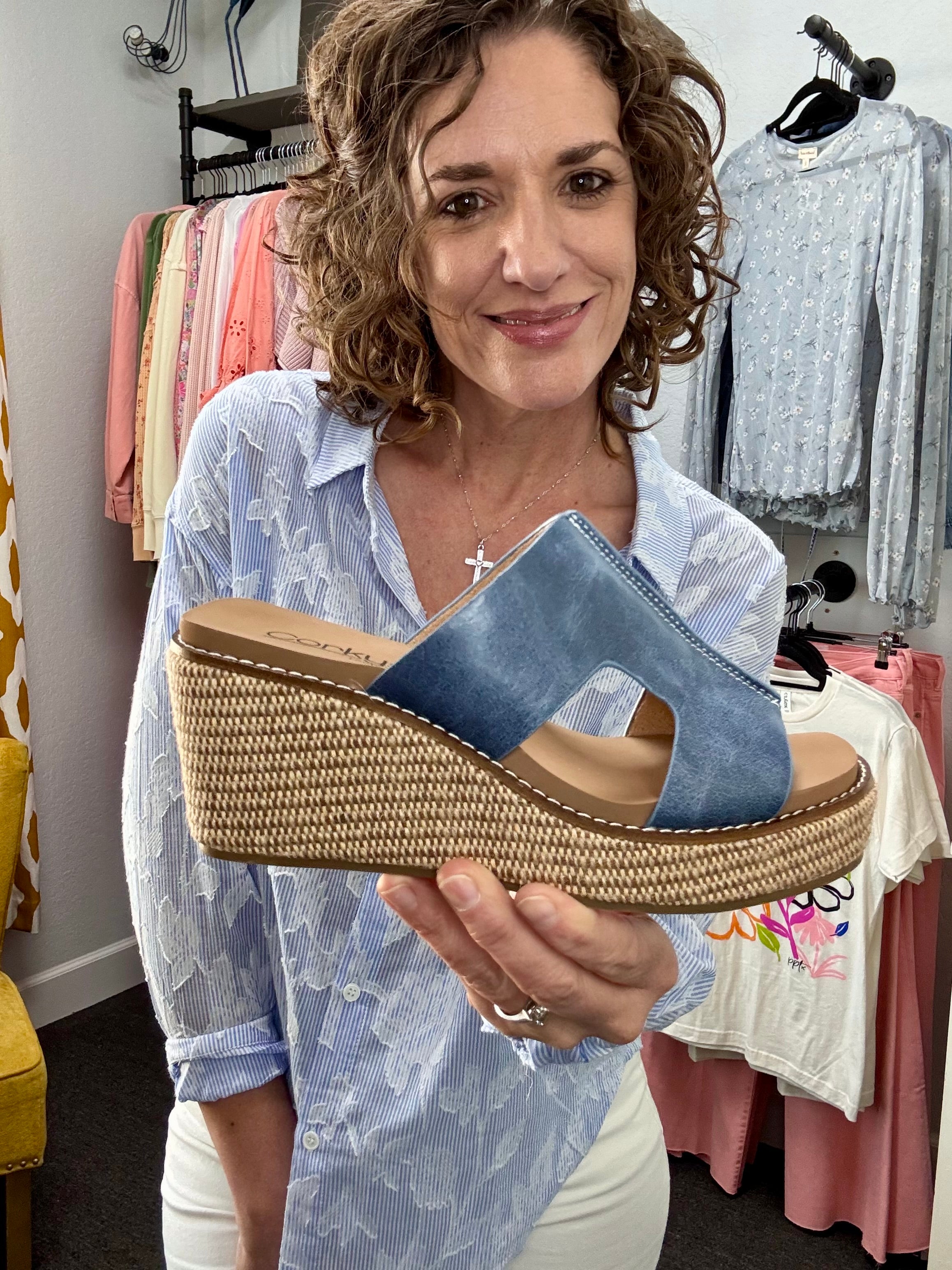 Step into effortless style with the Kiss N Tell Wedges in a stunning ocean blue. Featuring an open-toe, strapless design, these wedges are airy, chic, and perfect for showing off your favorite pedicure.