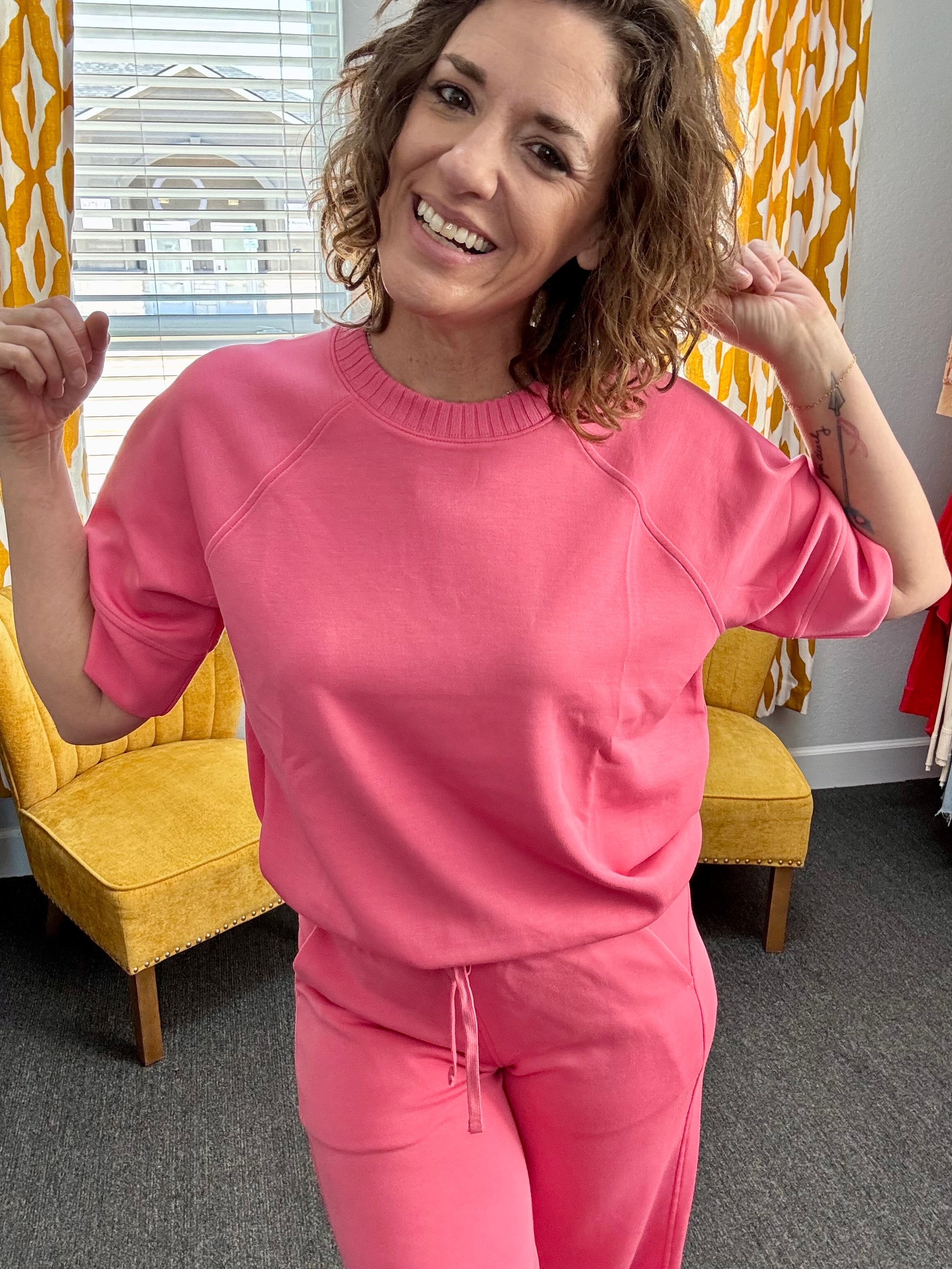 Perfect on its own with denim or styled as a matching set with our Brink Pink Pants. Comfortable, chic, and bold — just the way we like it.