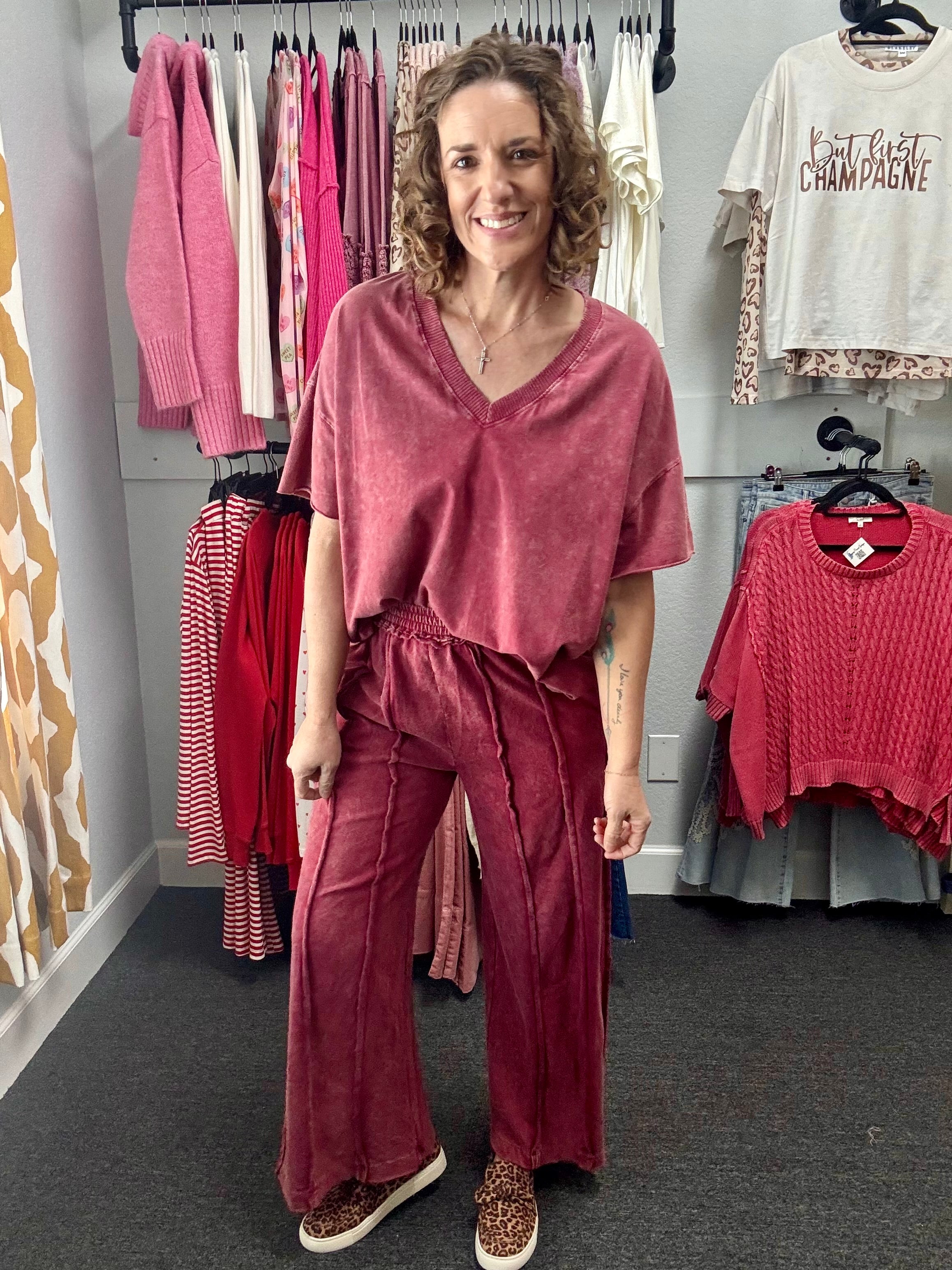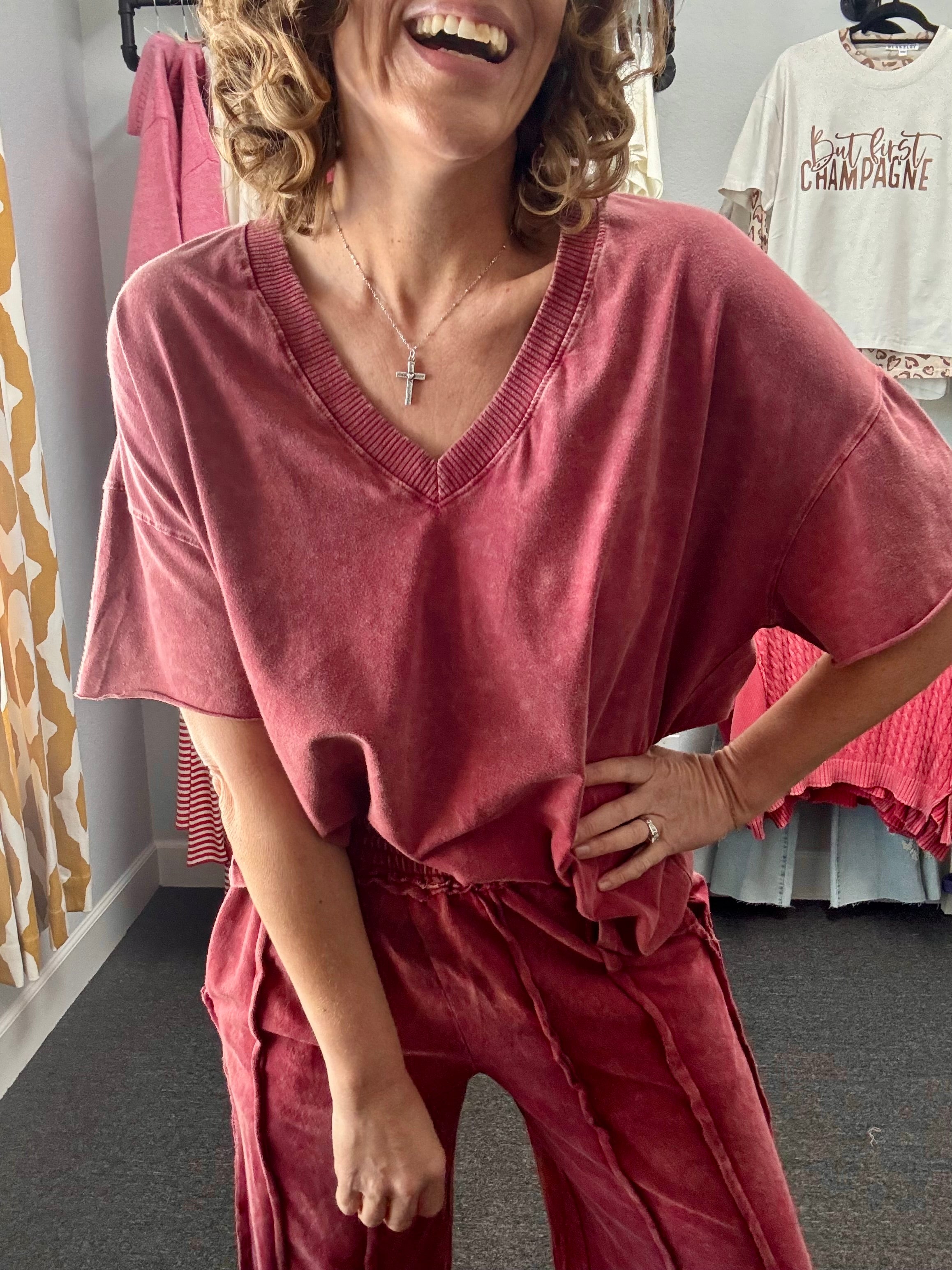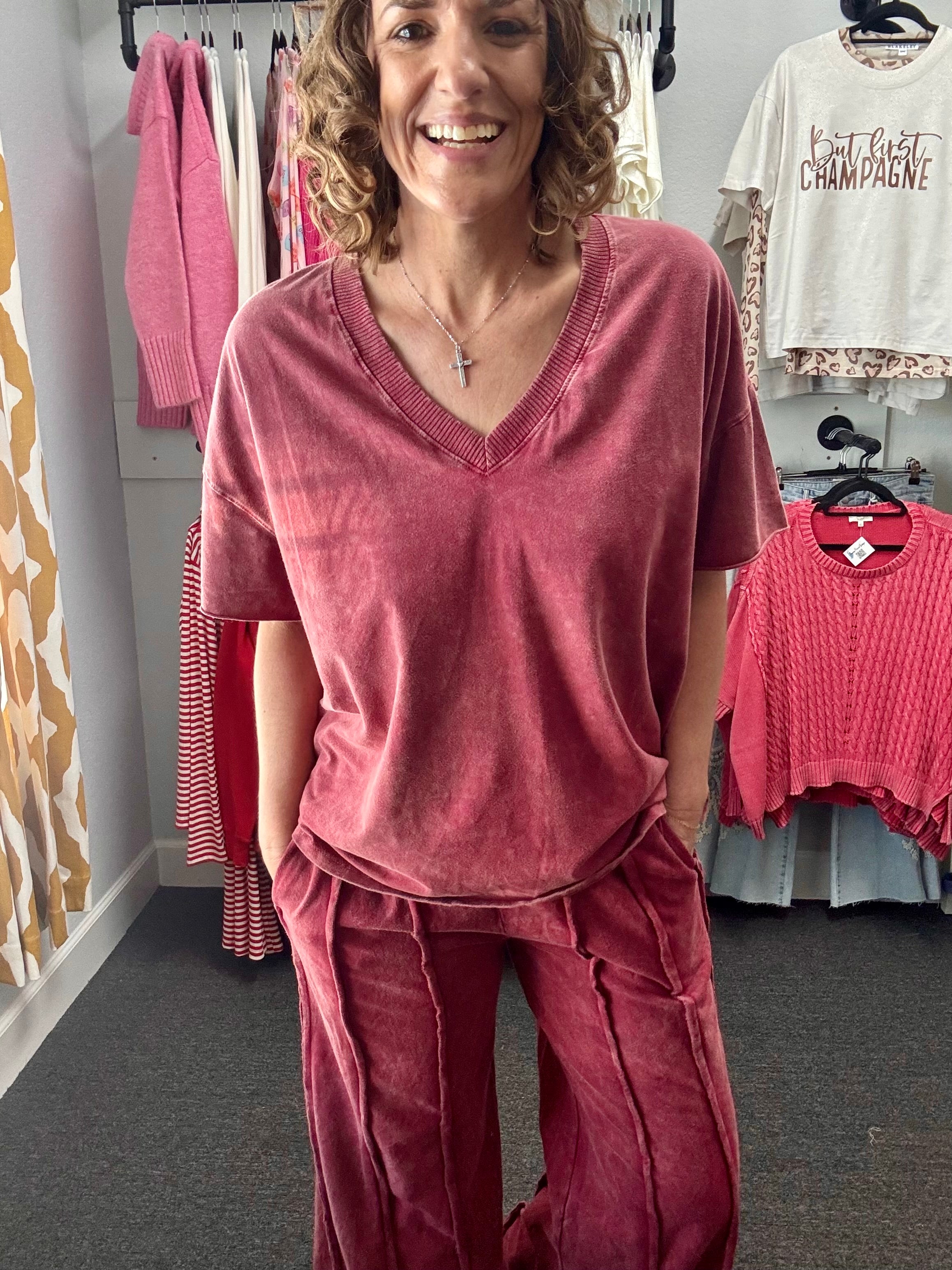 Stay effortlessly comfy and chic in our Burgundy Mineral Wash V-Neck Tee. Soft, lightweight, and designed with a flattering V-neck, this versatile tee is perfect on its own or paired with the matching pants for a coordinated look.