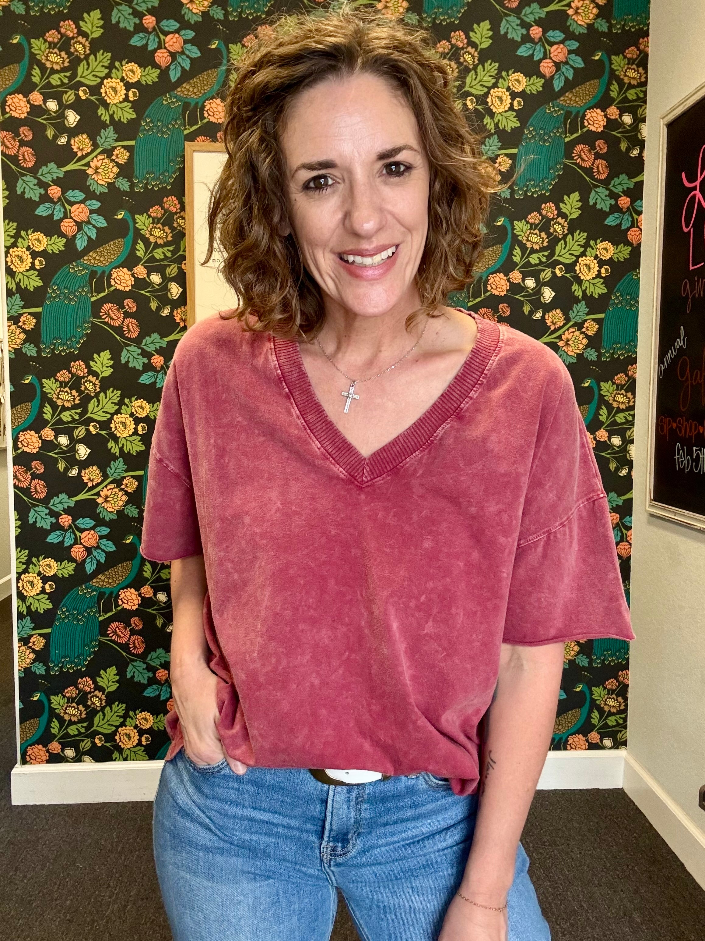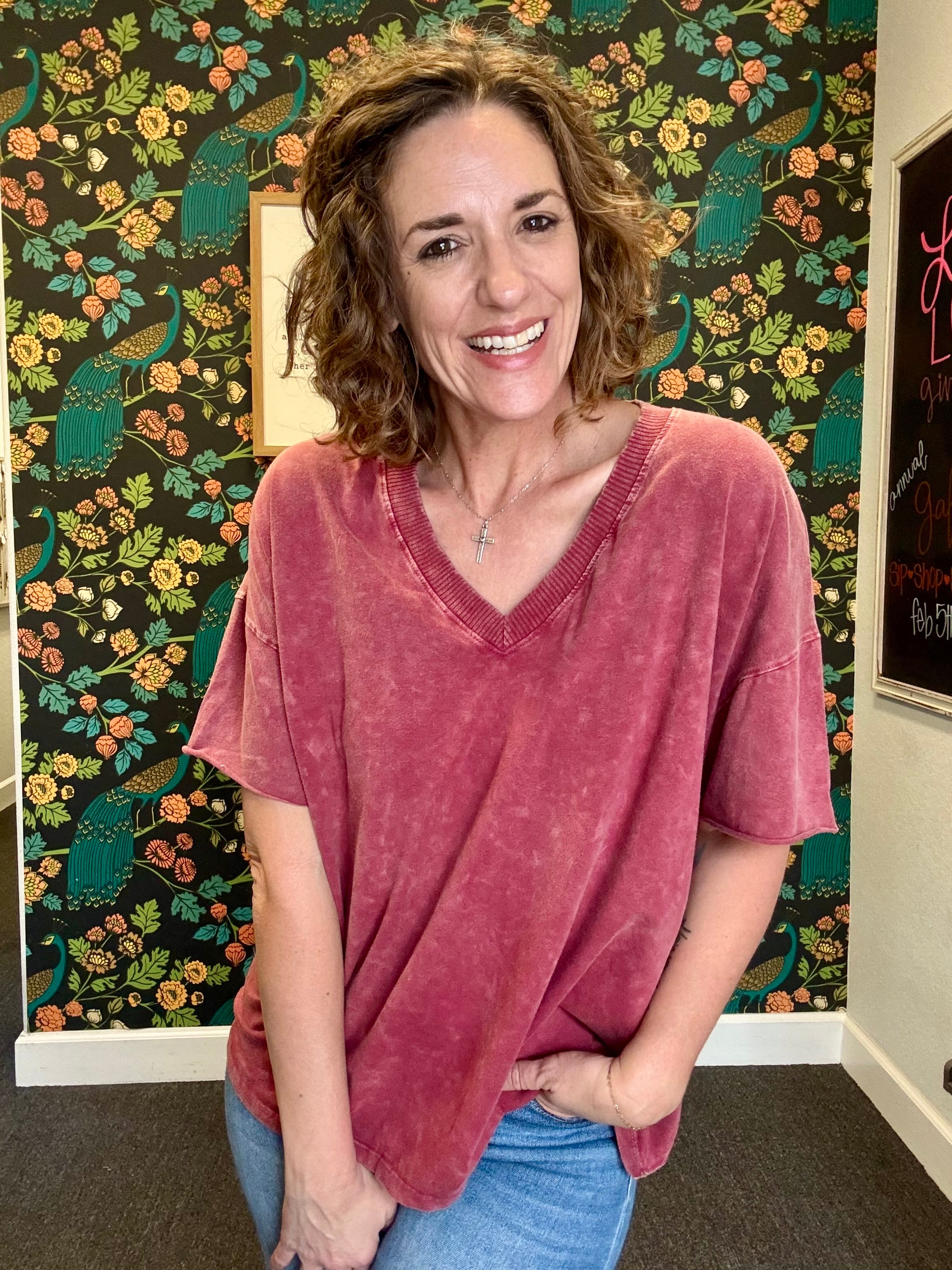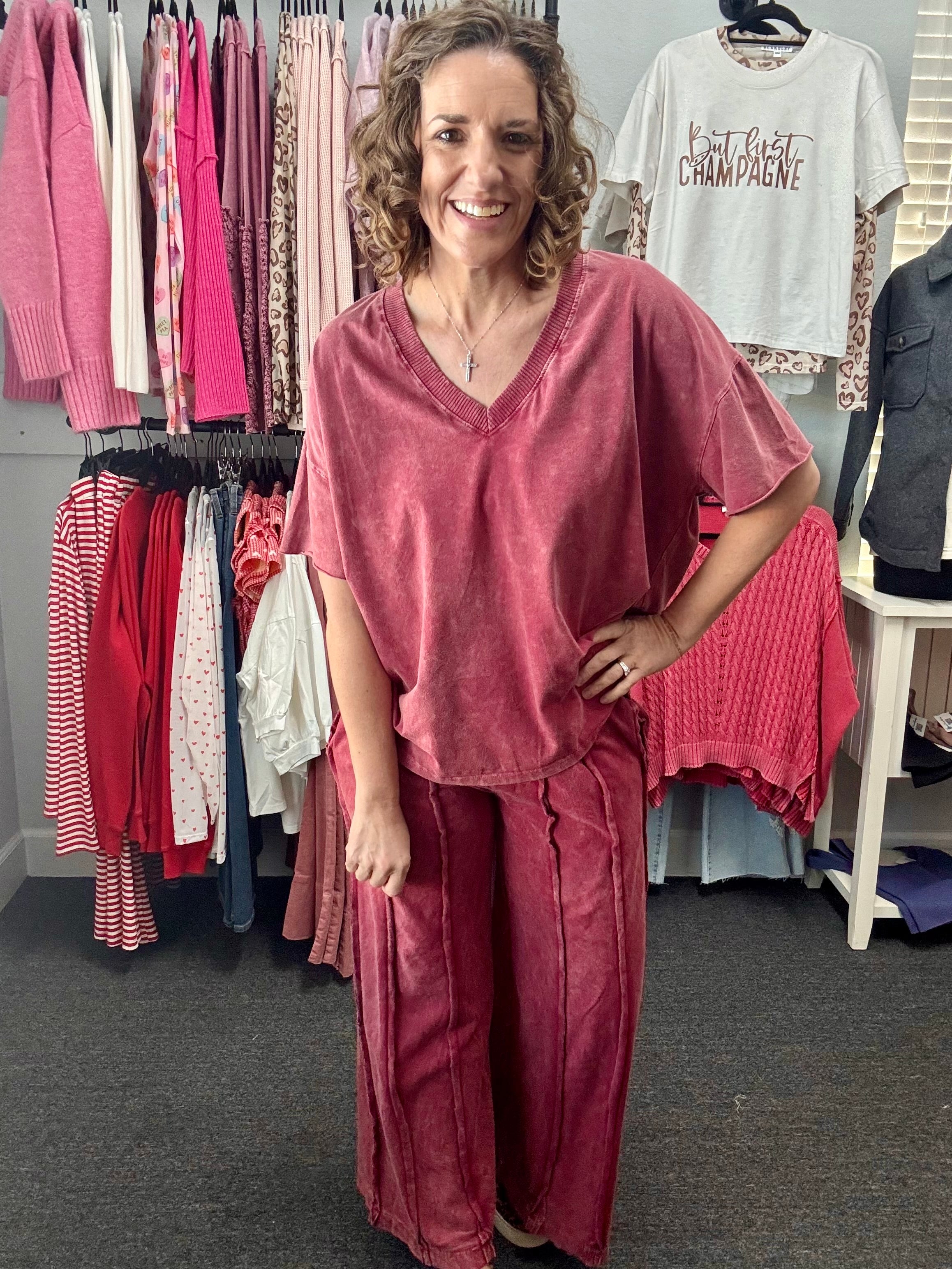 Stay effortlessly comfy and chic in our Burgundy Mineral Wash V-Neck Tee. Soft, lightweight, and designed with a flattering V-neck, this versatile tee is perfect on its own or paired with the matching pants for a coordinated look.
