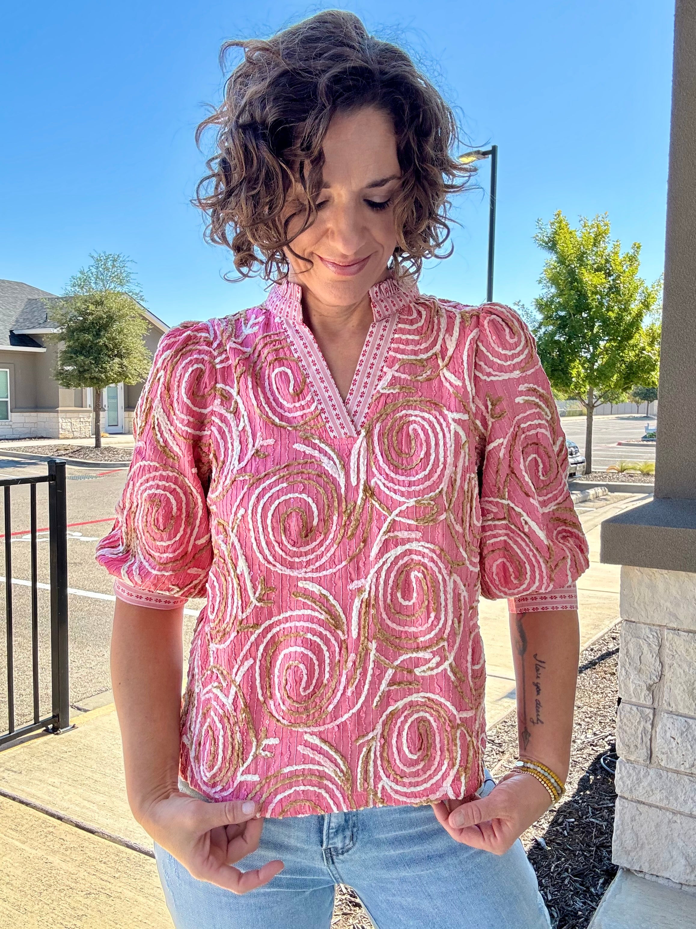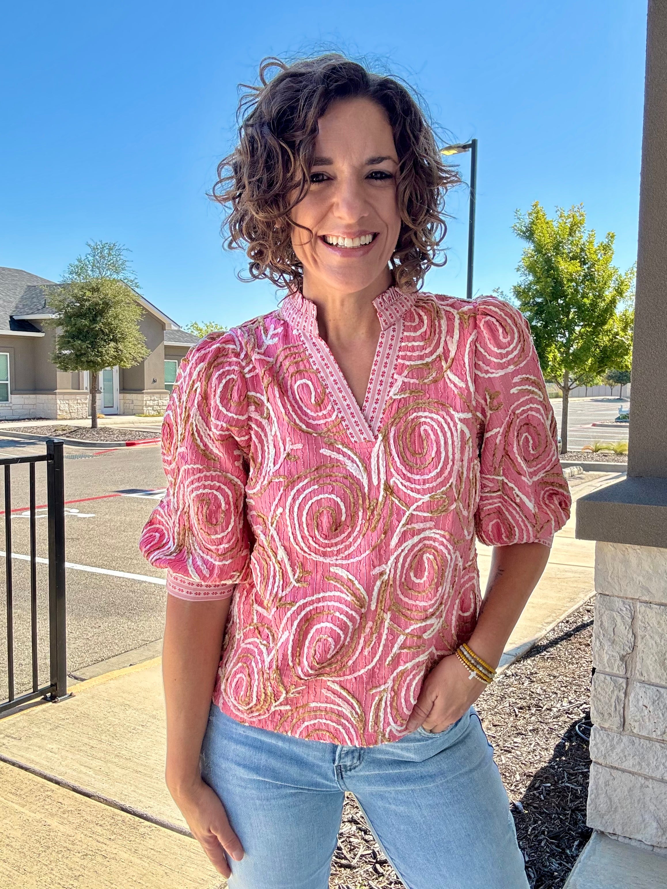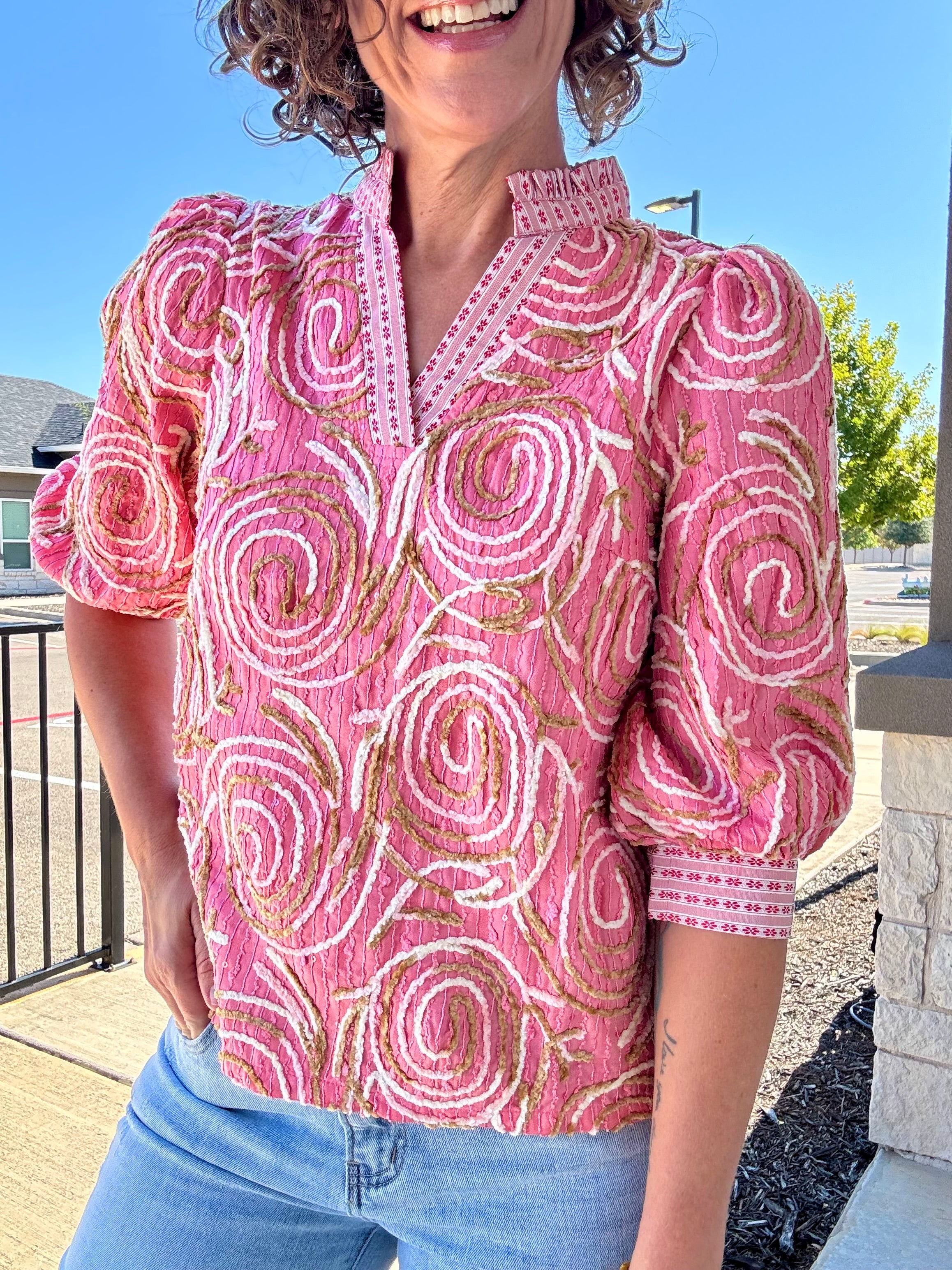 The Pink Sugar Swirl Top is a unique top that features a soft pink base accented with taupe and white chenille swirls, adding texture, dimension, and a touch of whimsy. Playful, stylish, and totally one-of-a-kind — this top is made to stand out.
