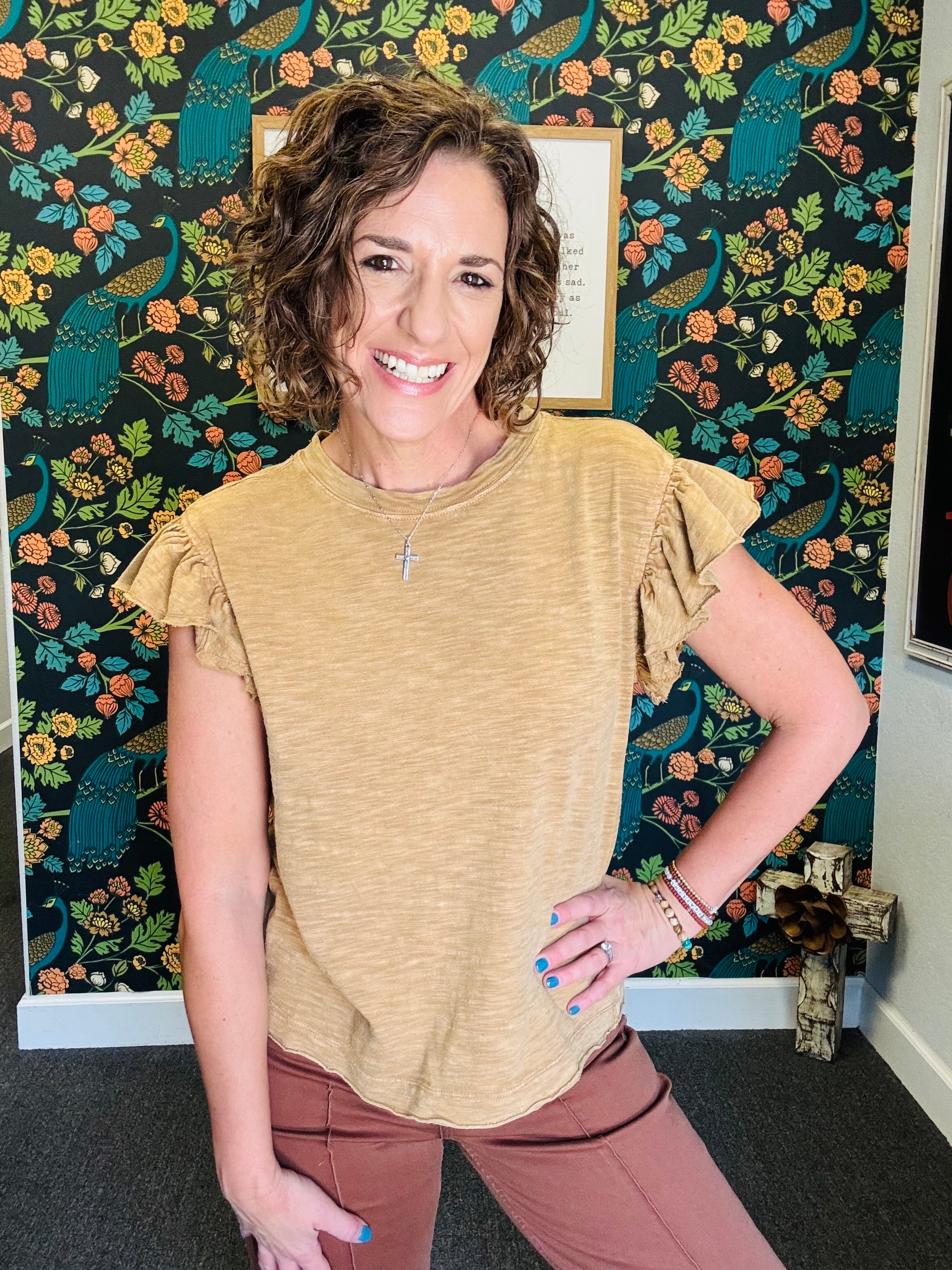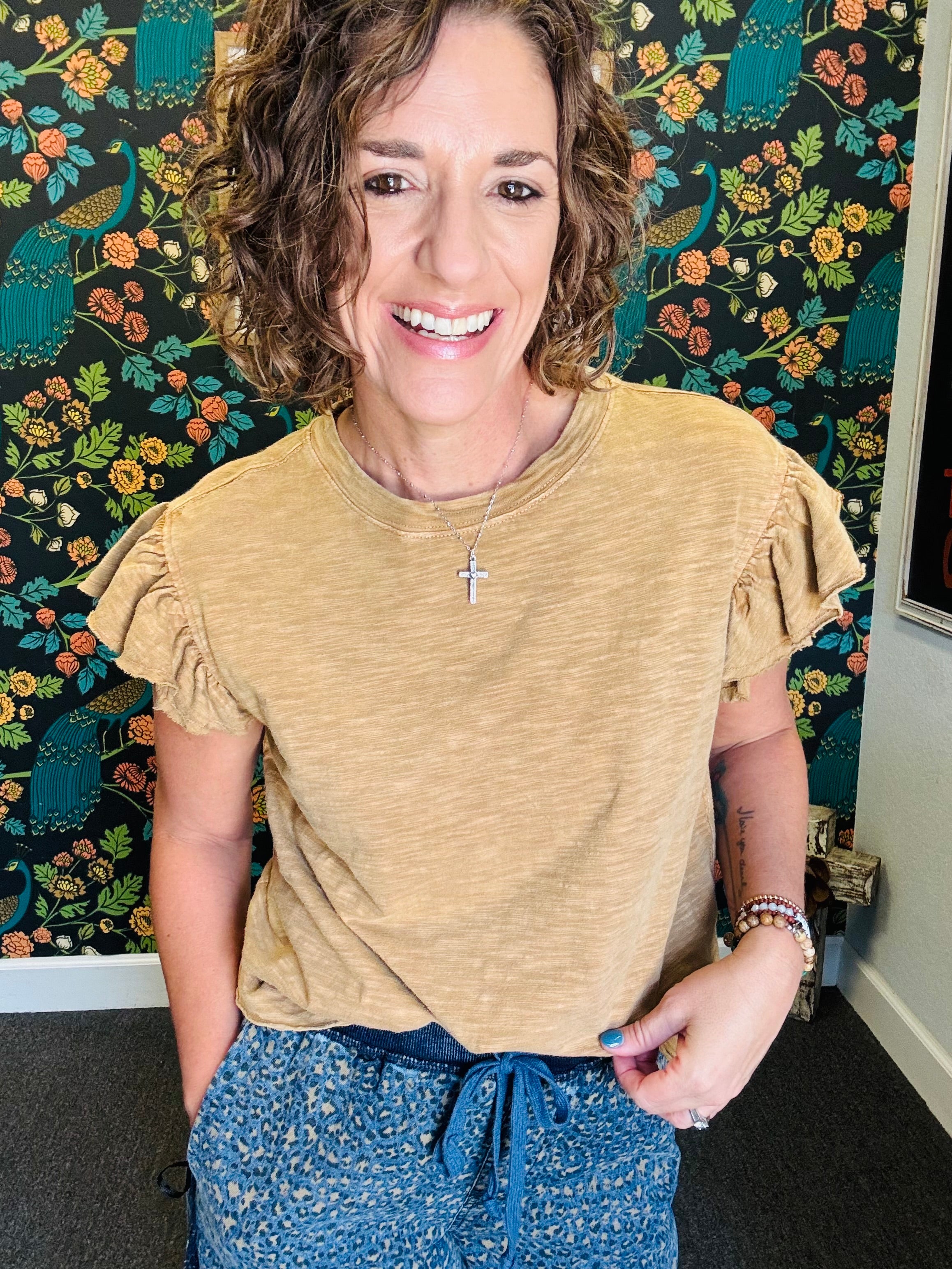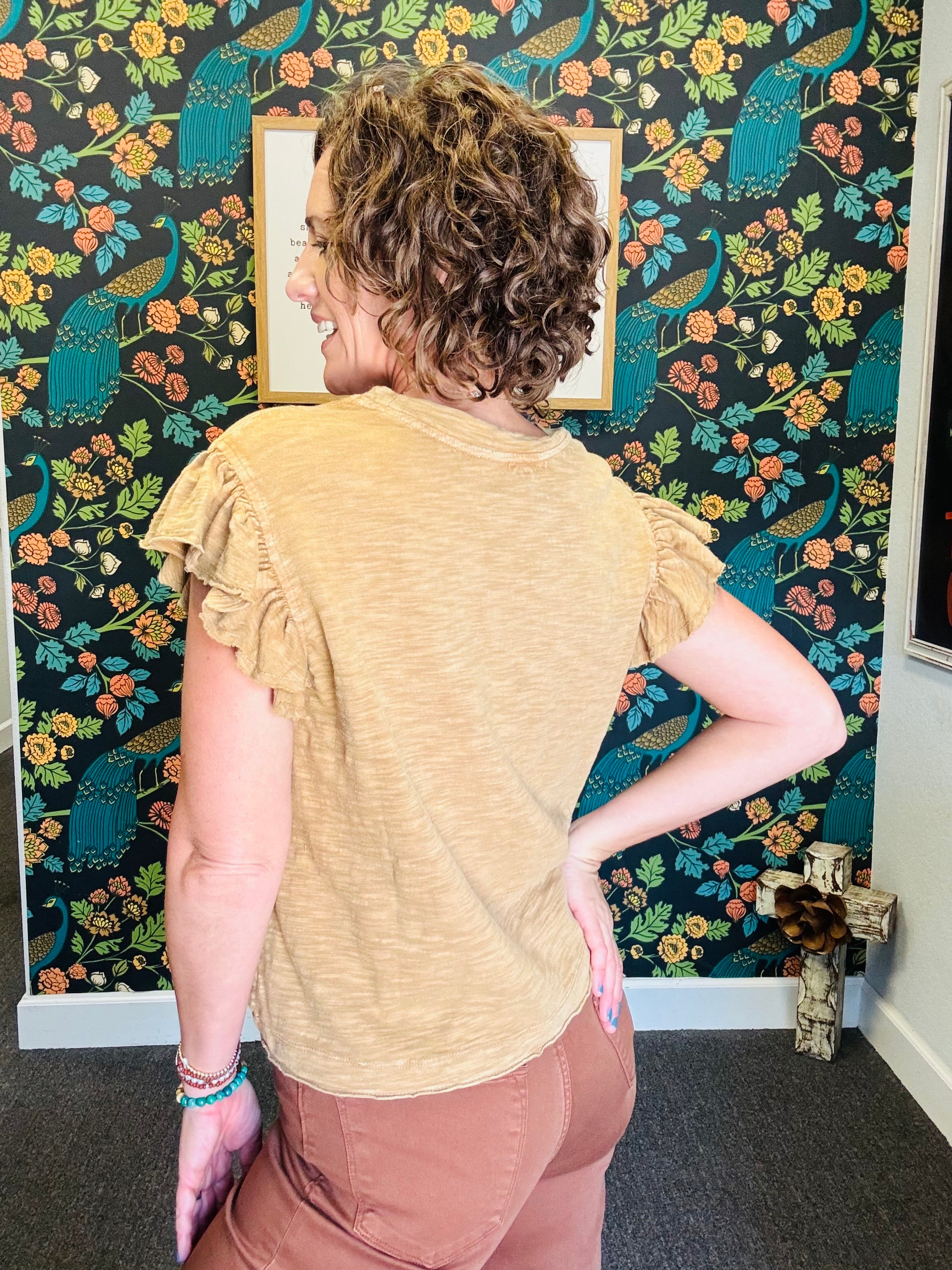 Embrace effortless style with the Vintage Sahara Top, a light camel ruffle sleeveless cotton slub piece that feels as good as it looks. Its mineral-washed finish adds a soft, lived-in vibe perfect for sunny fall days. Pair it with our Denim Animal Pants for a playful, on-trend outfit that’s as comfortable as it is chic.