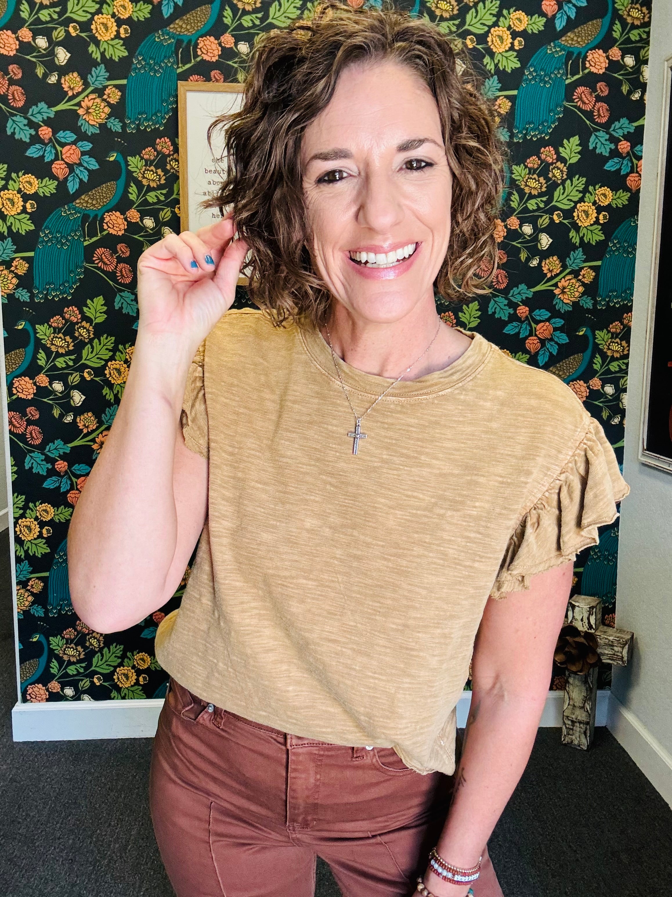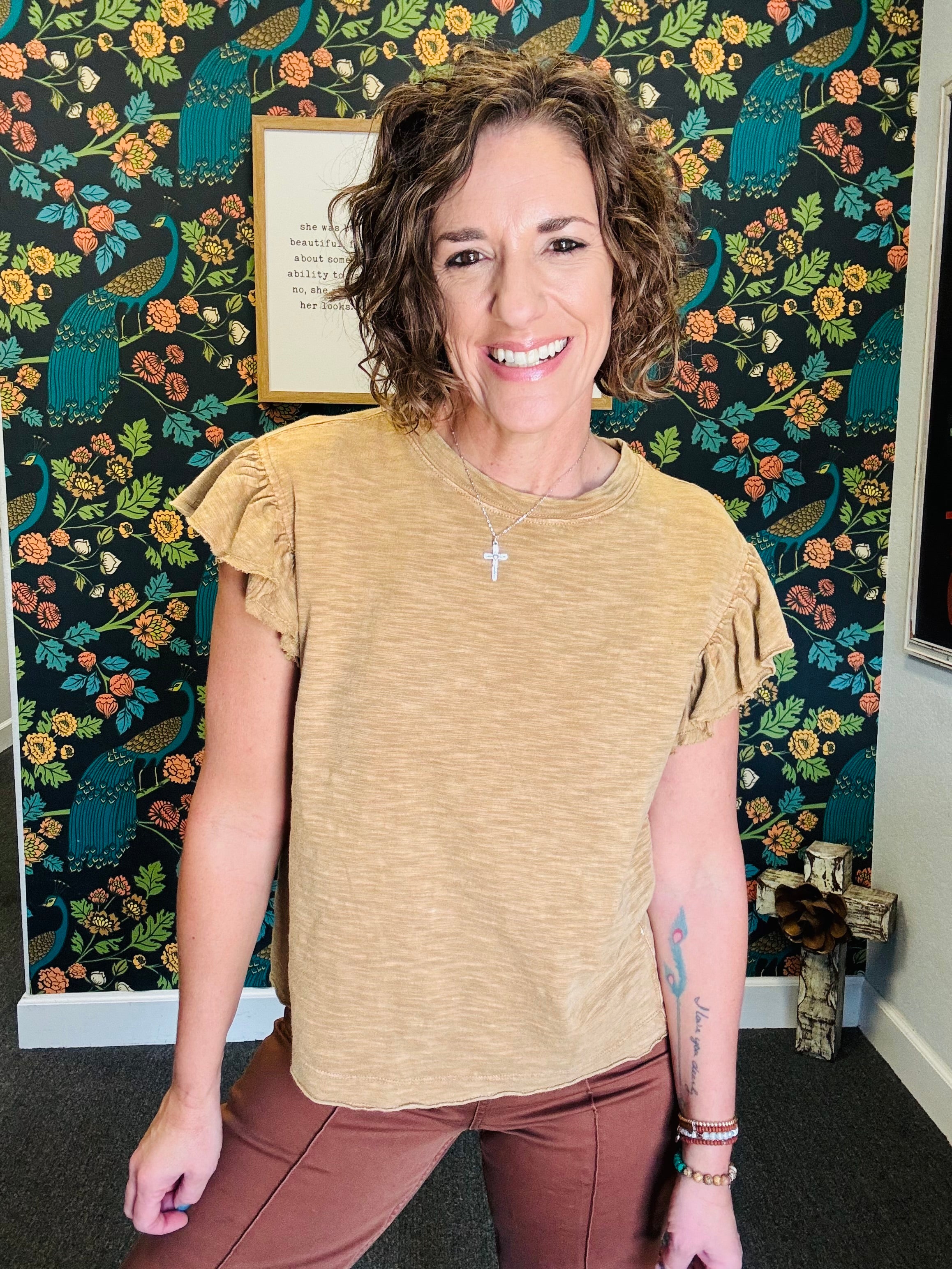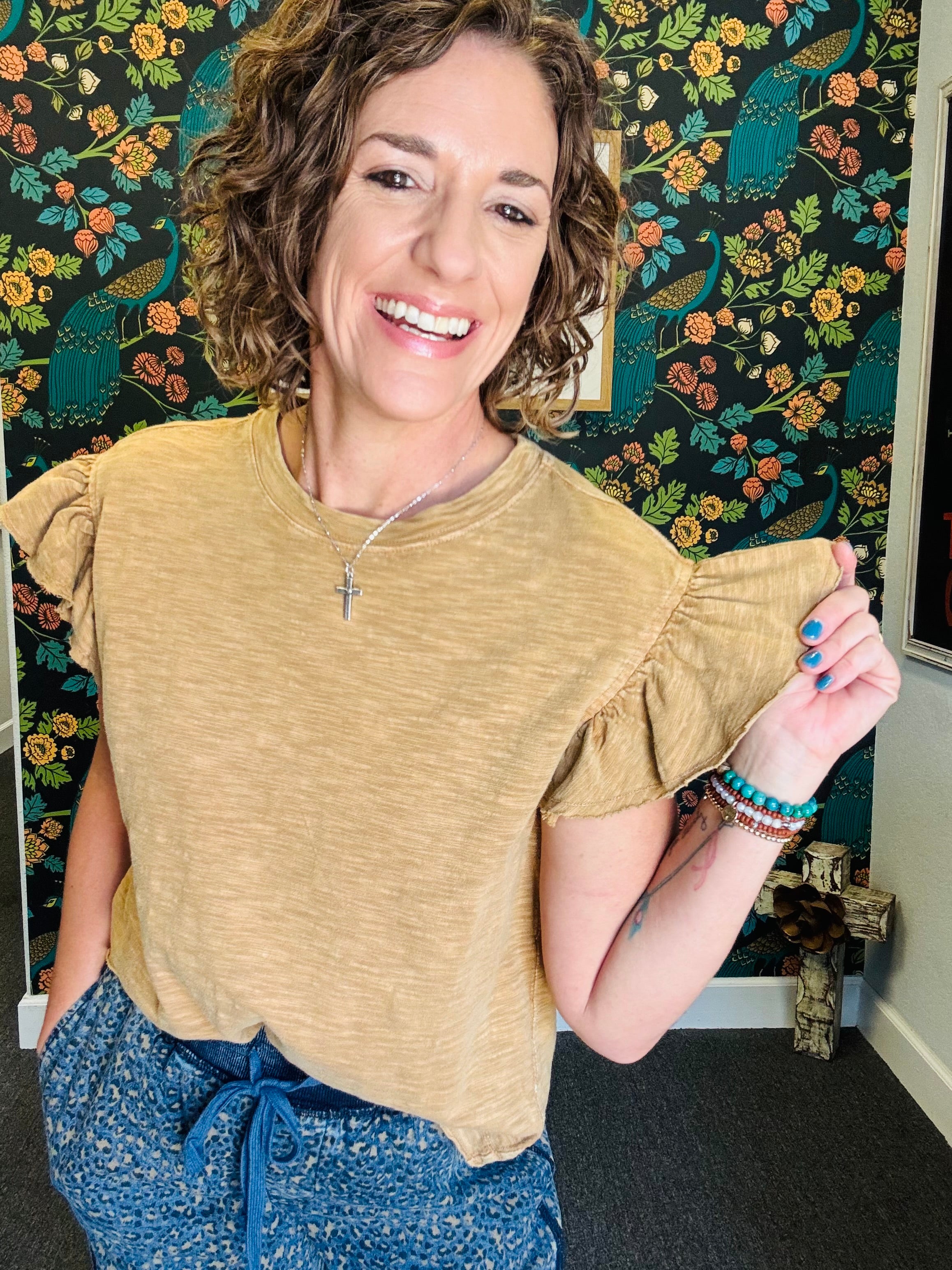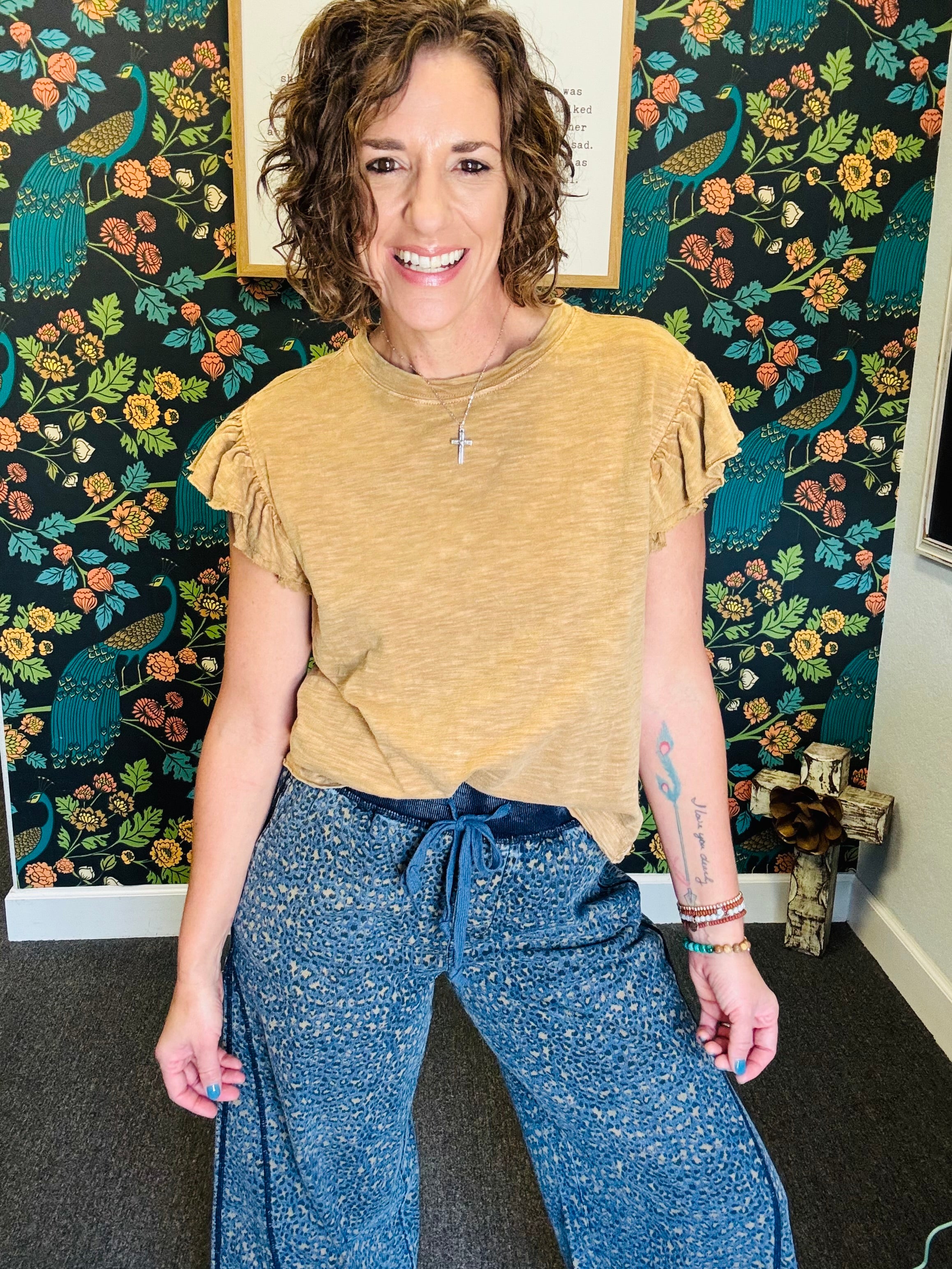 Embrace effortless style with the Vintage Sahara Top, a light camel ruffle sleeveless cotton slub piece that feels as good as it looks. Its mineral-washed finish adds a soft, lived-in vibe perfect for sunny fall days. Pair it with our Denim Animal Pants for a playful, on-trend outfit that’s as comfortable as it is chic.