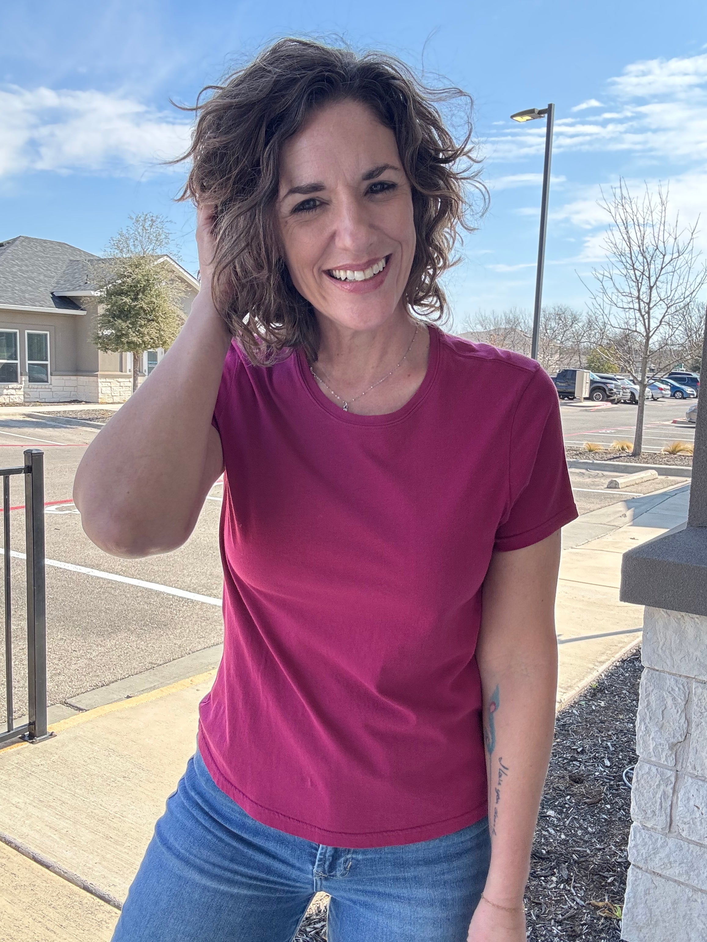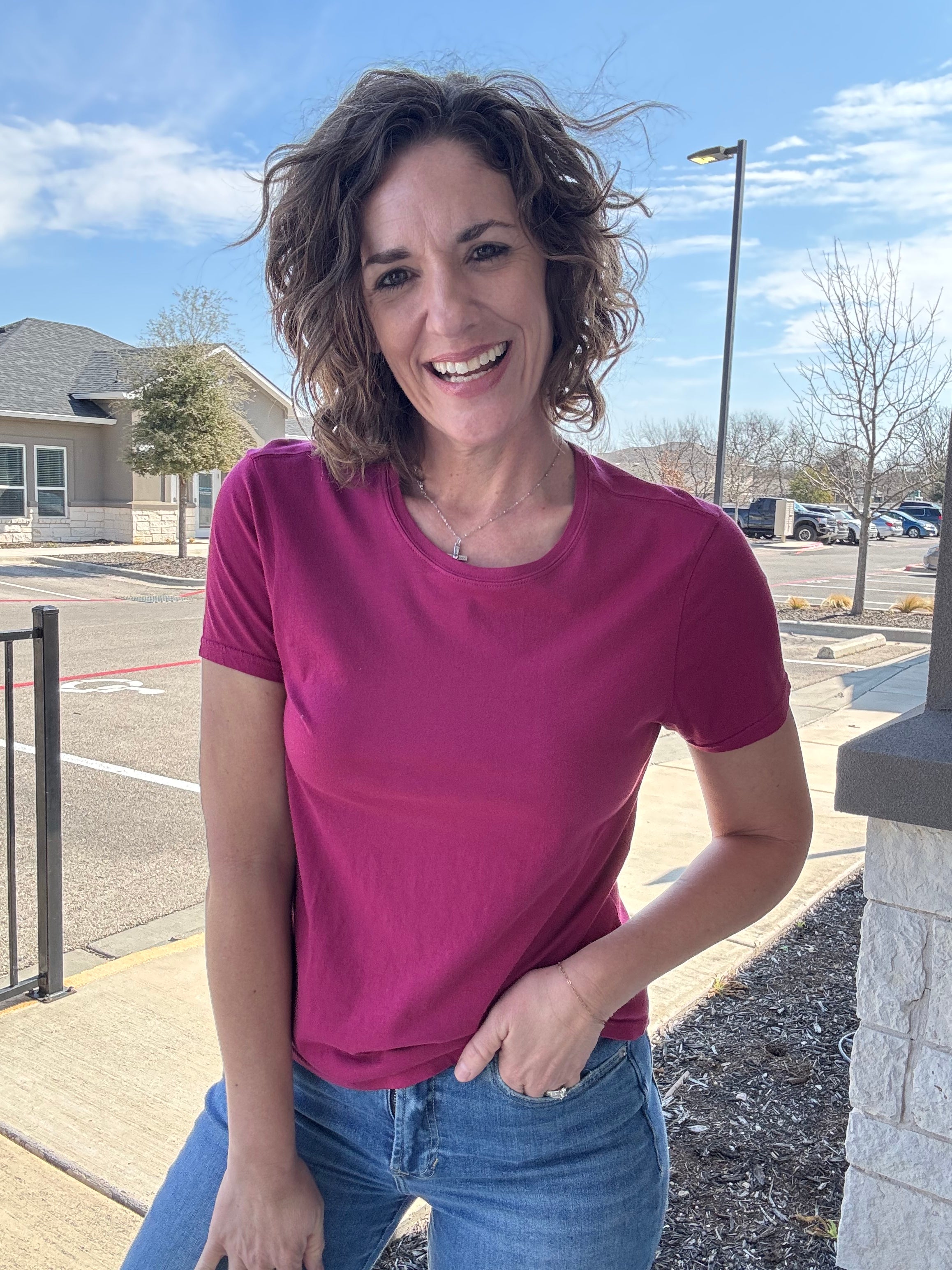 Timeless elegance meets everyday comfort in the Very Berry Unity Tee. Designed with a classic crew neck, short sleeves, and an easy, flattering fit, this tee is crafted from 100% cotton for unbeatable softness and breathability. The rich berry hue adds the perfect pop of color while keeping it effortlessly versatile—ideal for layering or wearing solo, season after season.