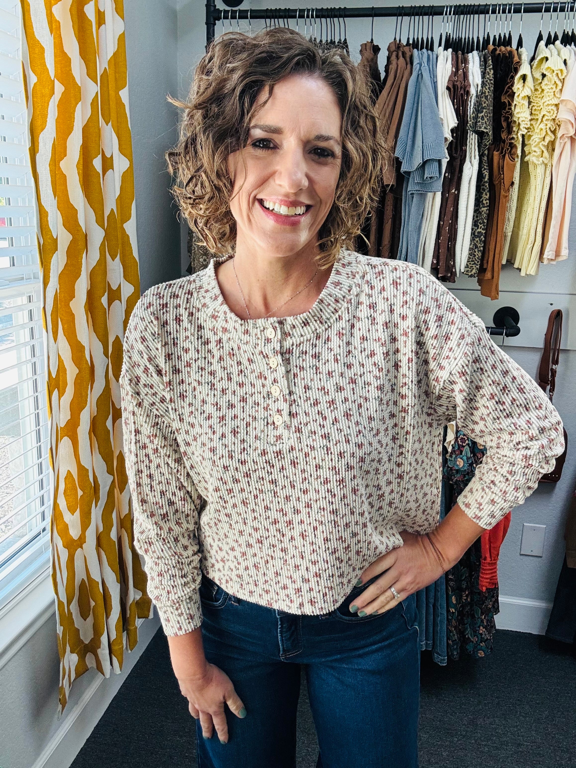 This playful floral henley combines cozy ribbed knit comfort with a touch of garden charm. Its long sleeves and classic henley buttons make it perfect for layering or wearing solo on breezy days. Bring a fresh, fun vibe to your everyday look with this versatile top.