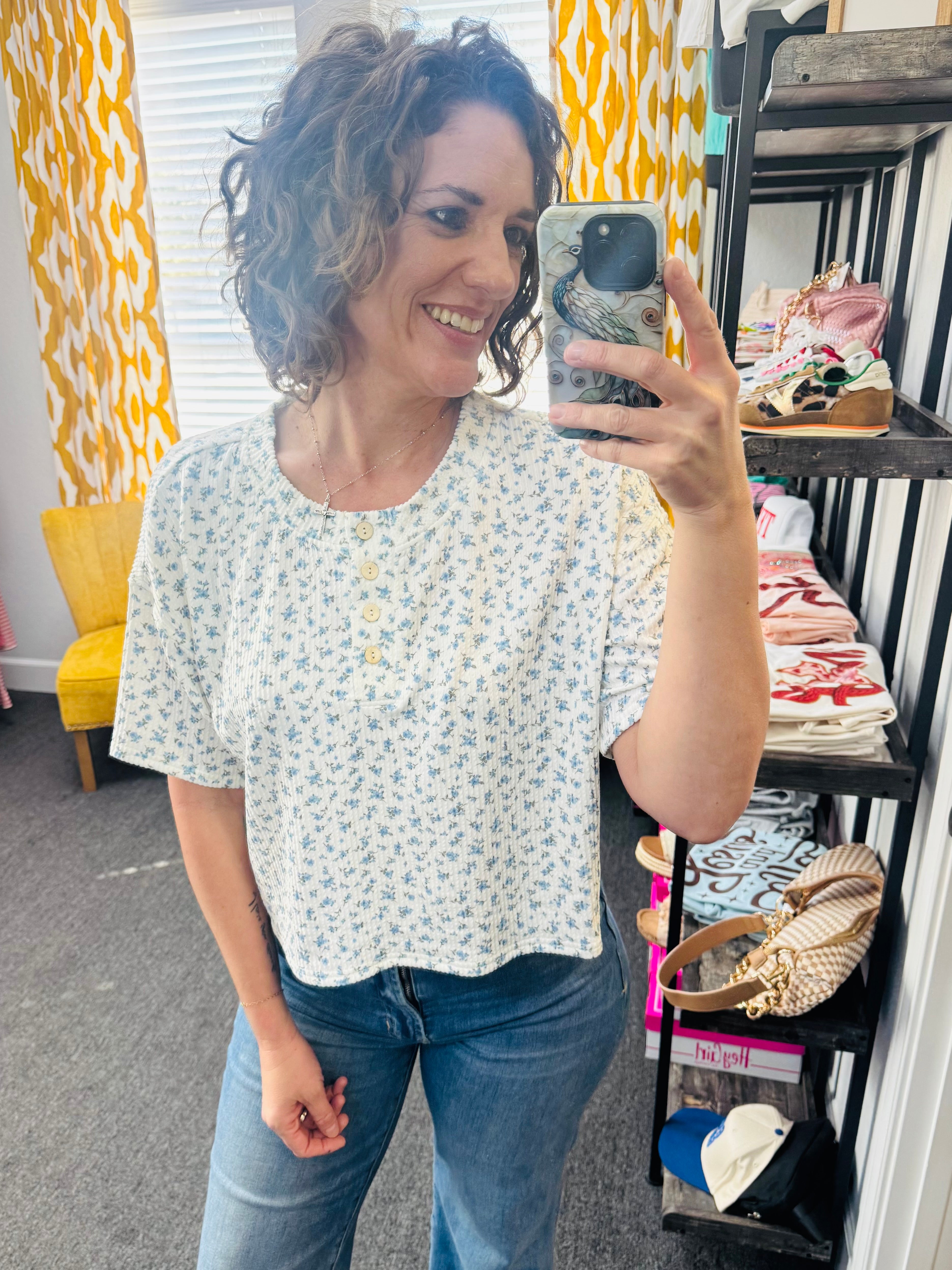Fresh, playful, and effortlessly spring-ready — the Blue Blossom Henley is the perfect lightweight top for your everyday wardrobe. This slightly cropped white henley is dotted with delicate mini blue flowers all over, giving it a sweet, feminine vibe that pairs beautifully with everything from denim to our Ocean Mist Pants. Featuring short sleeves and a classic henley neckline, it offers an easy, relaxed fit that’s perfect for layering or wearing solo. Affordable, versatile, and full of charm, the Blue Blossom Henley is a go-to top for casual days, coffee runs, or breezy spring mornings.